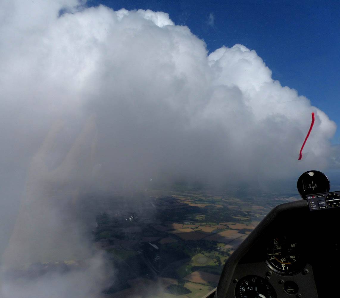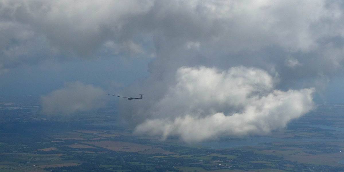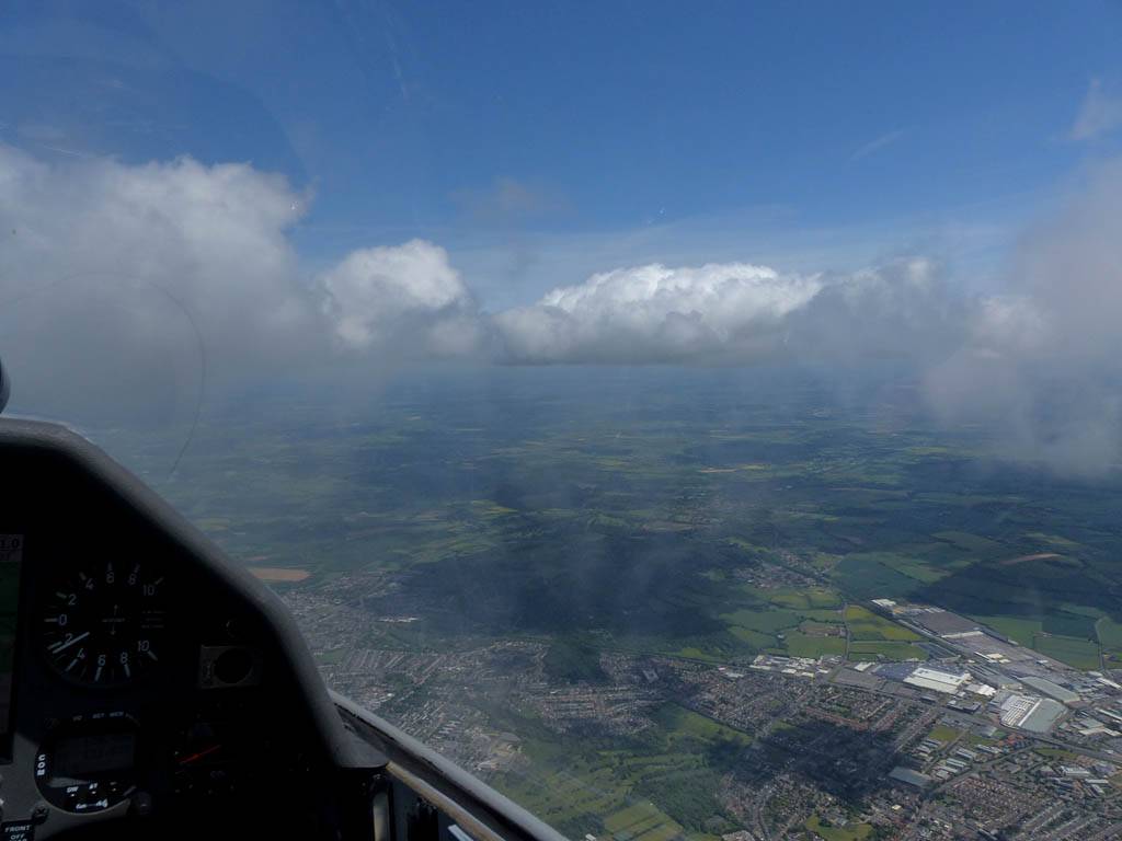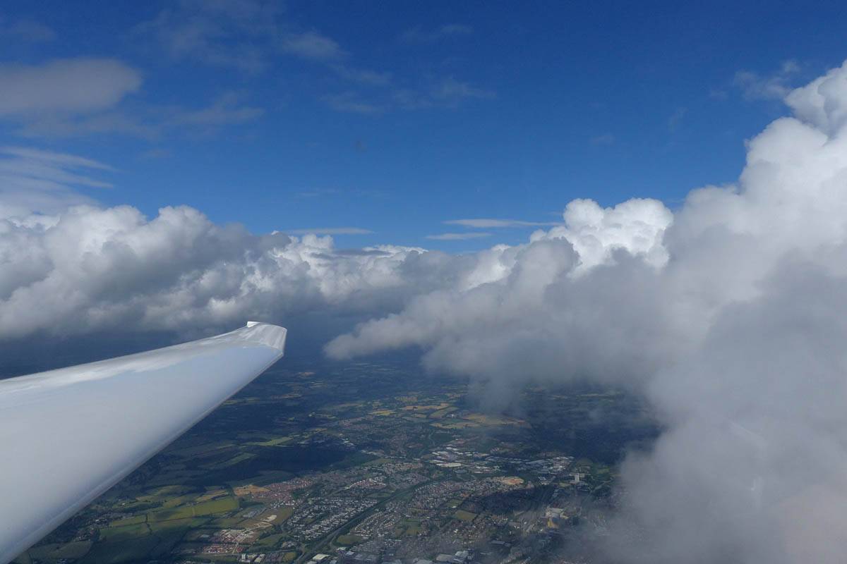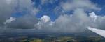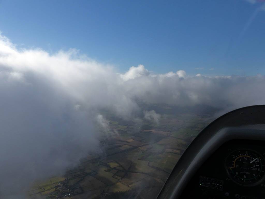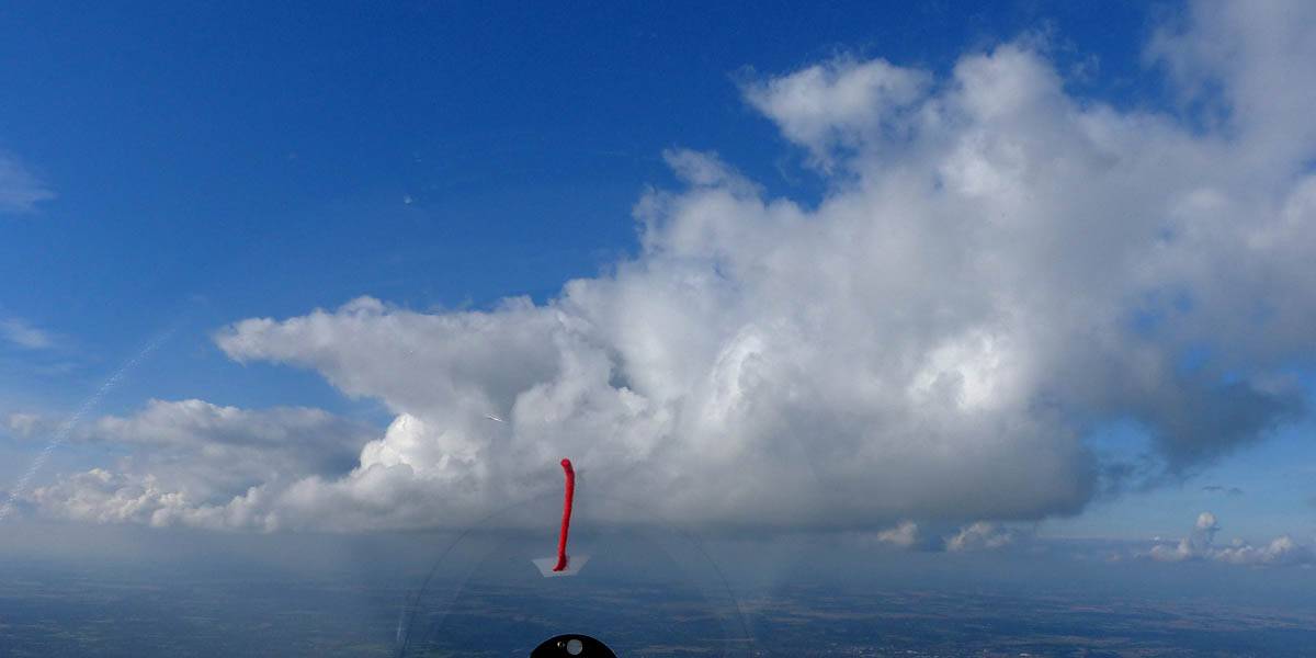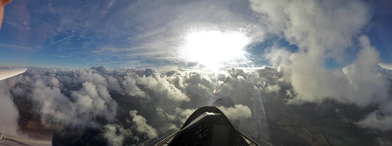 Catching some irridescence in a cumulus cloud by the airfield as I briefly play in patchy lift next to it. | Back on the ground looking at showers forming to the South. | In the queue for winch launch 2. | The mounted GoPro makes pictures during winch launch possible! | Views over cumulus to the North of the airfield. |