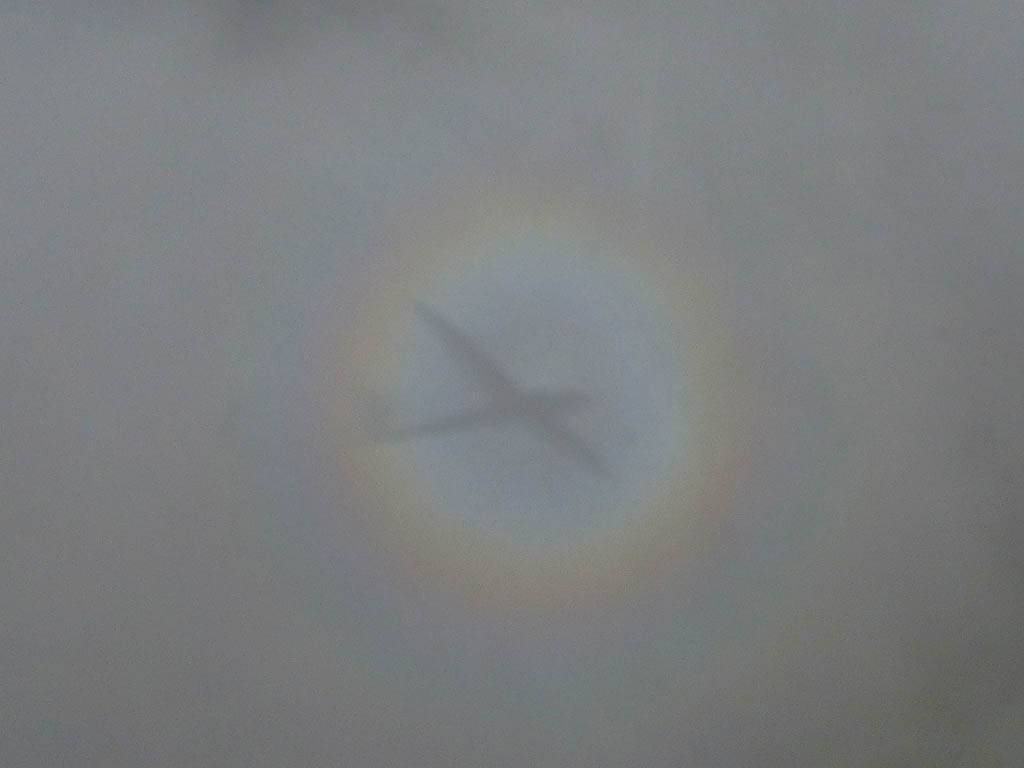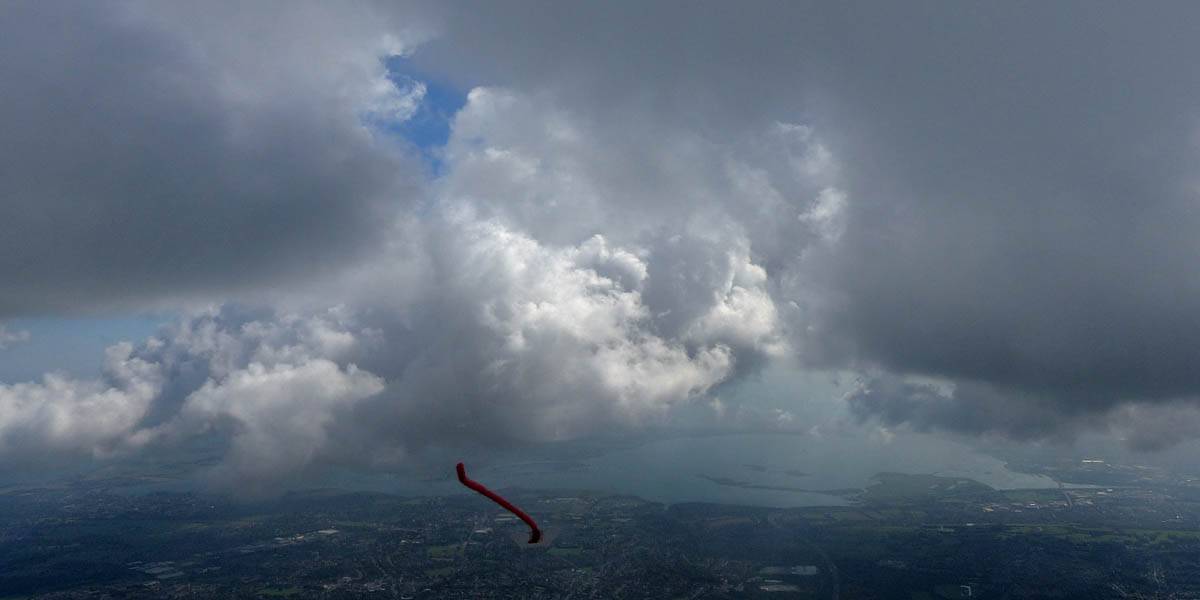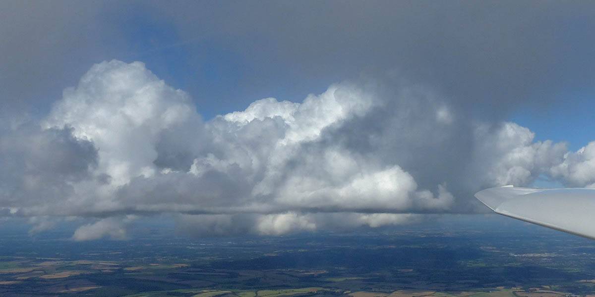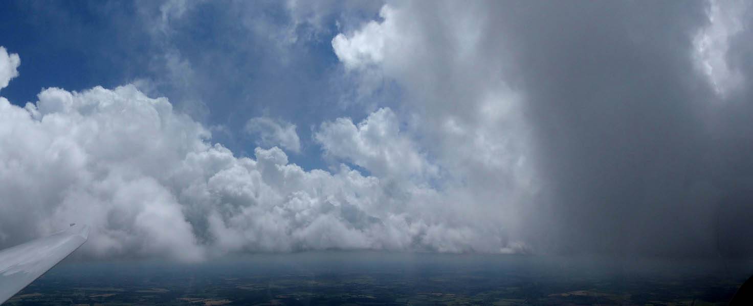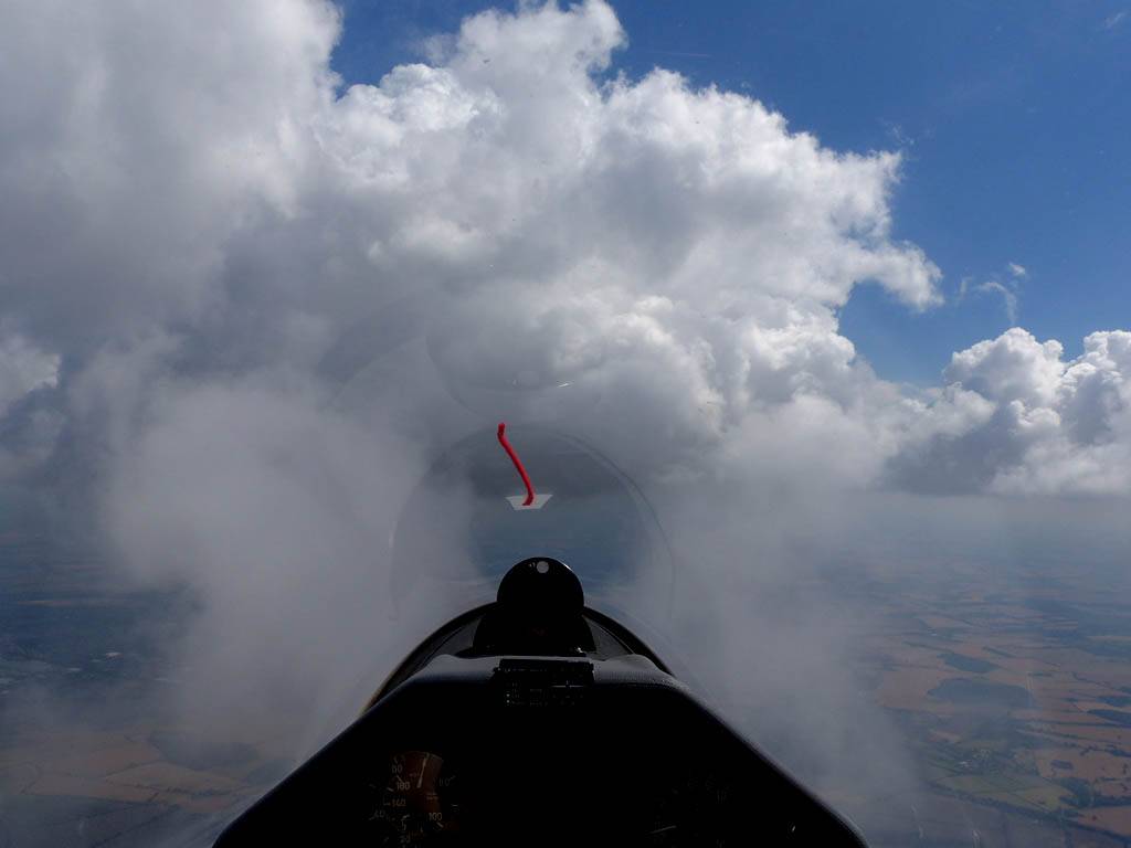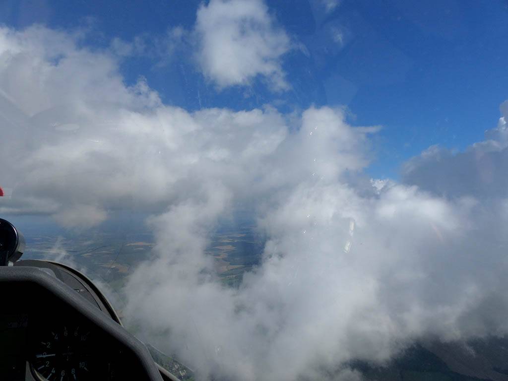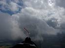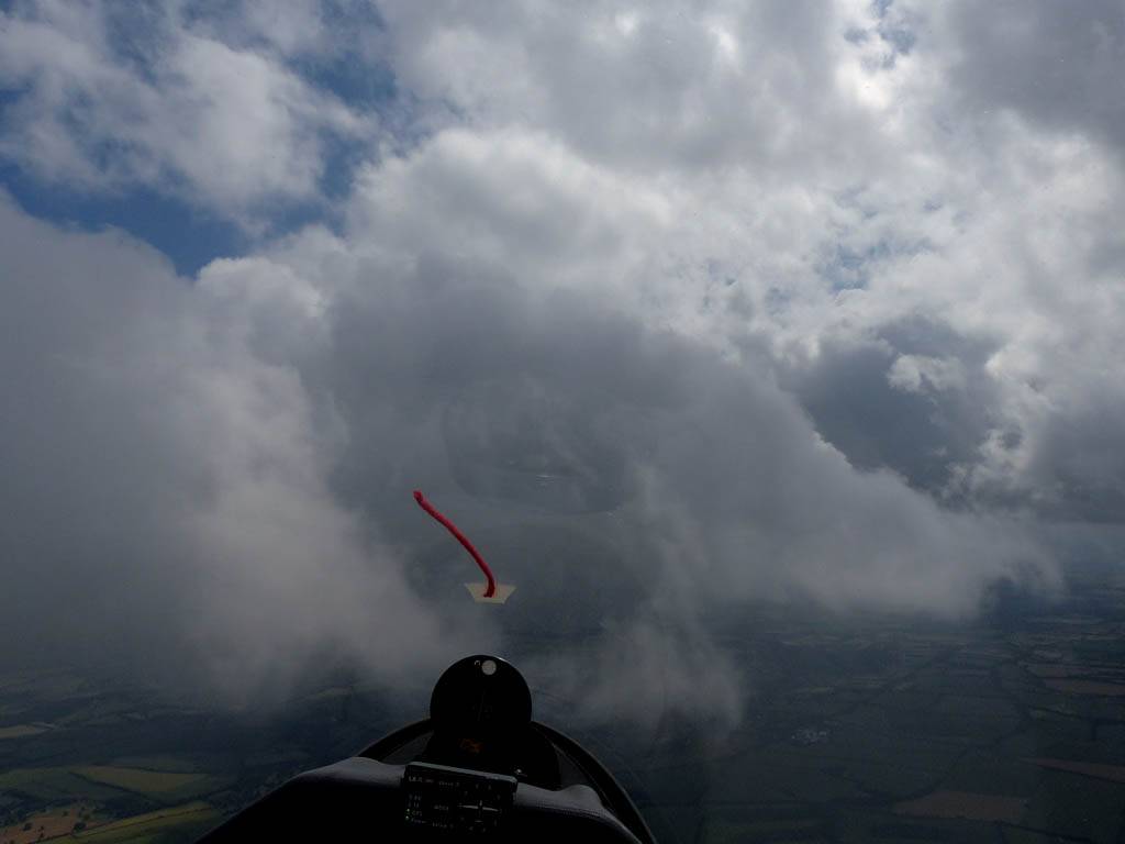 Catching some irridescence in a cumulus cloud by the airfield as I briefly play in patchy lift next to it. | Back on the ground looking at showers forming to the South. | In the queue for winch launch 2. | The mounted GoPro makes pictures during winch launch possible! | Views over cumulus to the North of the airfield. |