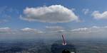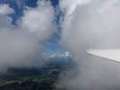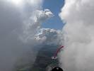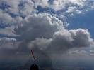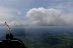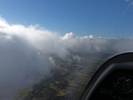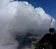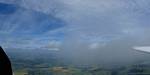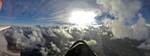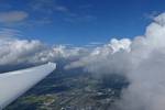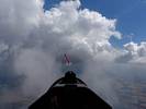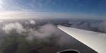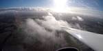 Winch launch 1: Looking across the rolling Hampshire countryside towards some large towering cumulus clouds. | The new GoPro attached to the canopy and recording away. | Even small fluffy clouds make the short flight immensely more interesting. | Me and my GoPro in our first flight together. | Another view Westwards over the low cloud. Basingstoke under the wing. | Looking down through a cumulus at Lasham village. |