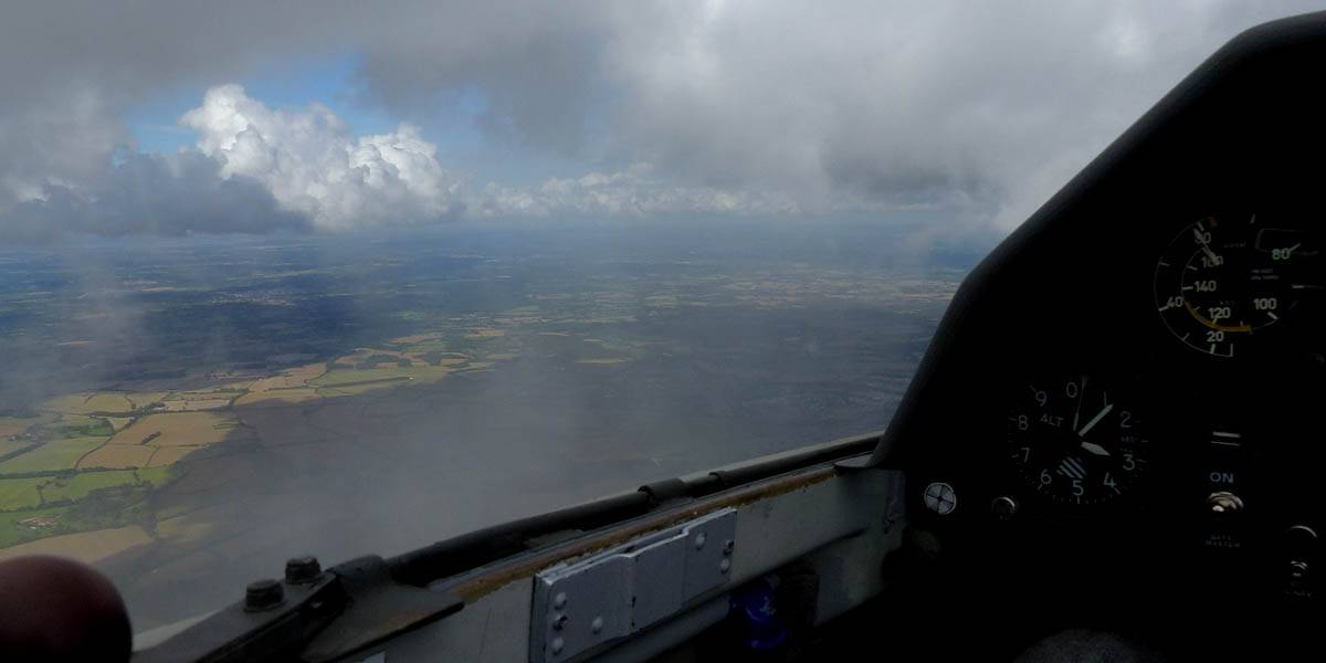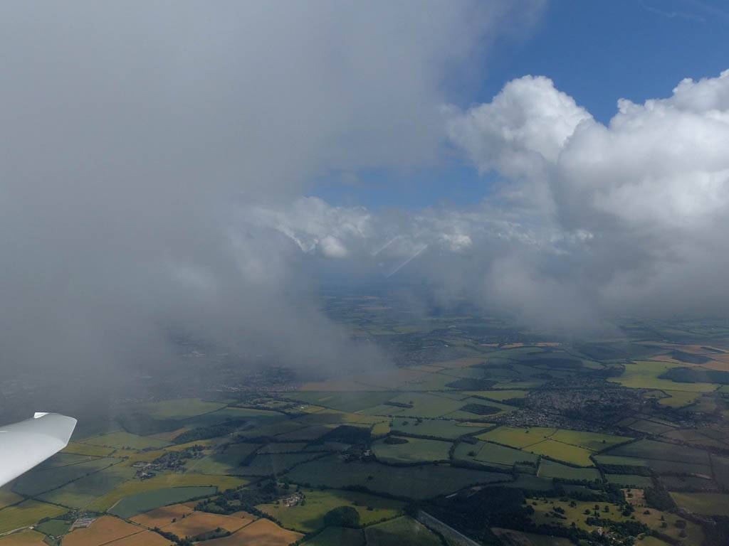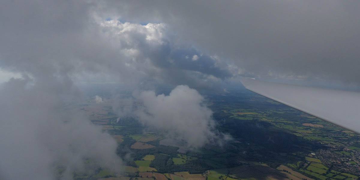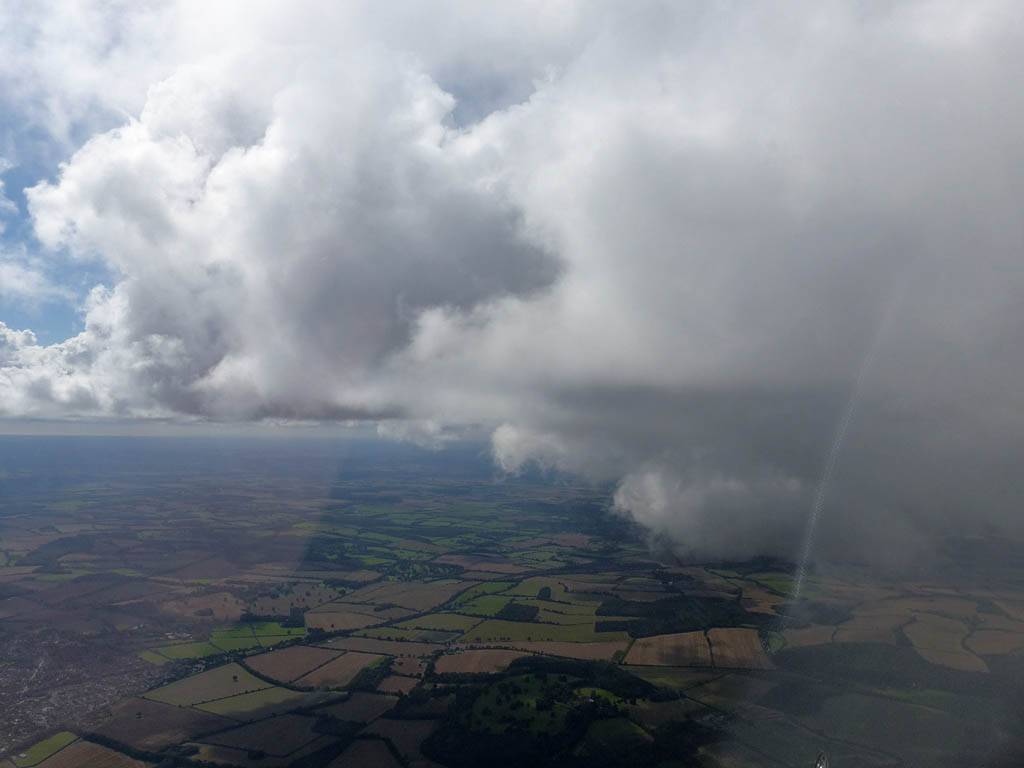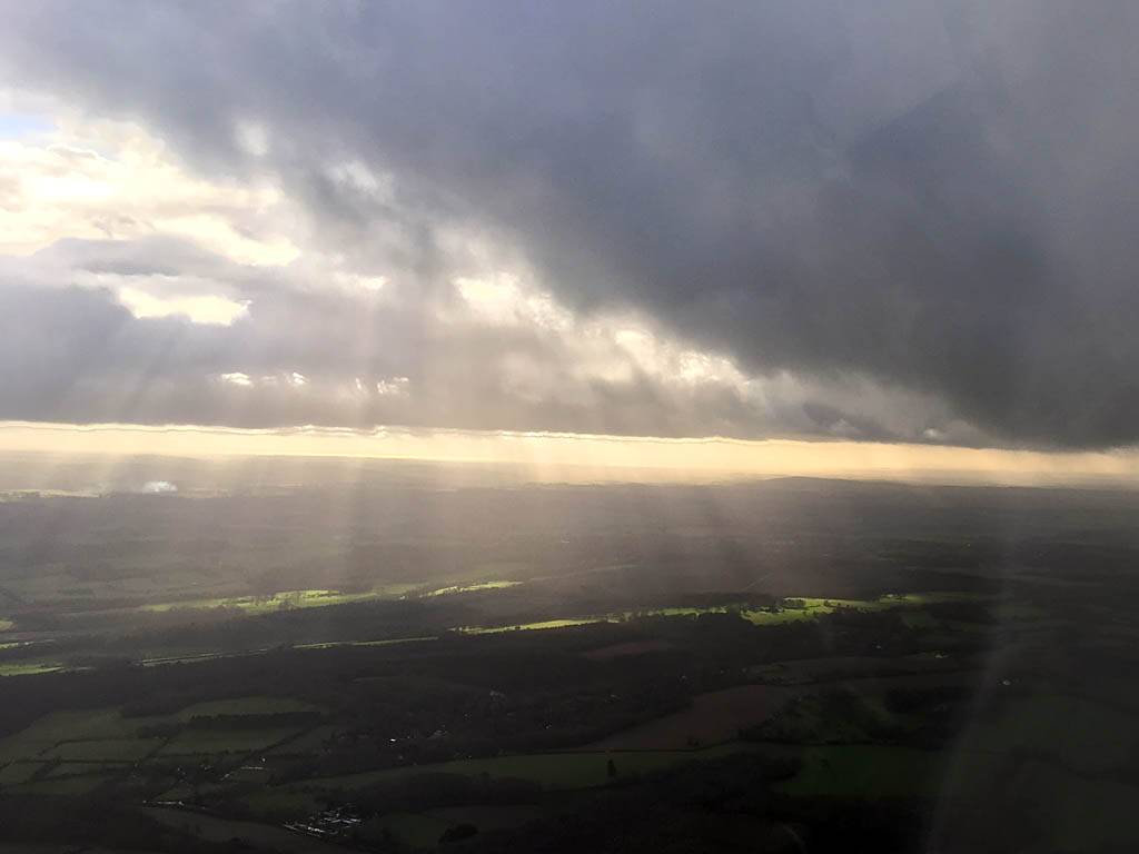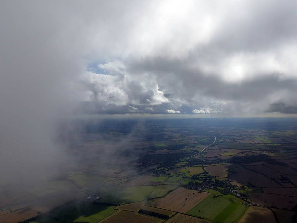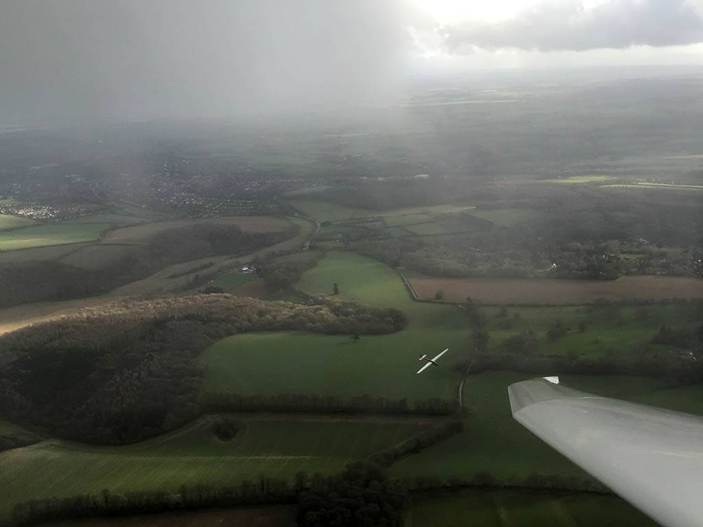 December thermals! | Sharing a thermal with a Lasham K13. | Nice cloud street to the South. | Crepuscular rays as my cloud becomes very overdeveloped and showery. | I found the rain behind the area of lift. | With a large gap to the next thermal making it out of reach from 1500 feet above the ground, my December soaring has come to an end. |