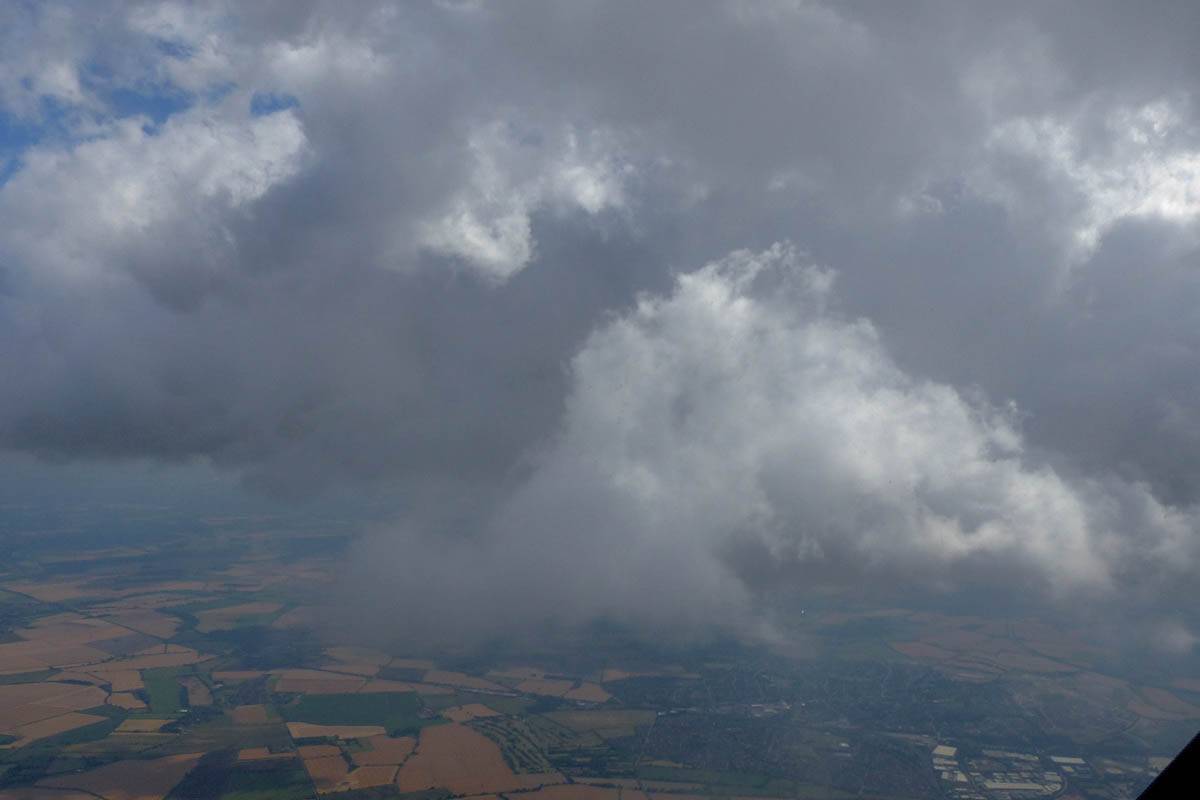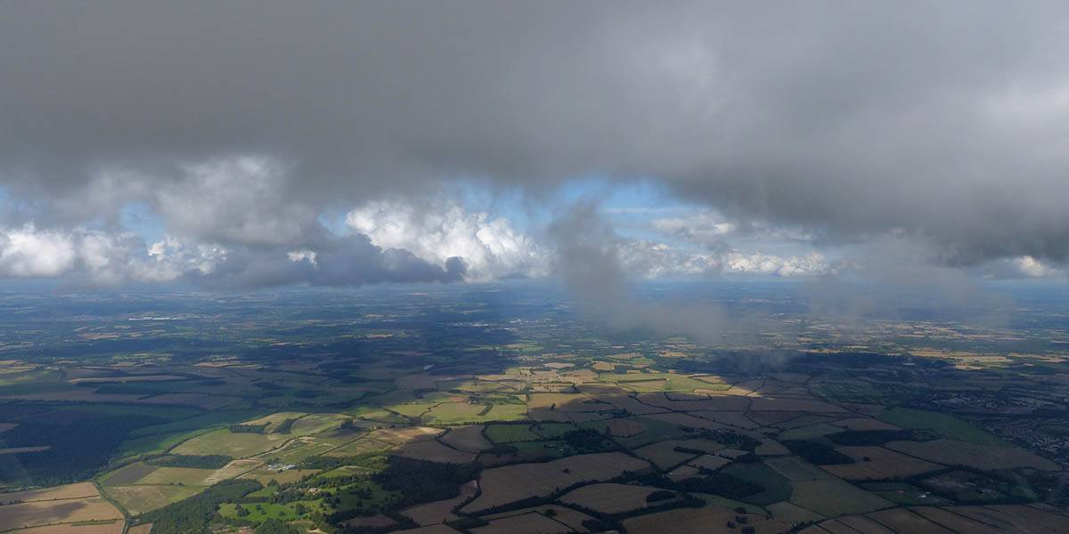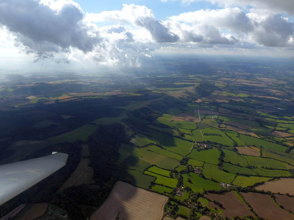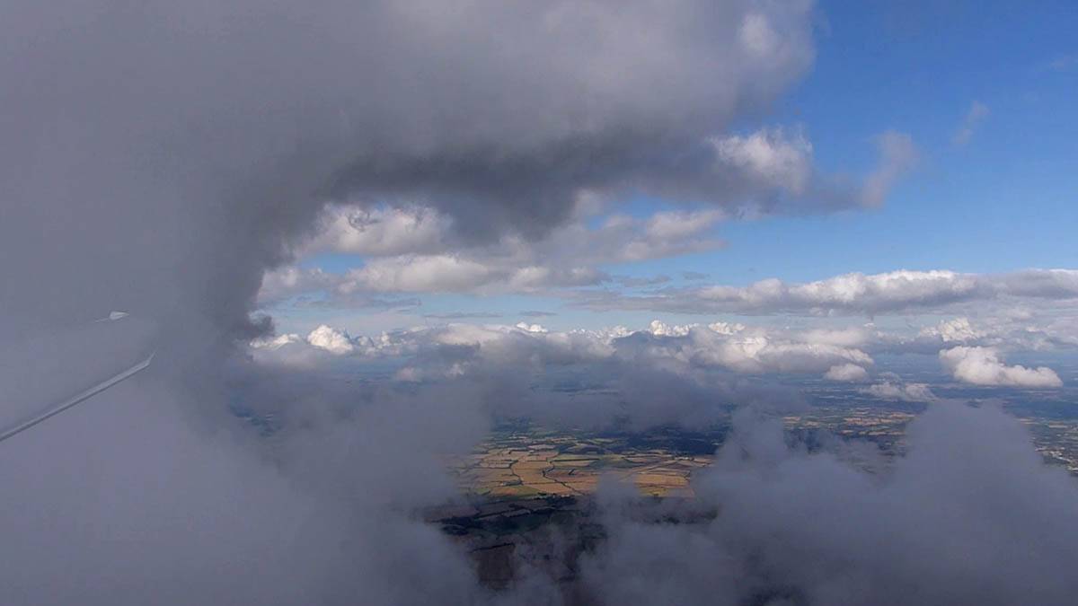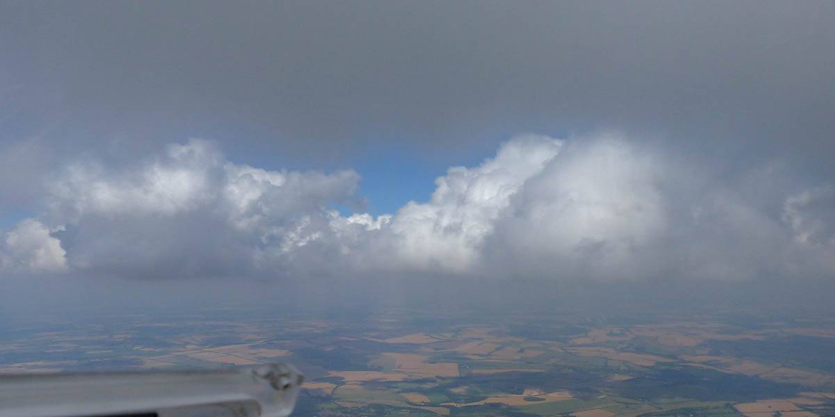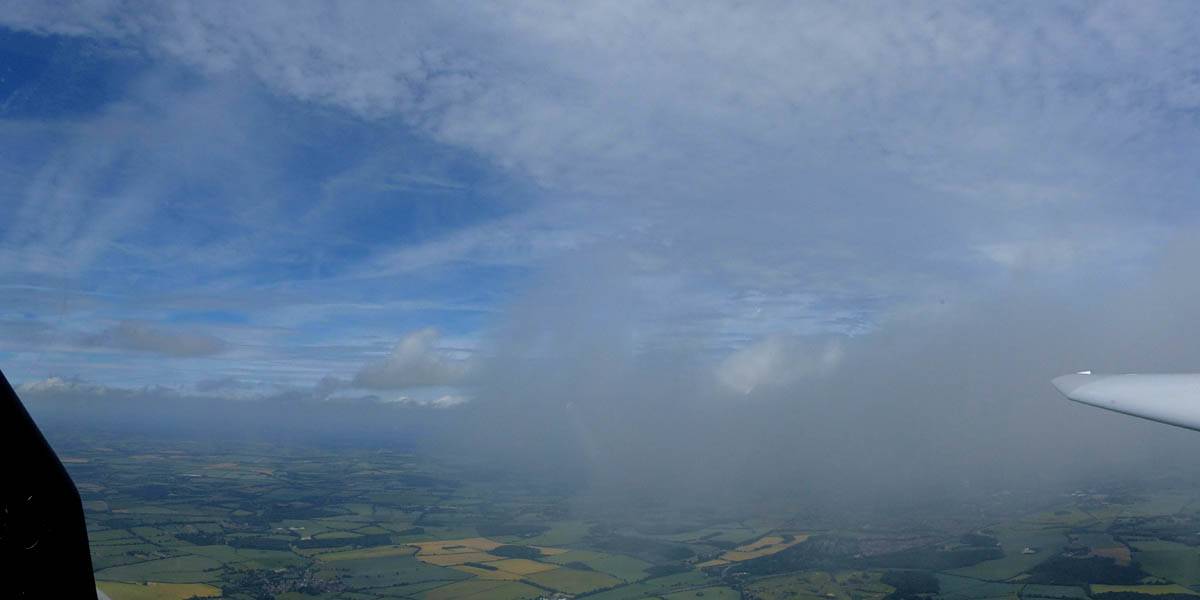 December thermals! | Sharing a thermal with a Lasham K13. | Nice cloud street to the South. | Crepuscular rays as my cloud becomes very overdeveloped and showery. | I found the rain behind the area of lift. | With a large gap to the next thermal making it out of reach from 1500 feet above the ground, my December soaring has come to an end. |