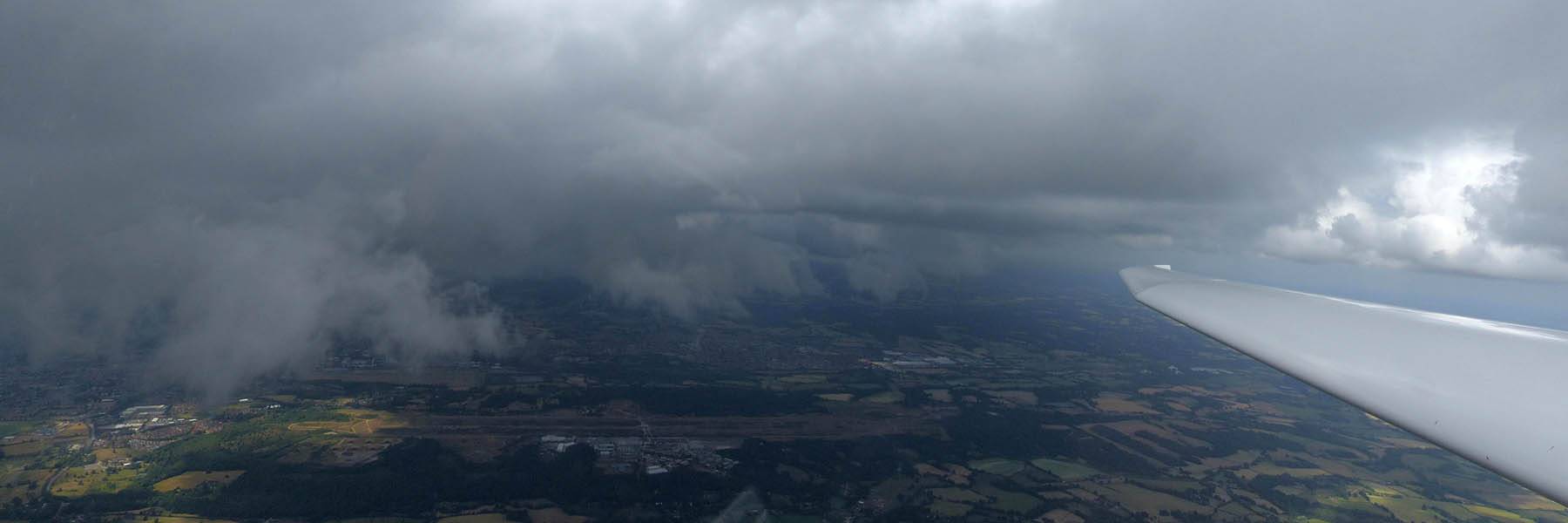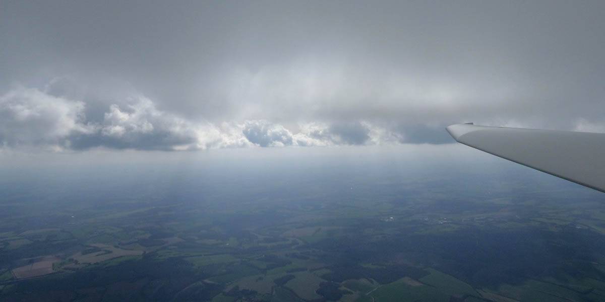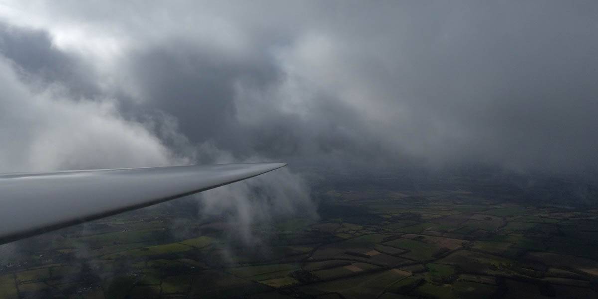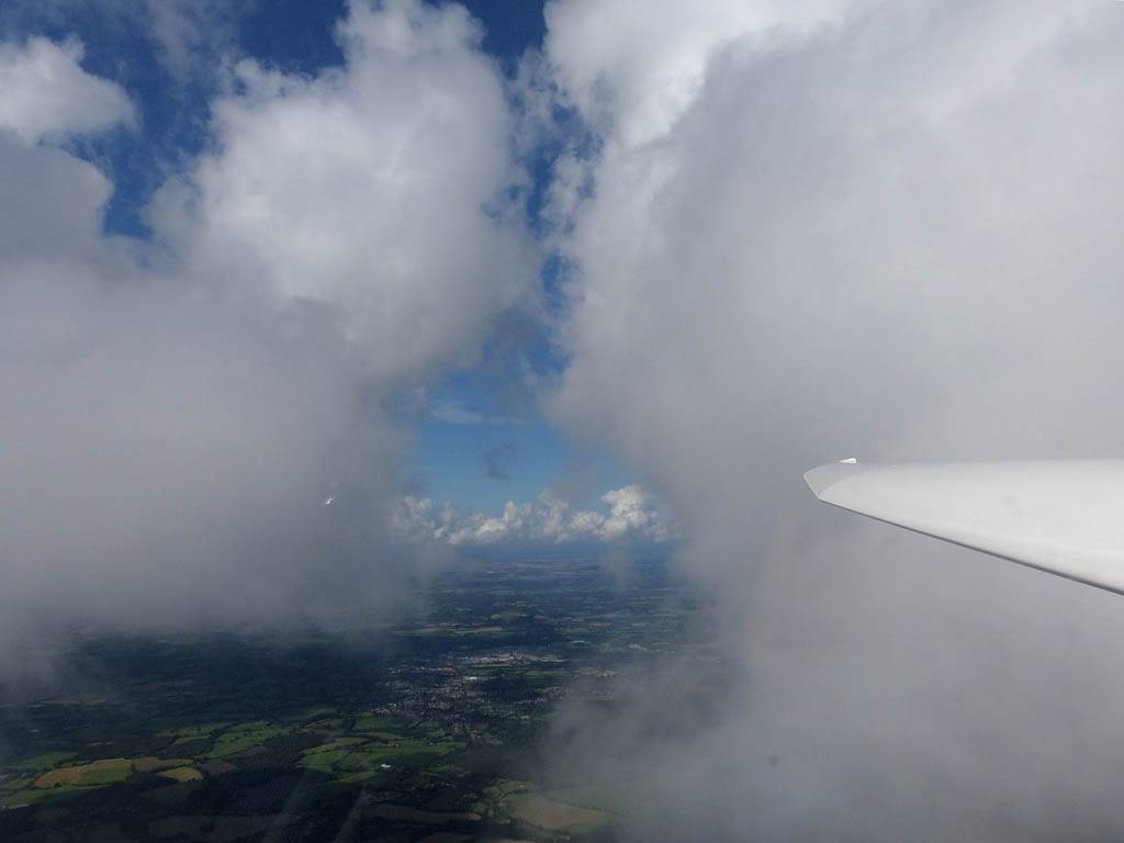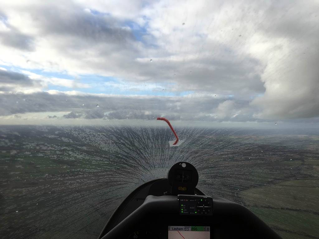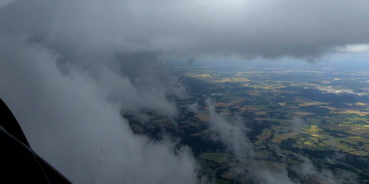 December thermals! | Sharing a thermal with a Lasham K13. | Nice cloud street to the South. | Crepuscular rays as my cloud becomes very overdeveloped and showery. | I found the rain behind the area of lift. | With a large gap to the next thermal making it out of reach from 1500 feet above the ground, my December soaring has come to an end. |