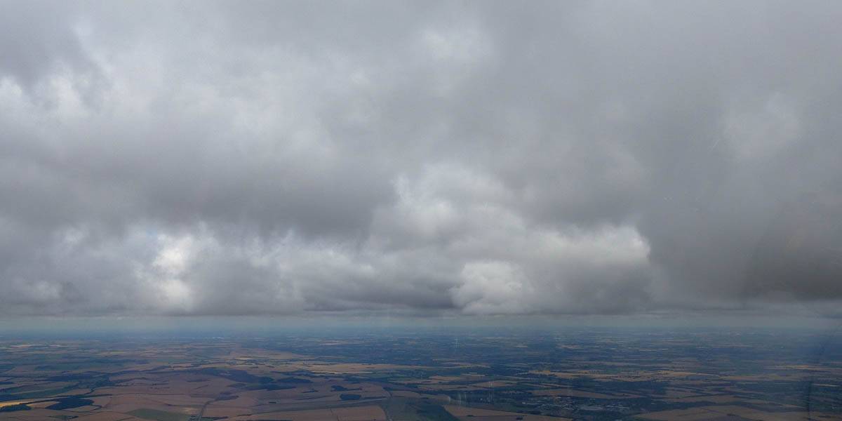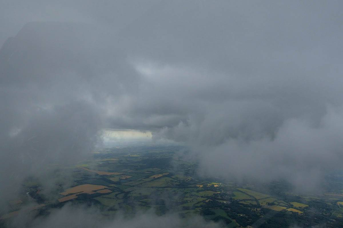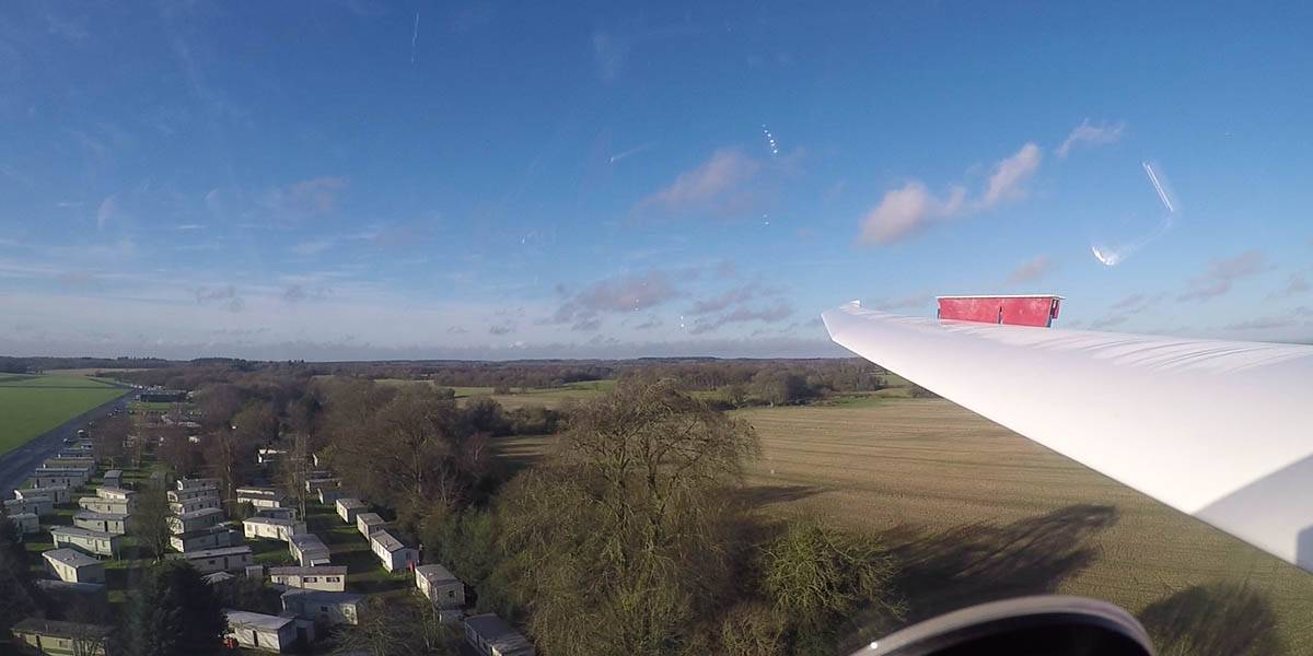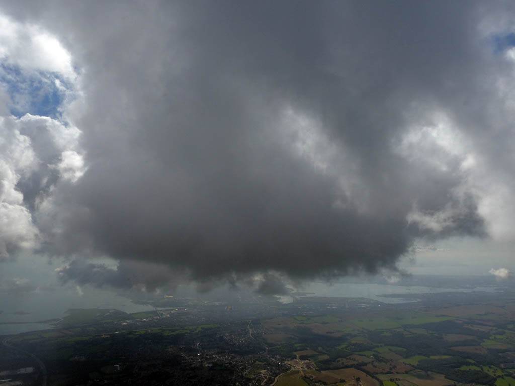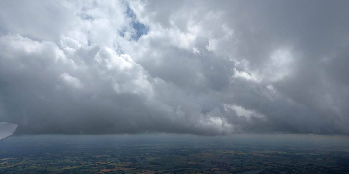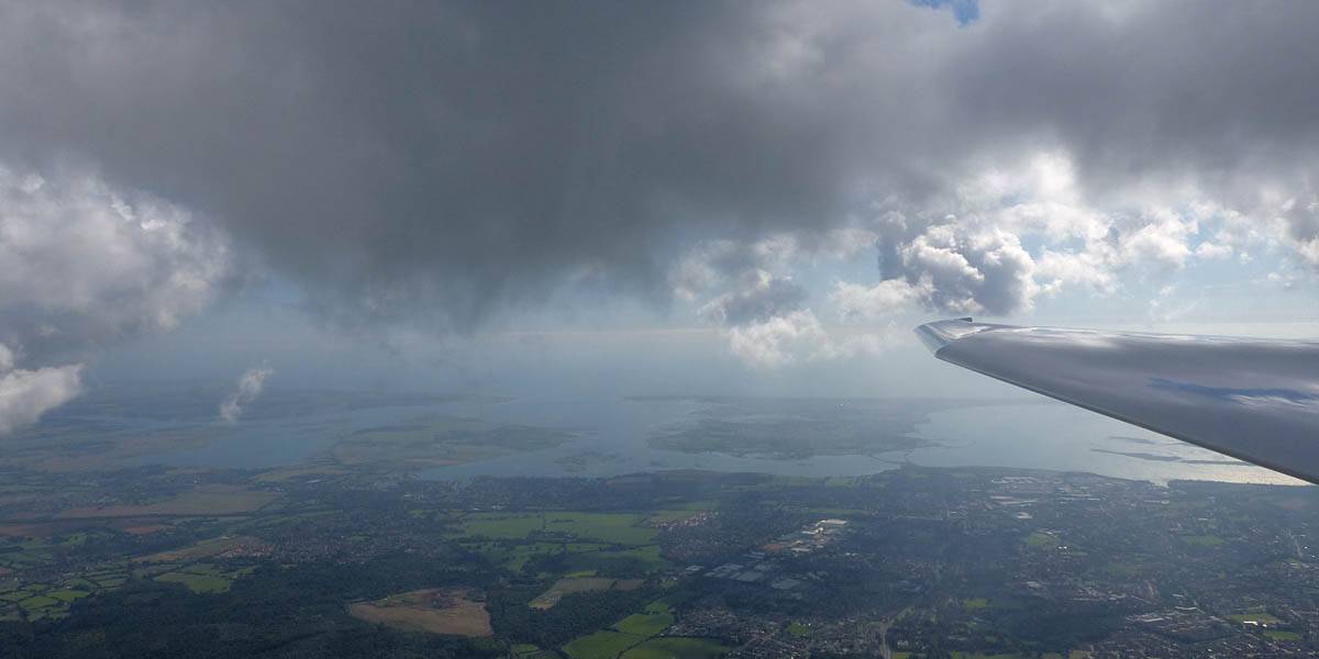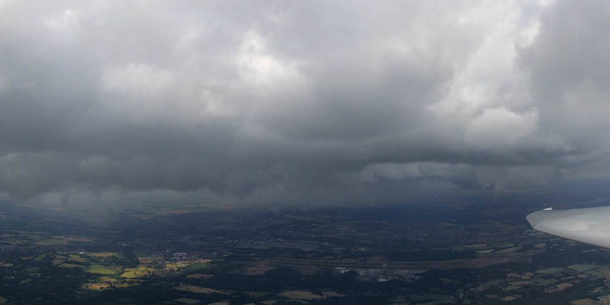 December thermals! | Sharing a thermal with a Lasham K13. | Nice cloud street to the South. | Crepuscular rays as my cloud becomes very overdeveloped and showery. | I found the rain behind the area of lift. | With a large gap to the next thermal making it out of reach from 1500 feet above the ground, my December soaring has come to an end. |
