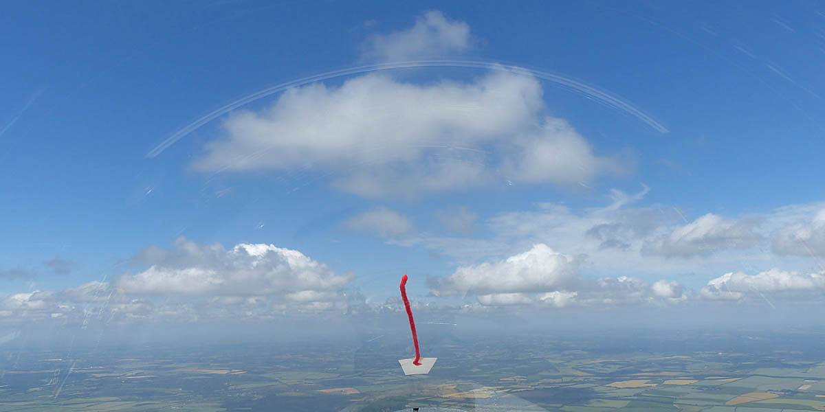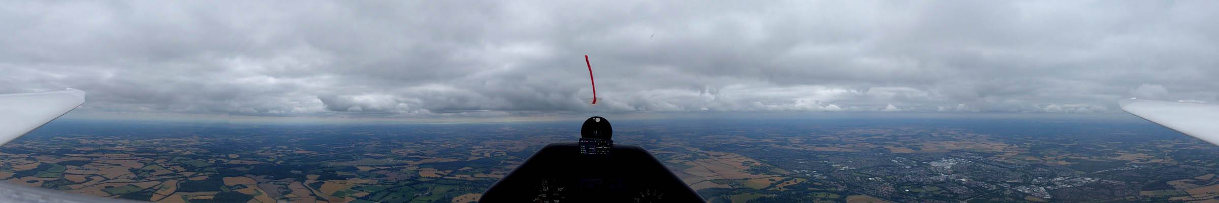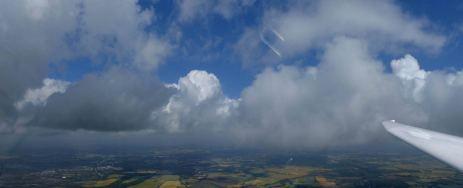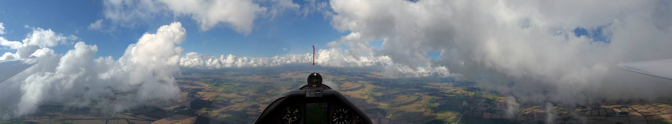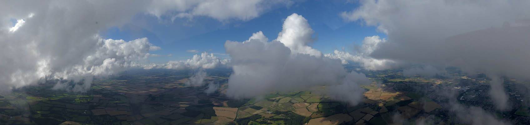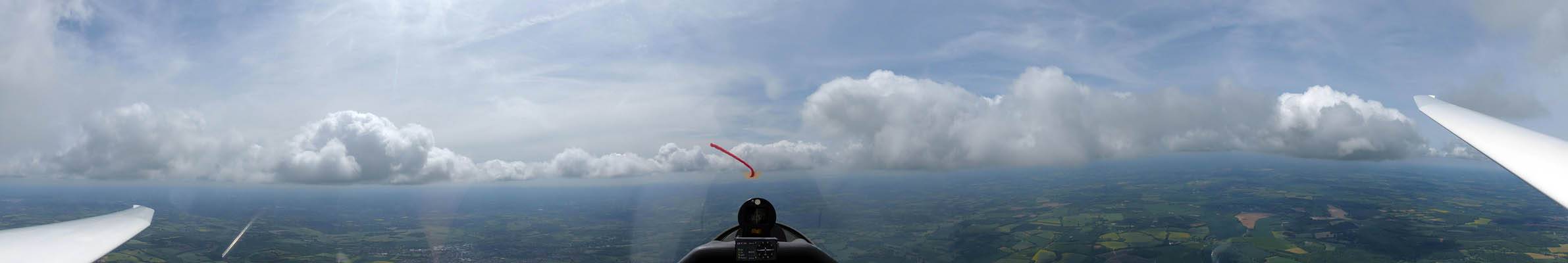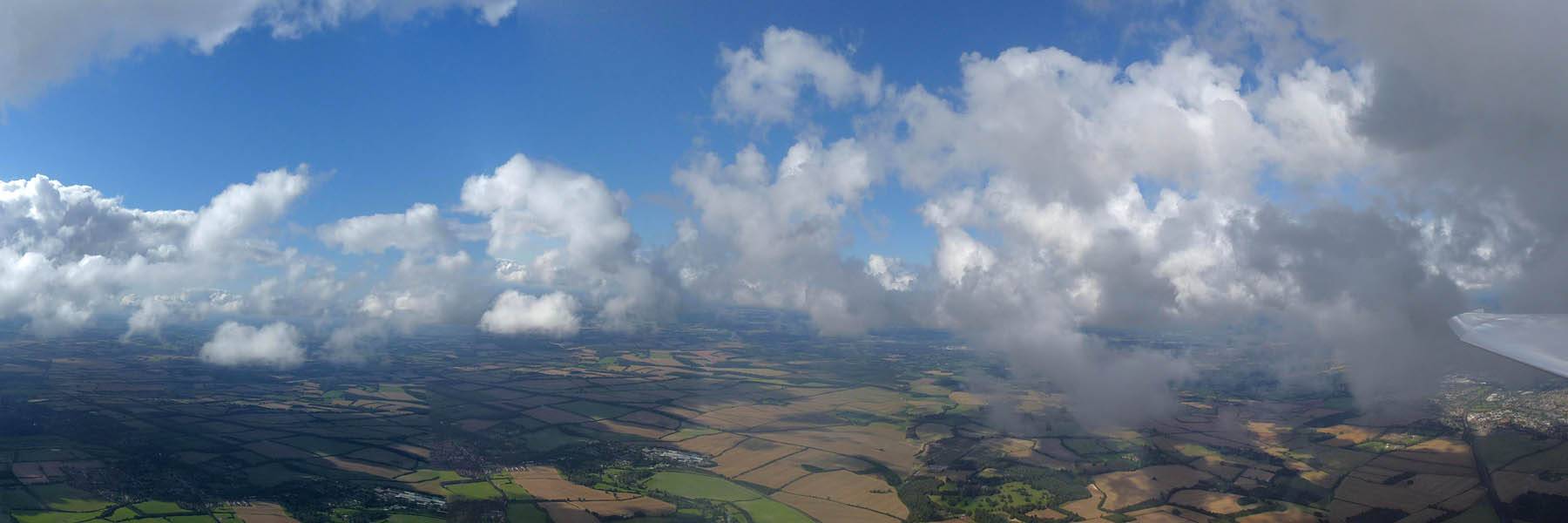 A quick GoPro panorama before I put it back on the suction mount. | Looking Northeast over small clouds to Lasham Airfield. | A more spectacular building cumulus cloudscape. | This cloud looks like a passing cloud seahorse. Or is it someone reclining in a hammock? |