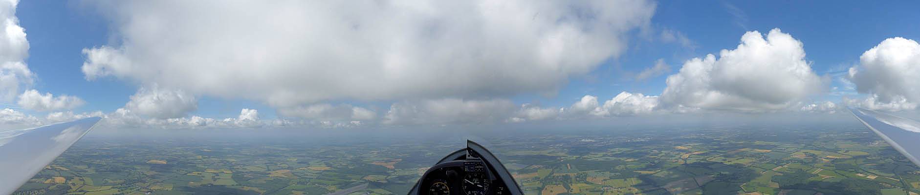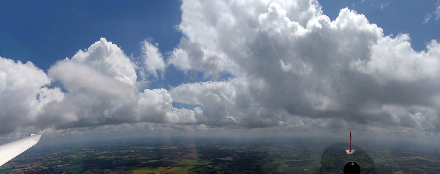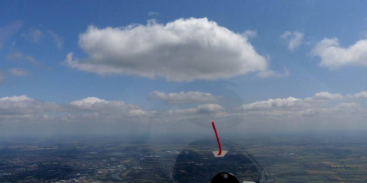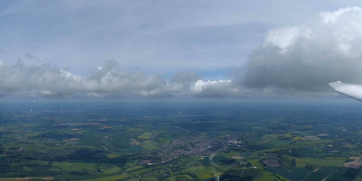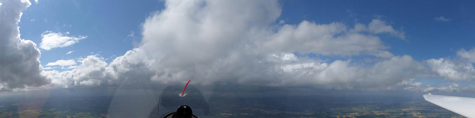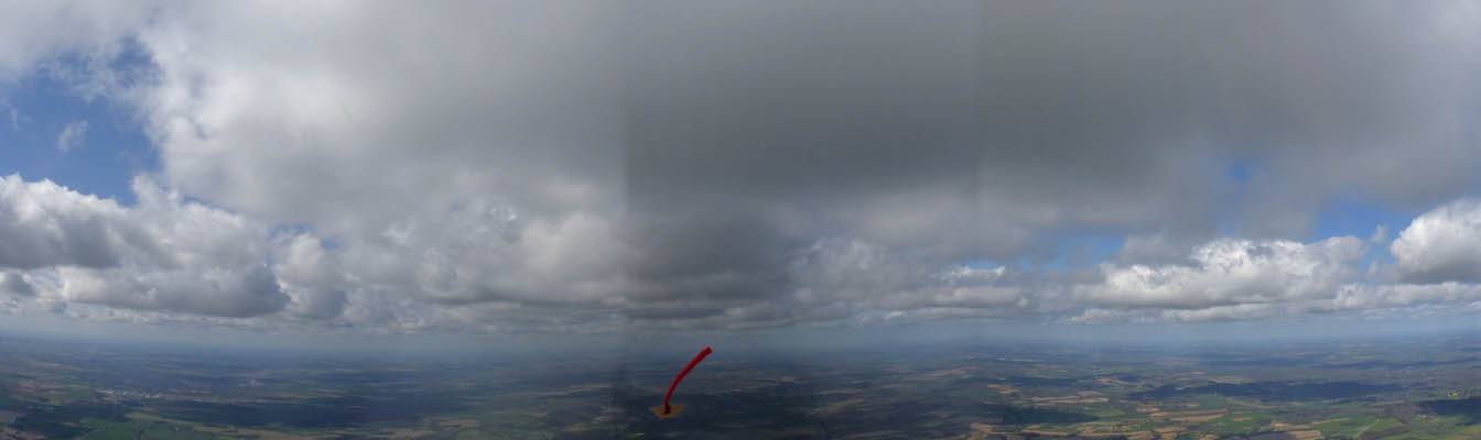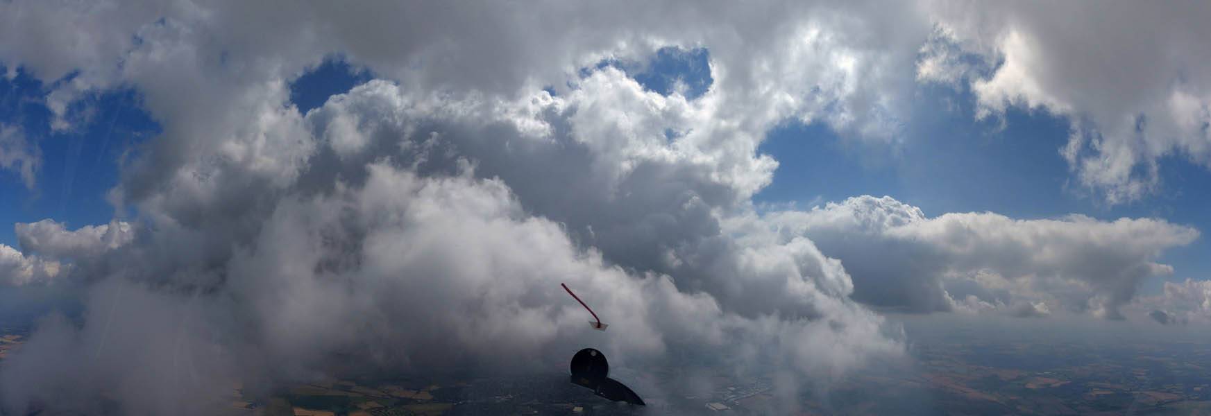 A quick GoPro panorama before I put it back on the suction mount. | Looking Northeast over small clouds to Lasham Airfield. | A more spectacular building cumulus cloudscape. | This cloud looks like a passing cloud seahorse. Or is it someone reclining in a hammock? |
