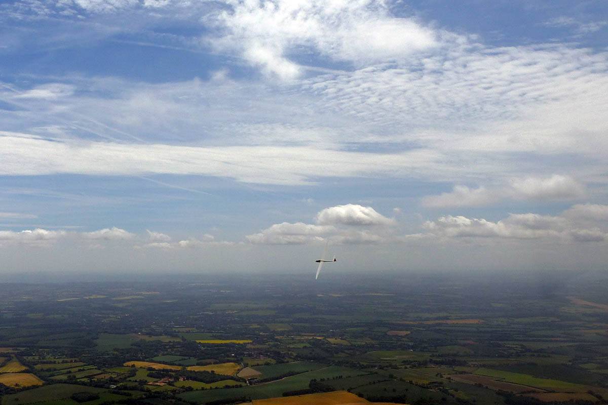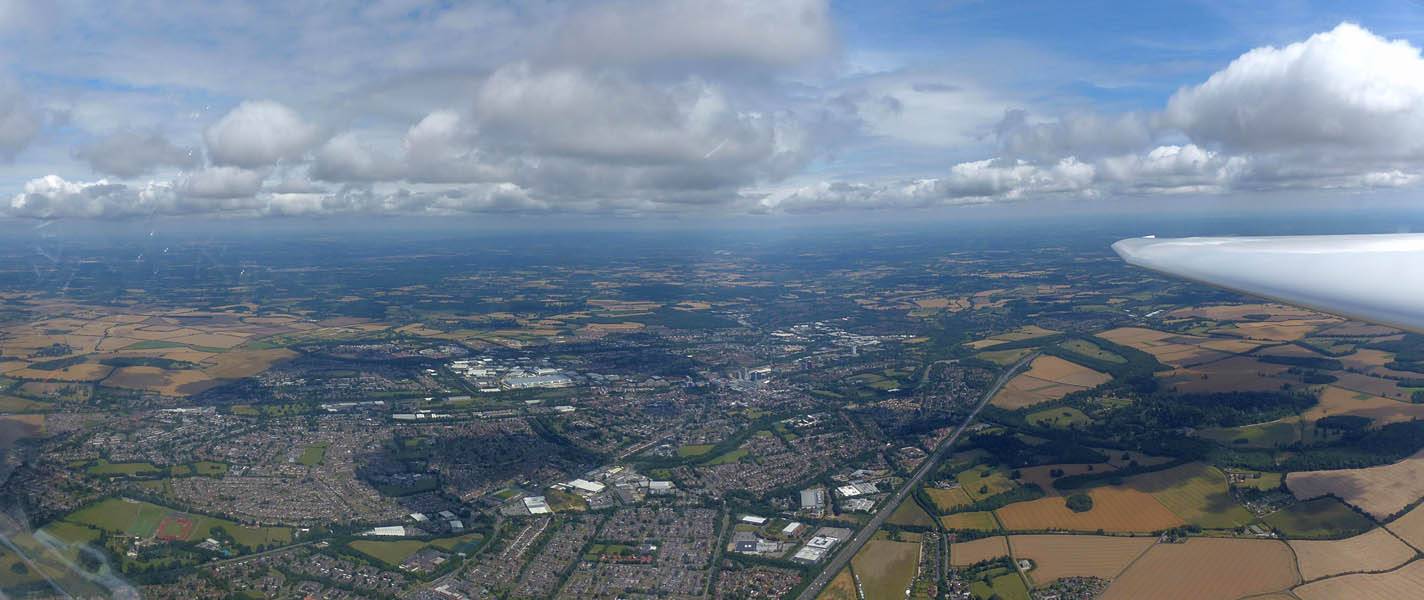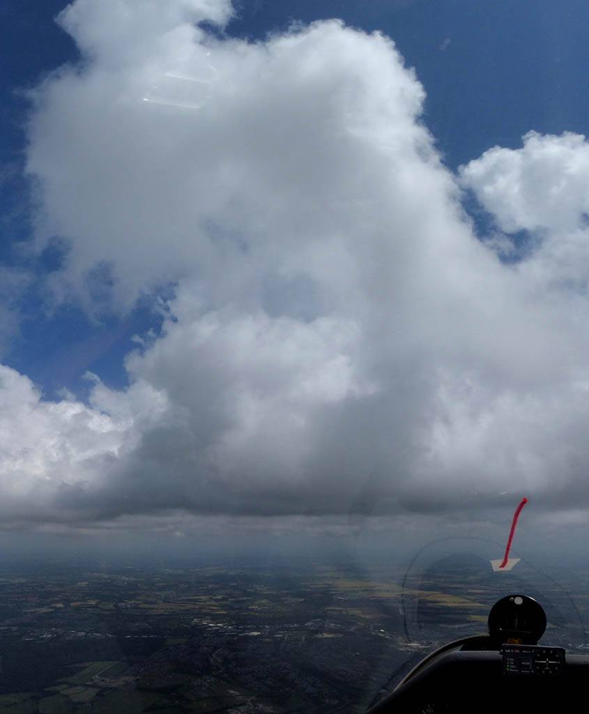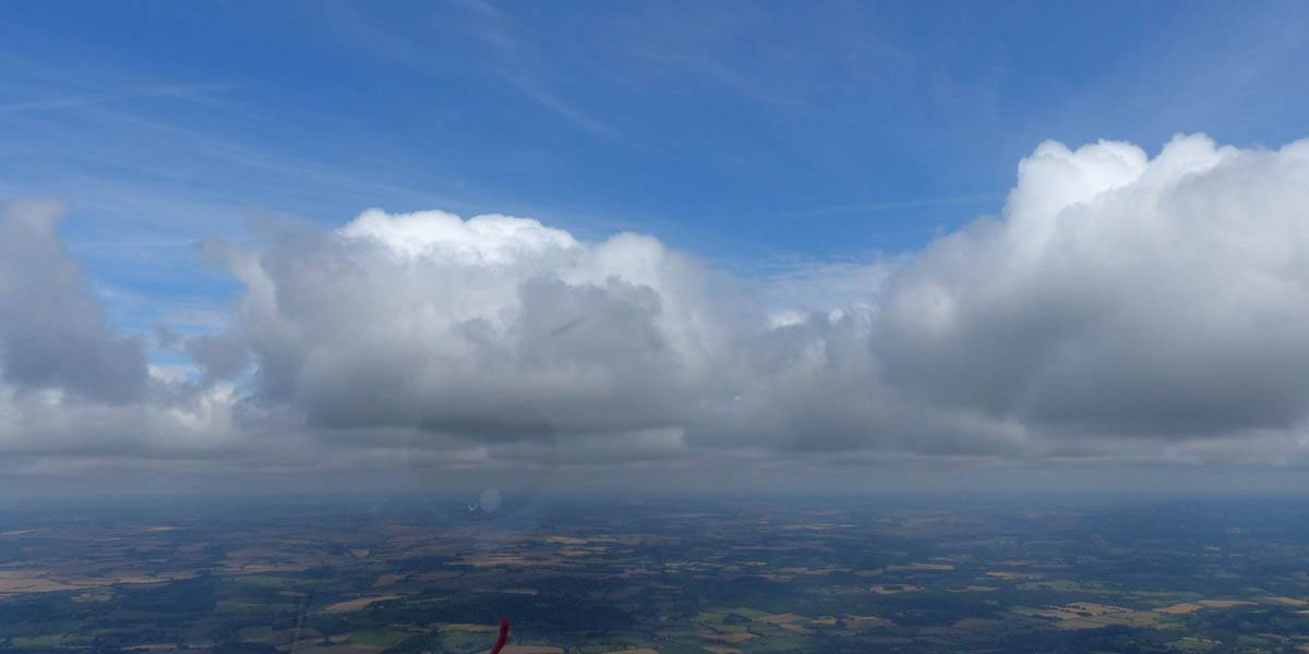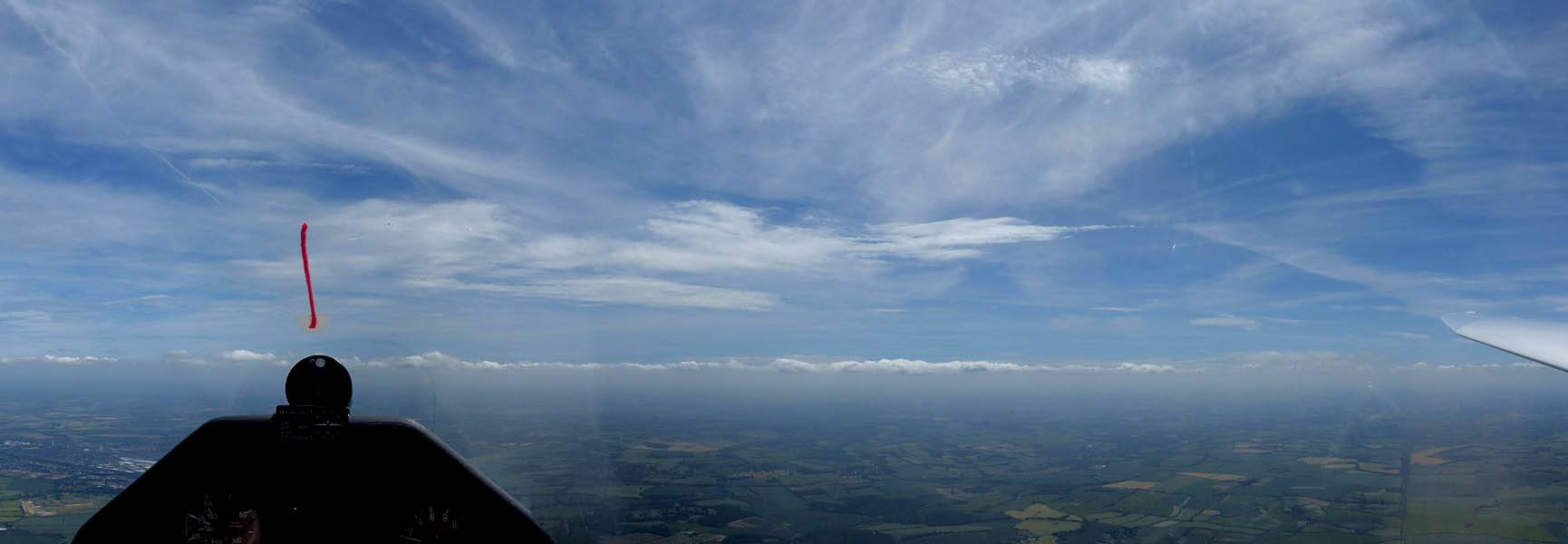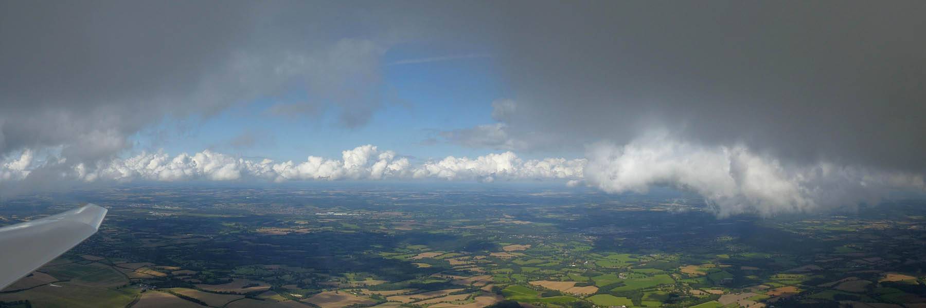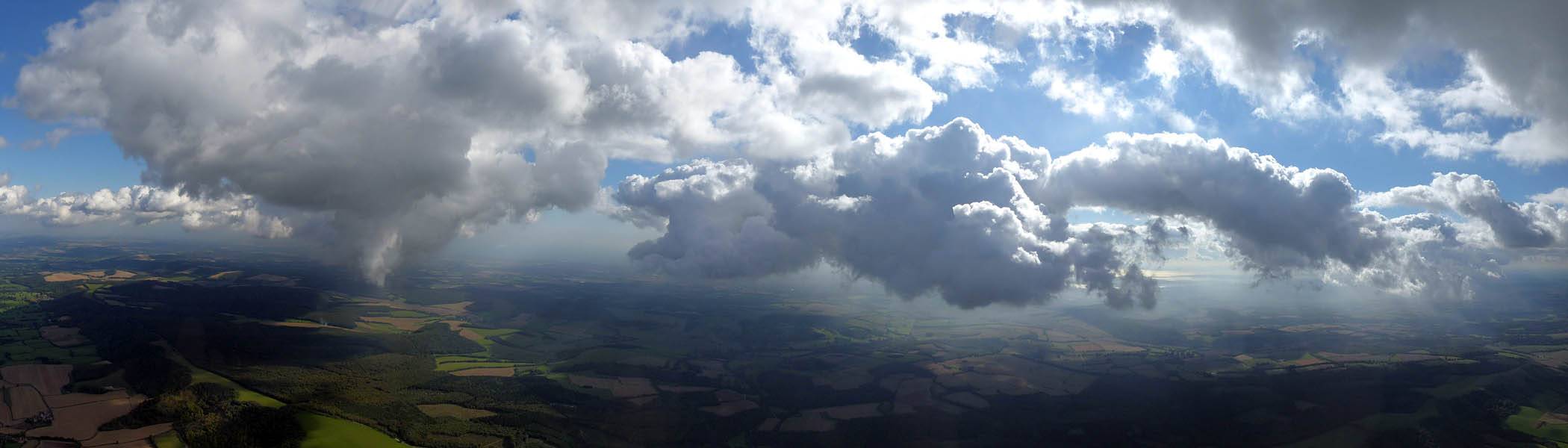 A quick GoPro panorama before I put it back on the suction mount. | Looking Northeast over small clouds to Lasham Airfield. | A more spectacular building cumulus cloudscape. | This cloud looks like a passing cloud seahorse. Or is it someone reclining in a hammock? |
