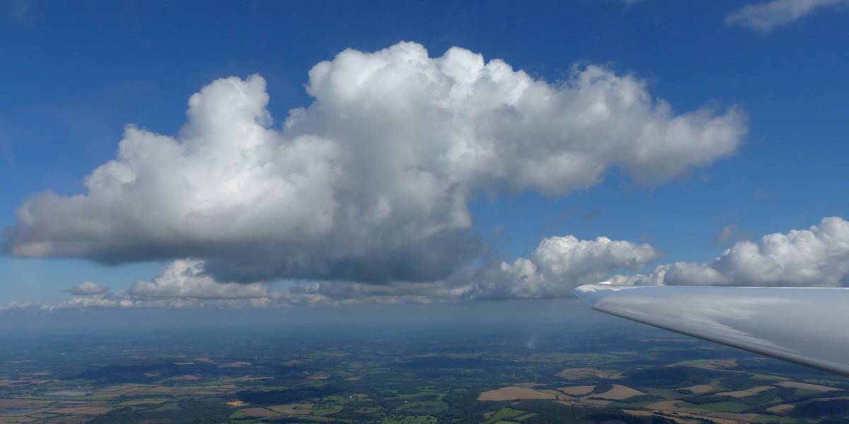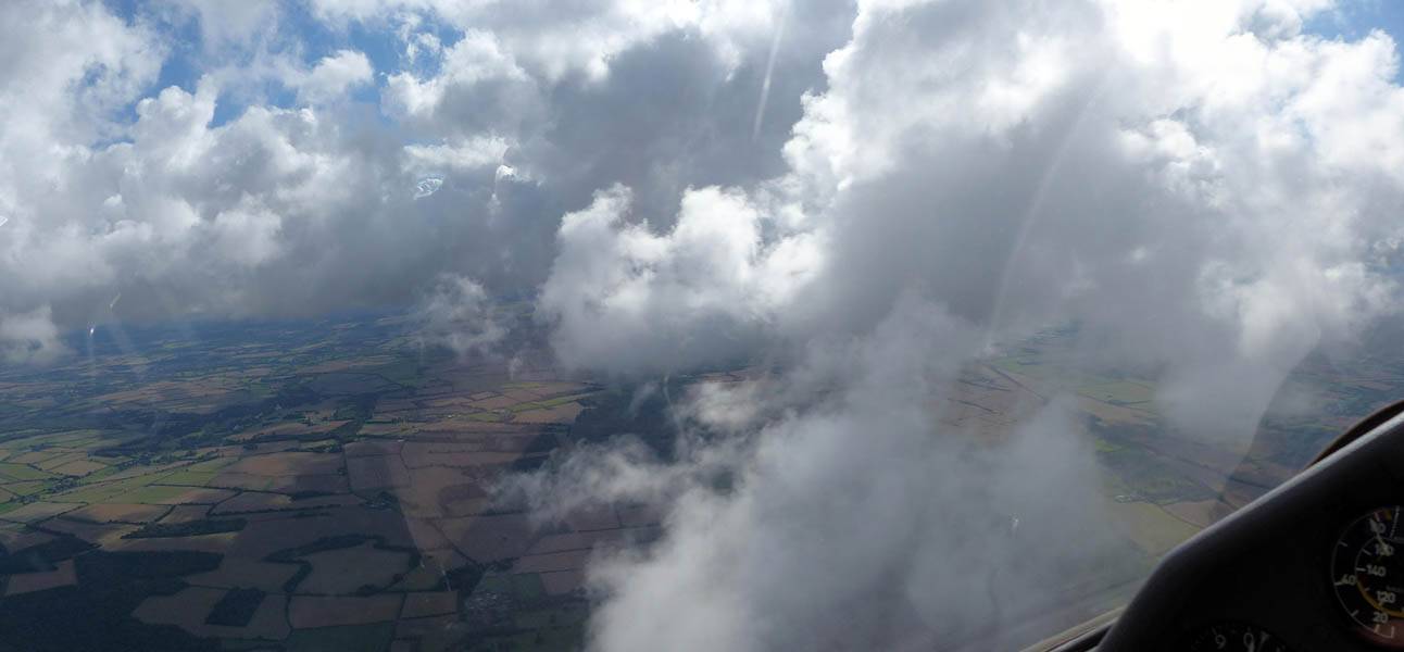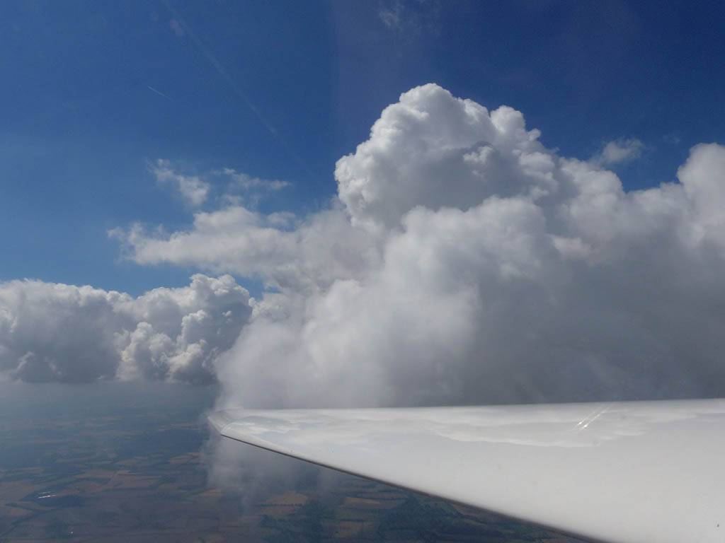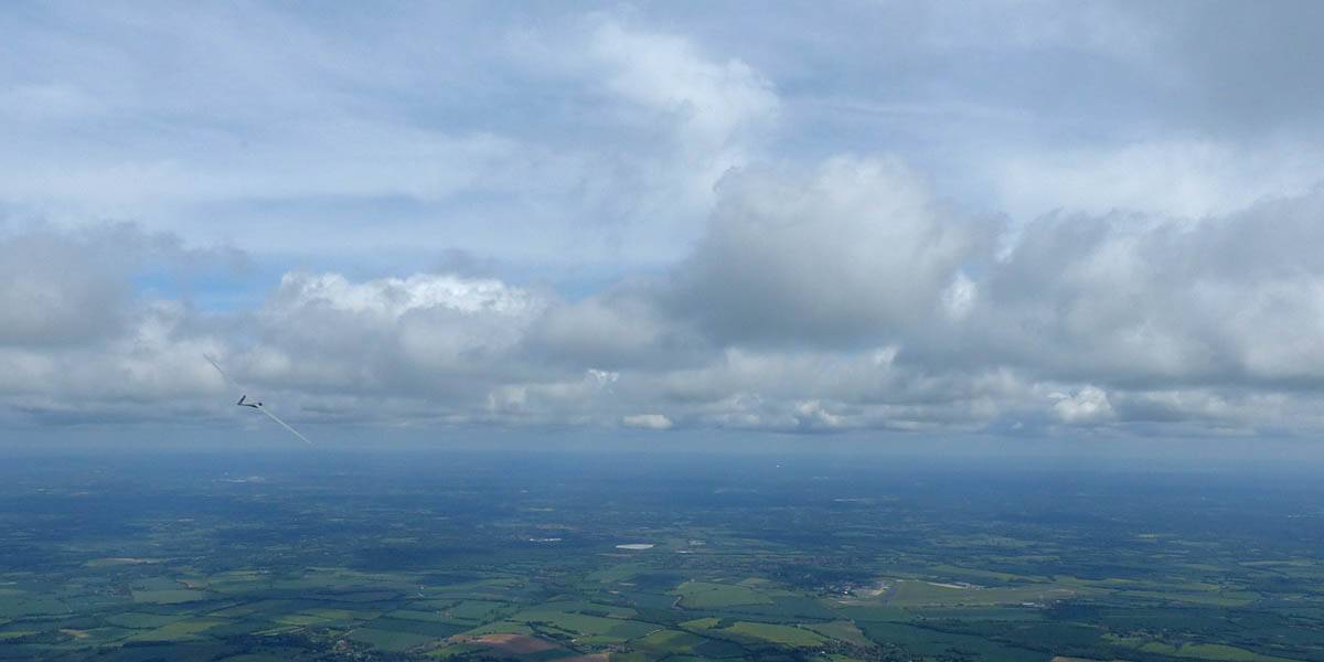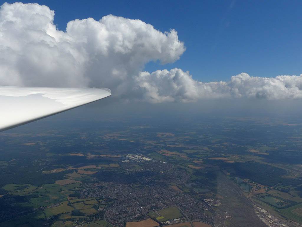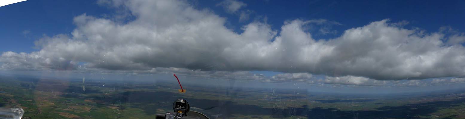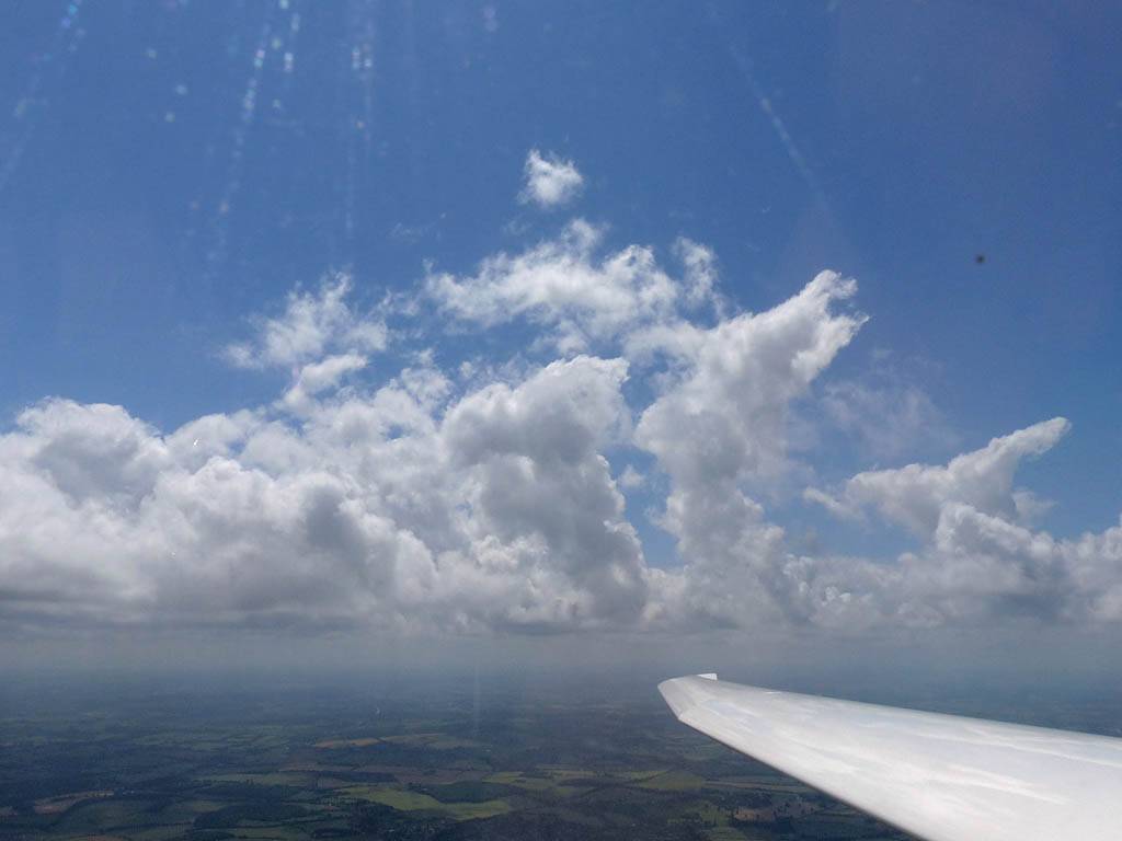 Flying alongside glider KRO for a while under the cloud street. | Cloud street panorama. | Looking North to Newbury and beyond. | A nice cumulus to the South, in the Andover area. |