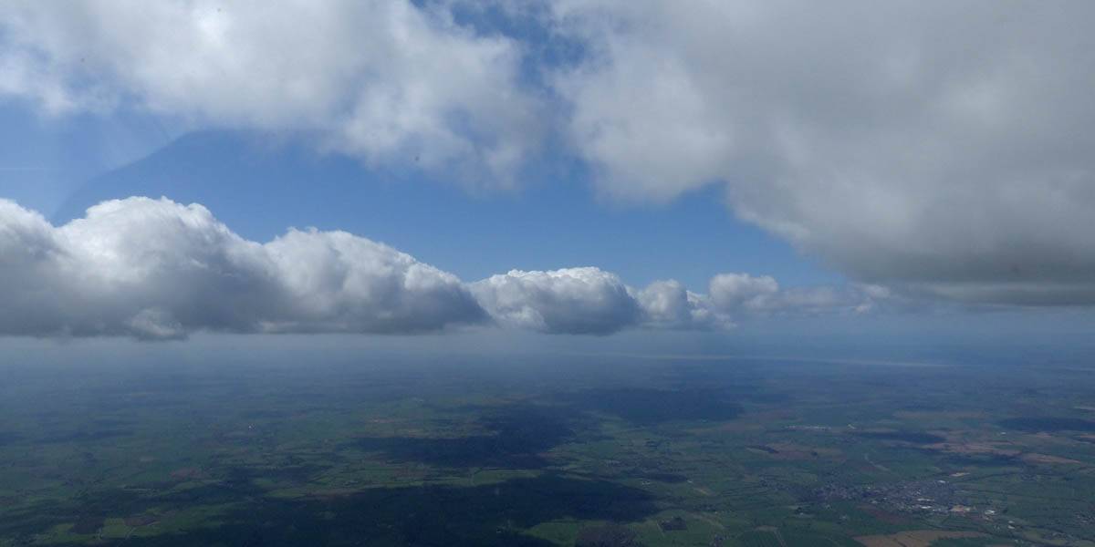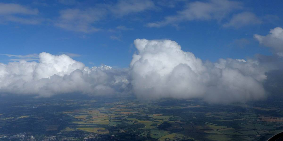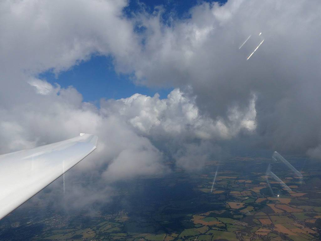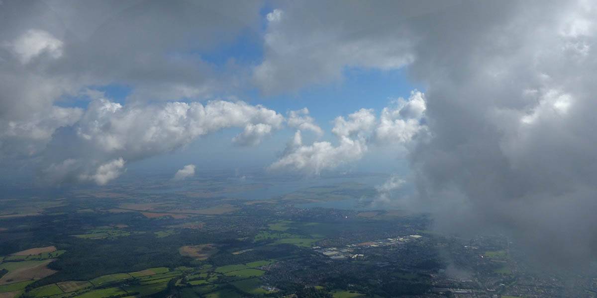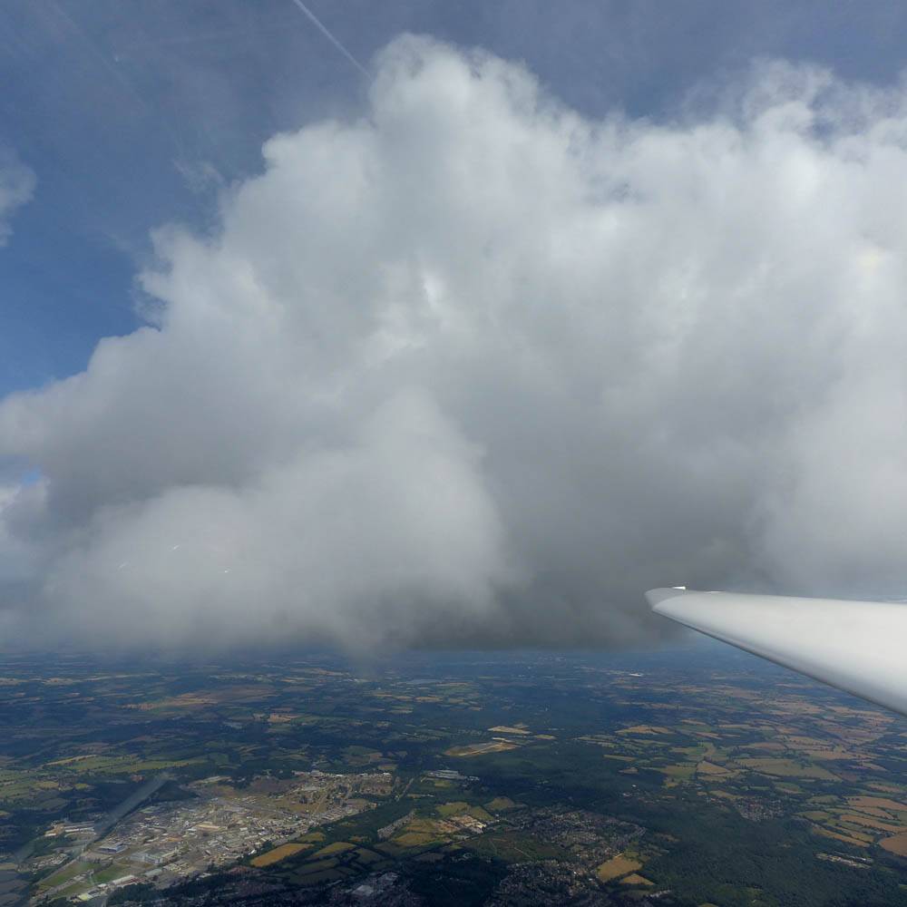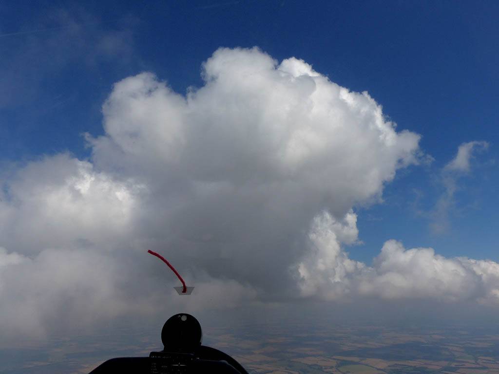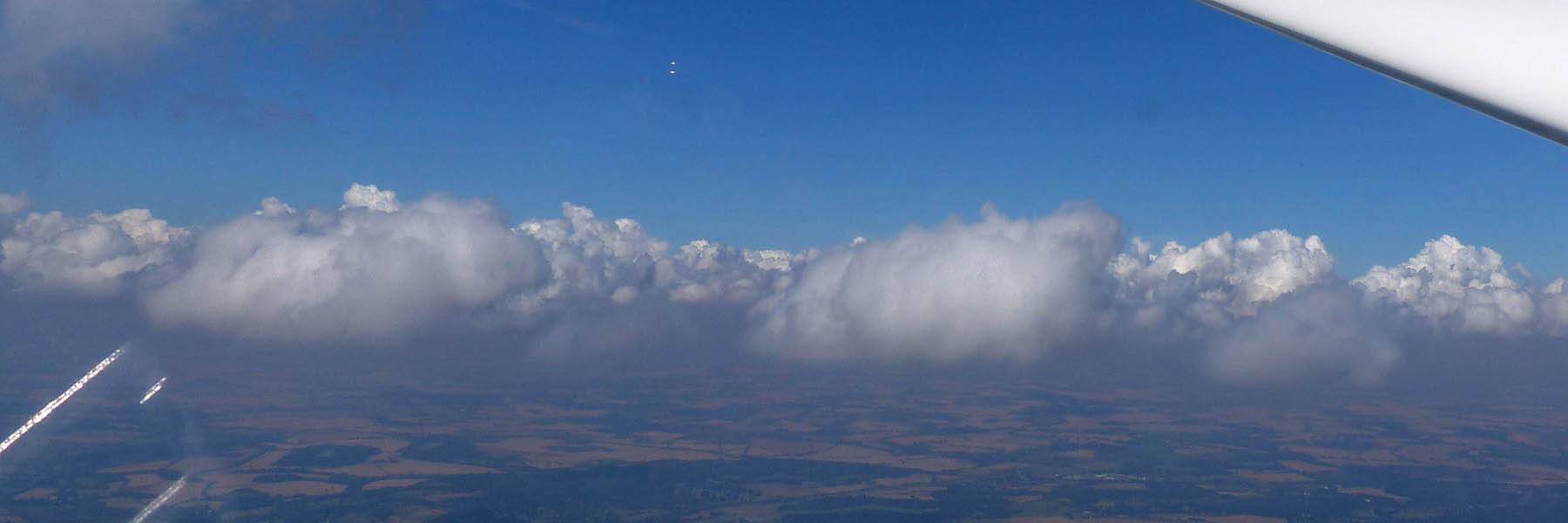 Flying alongside glider KRO for a while under the cloud street. | Cloud street panorama. | Looking North to Newbury and beyond. | A nice cumulus to the South, in the Andover area. |