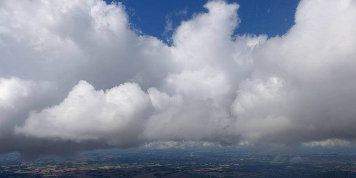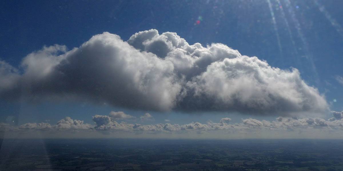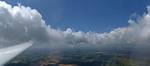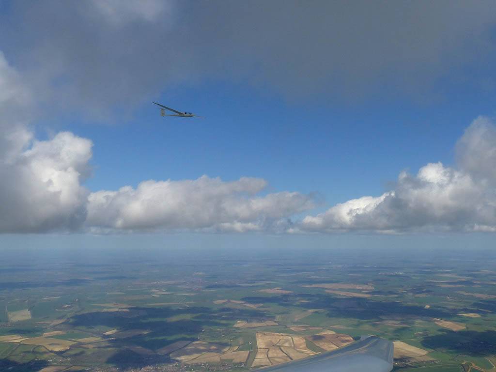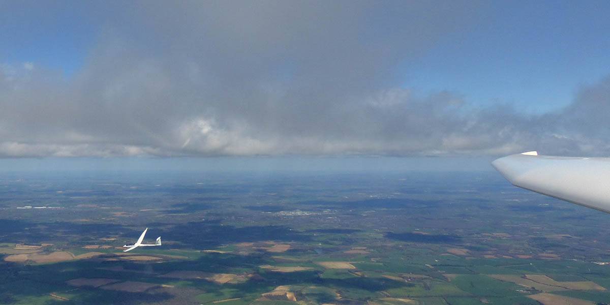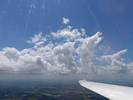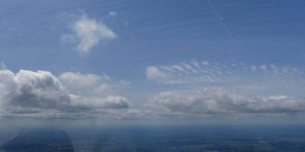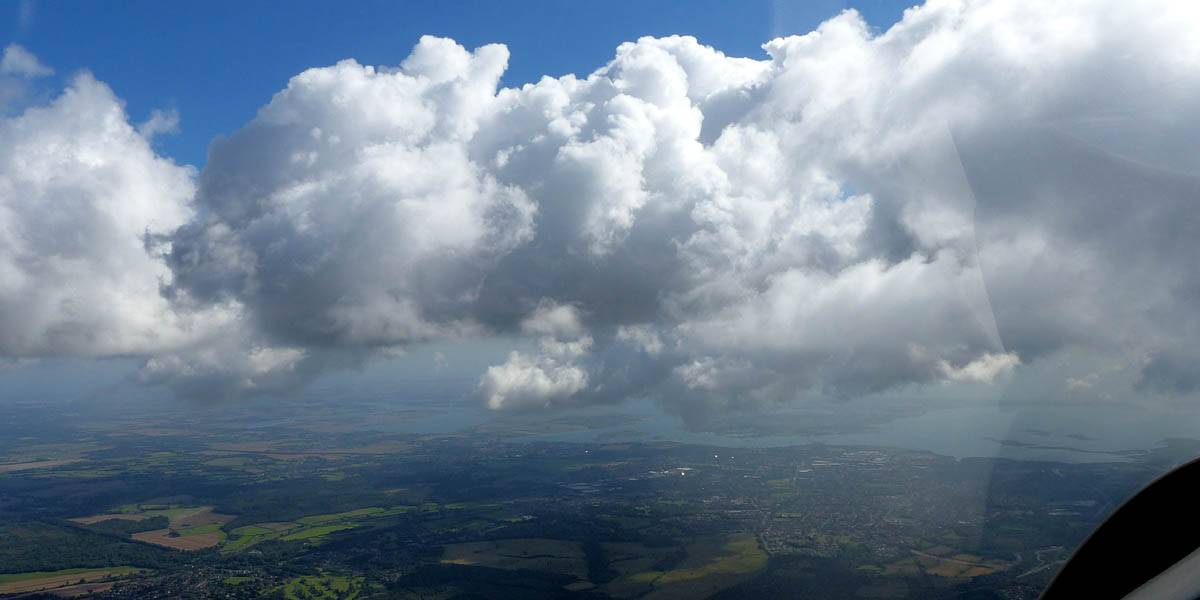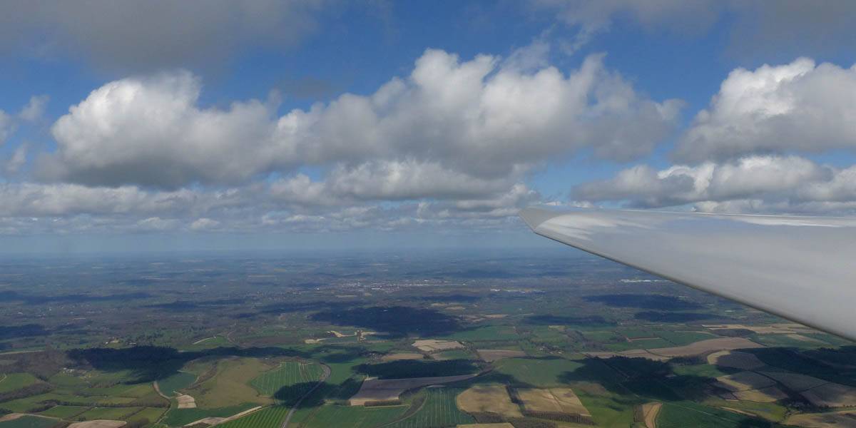 Flying alongside glider KRO for a while under the cloud street. | Cloud street panorama. | Looking North to Newbury and beyond. | A nice cumulus to the South, in the Andover area. |