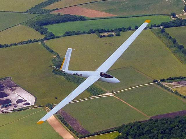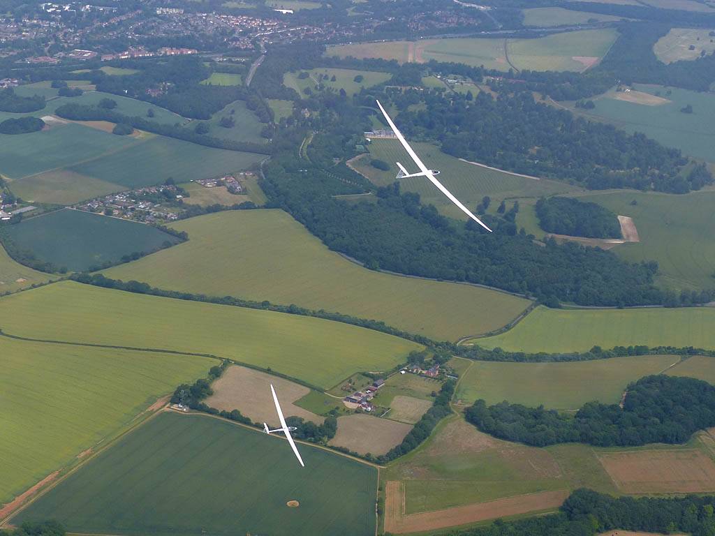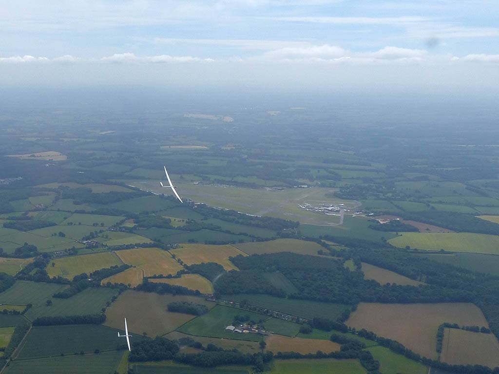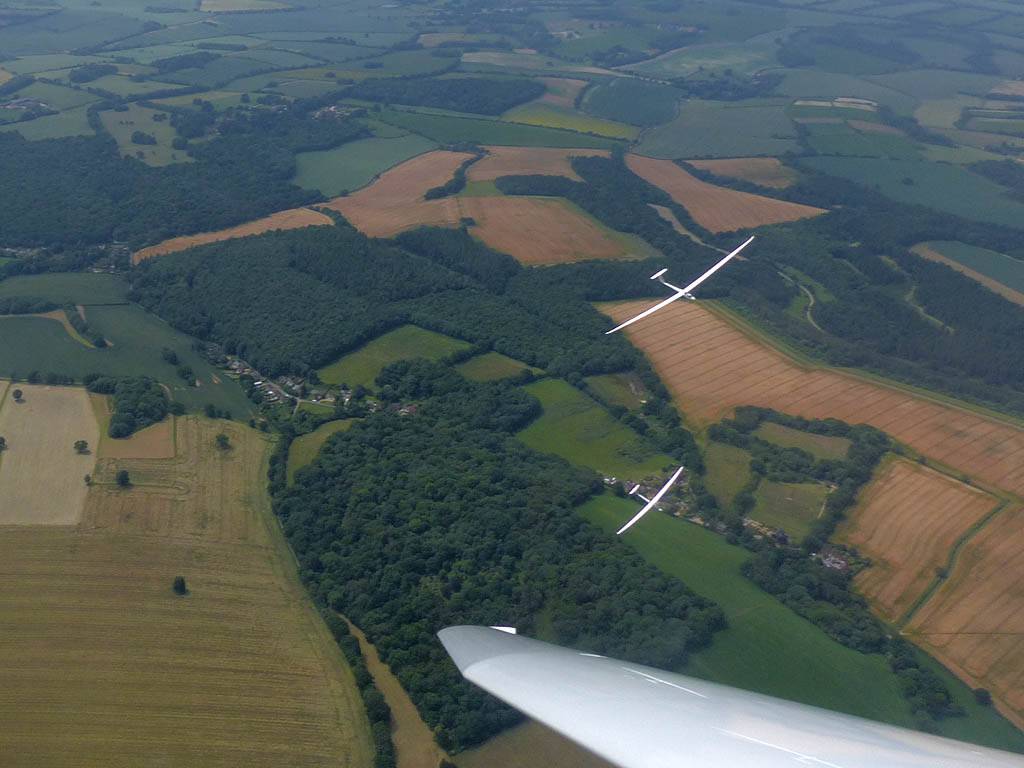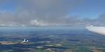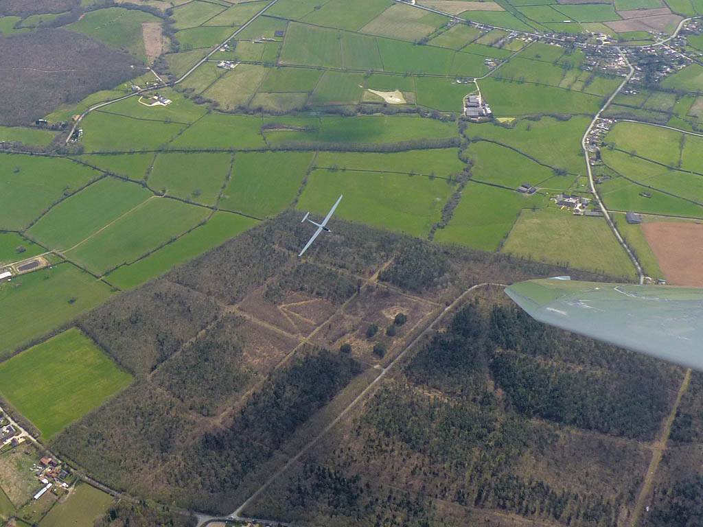 Flying to the 2nd cloud street to the North. | Soaring over Milbourne Common Wood. The Common is to the South of us at the top right of the picture. | The other Lasham Discus SH2 was also on his way to Aston Down and back. | Kemble airfield from the South. | The Severn Estuary comes into view. |