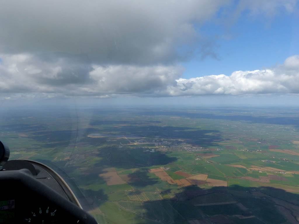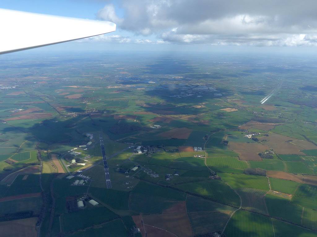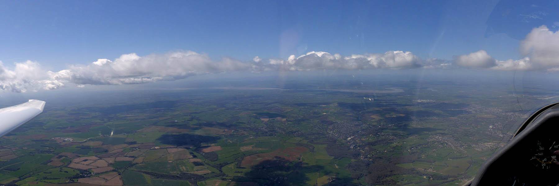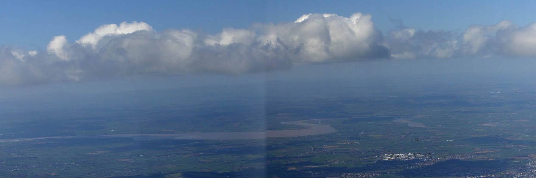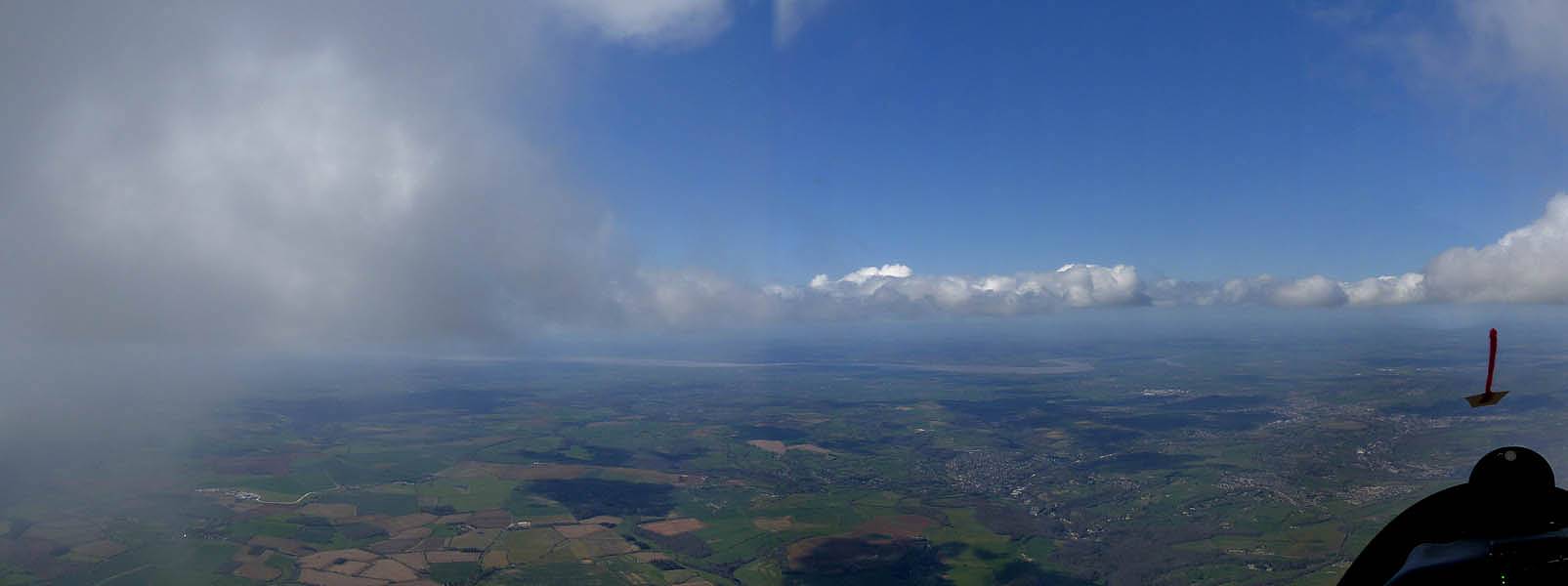 Looking back East-Southeastwards from Kemble, the shadows showing the long line of the 2nd cloud street. | Approaching Aston Down gliding club from the Southeast. | Gazing westwards towards the Severn Estuary as I approach Aston Down. |