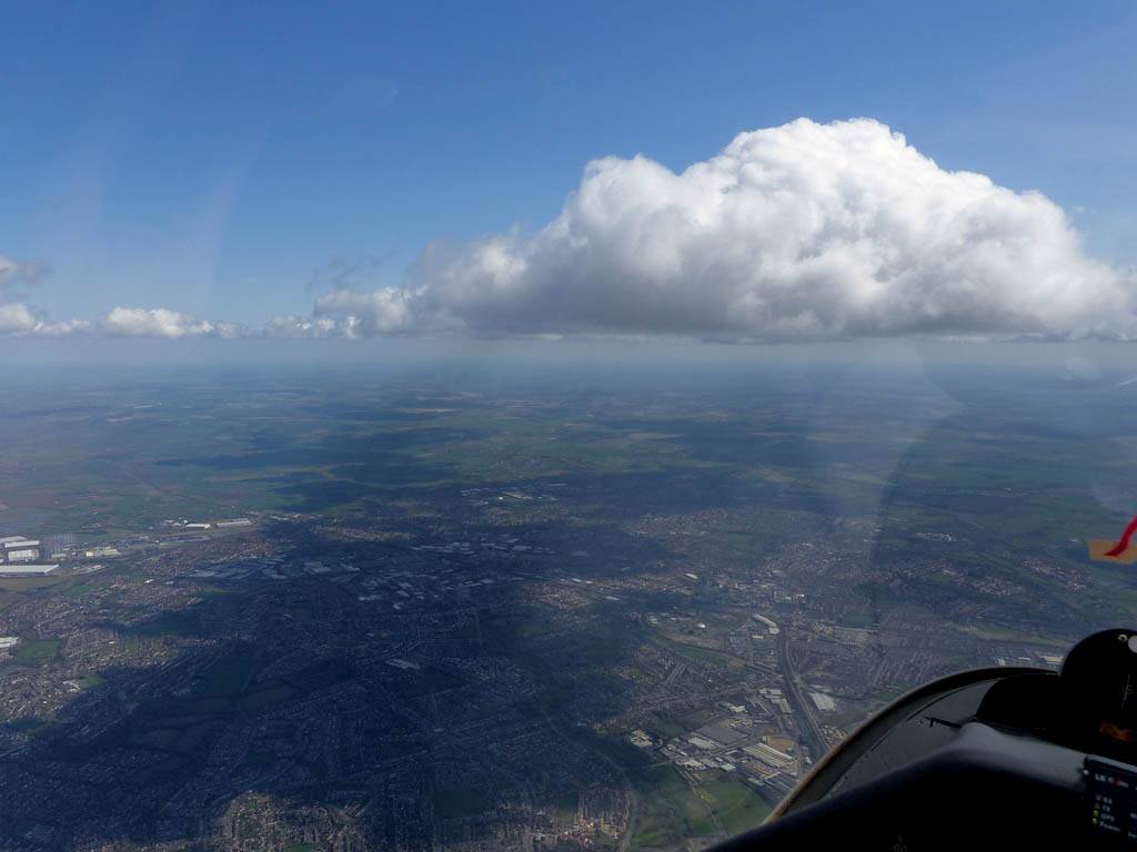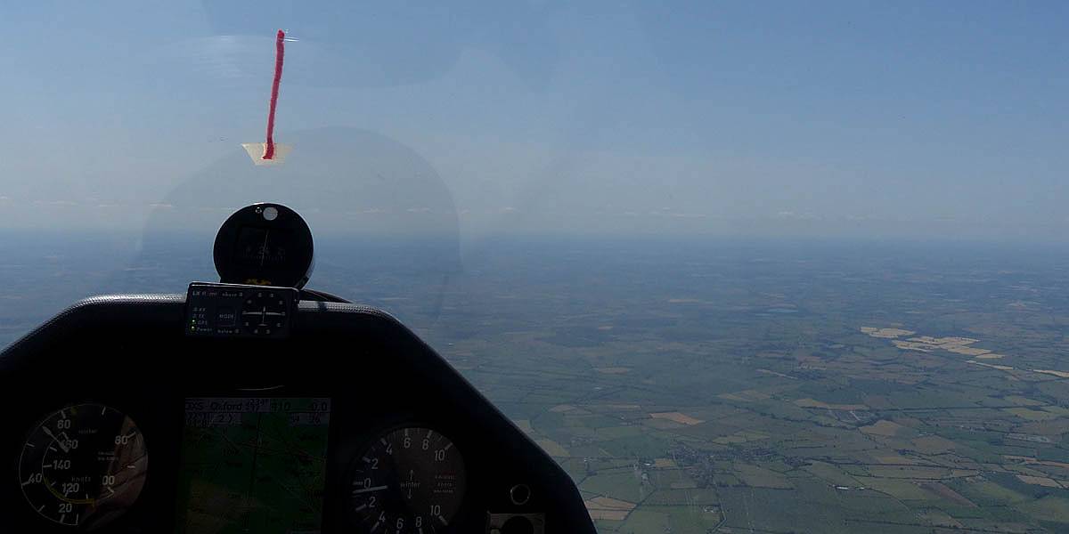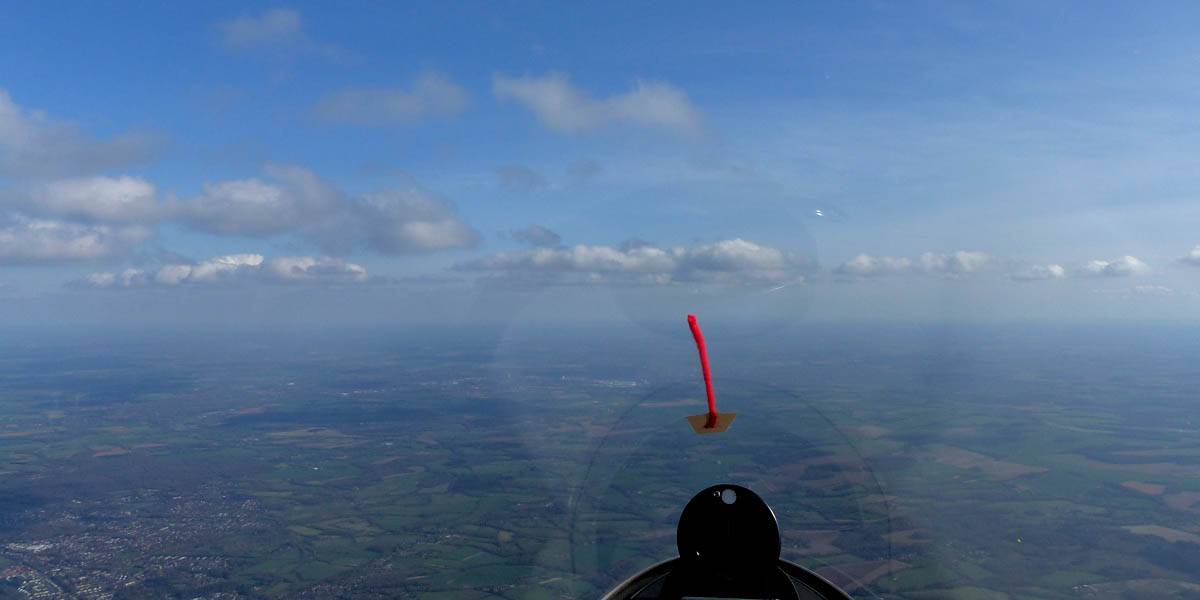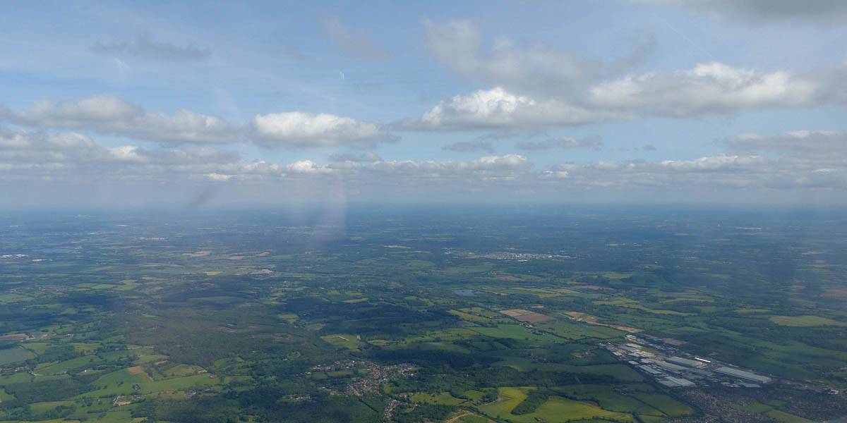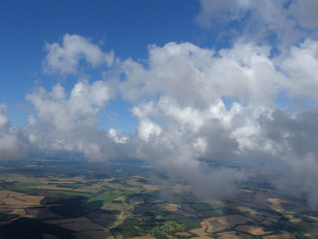 One last view near cloudbase as I head back to Lasham. | Slowly blueing out on final glide back to Lasham (passing Aldermaston to the left of me). There are still plenty of good thermals about though. |