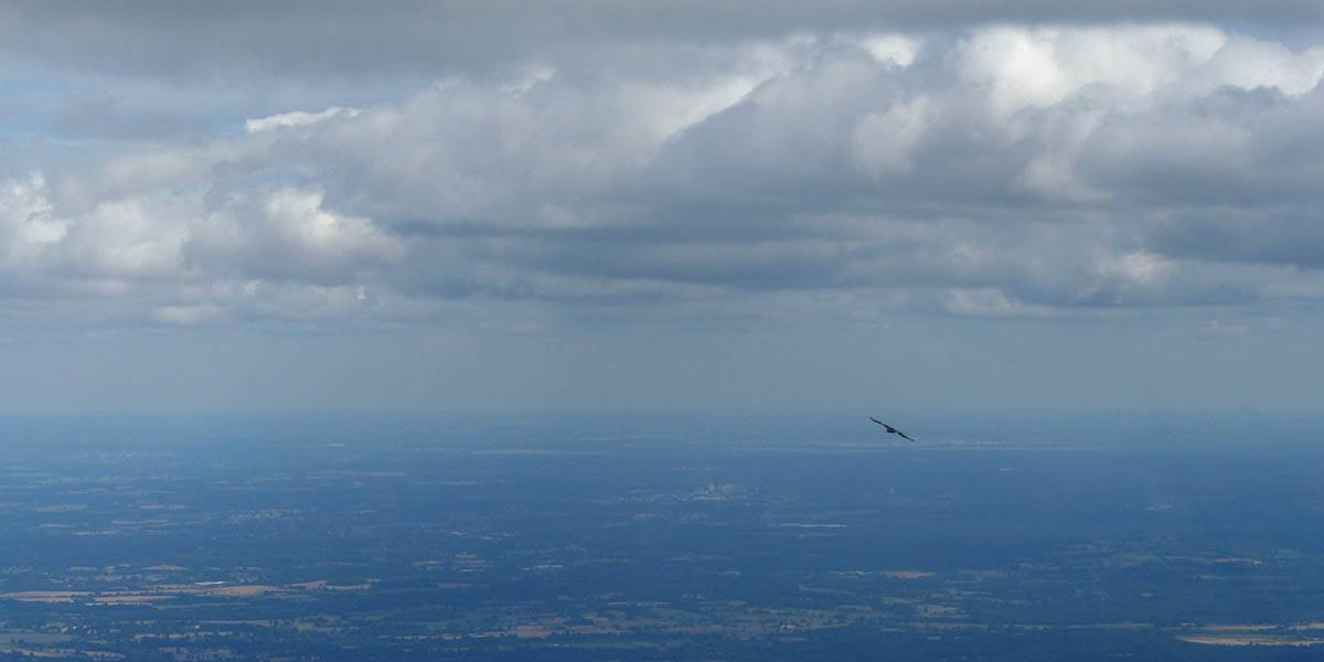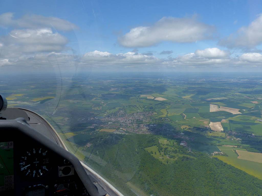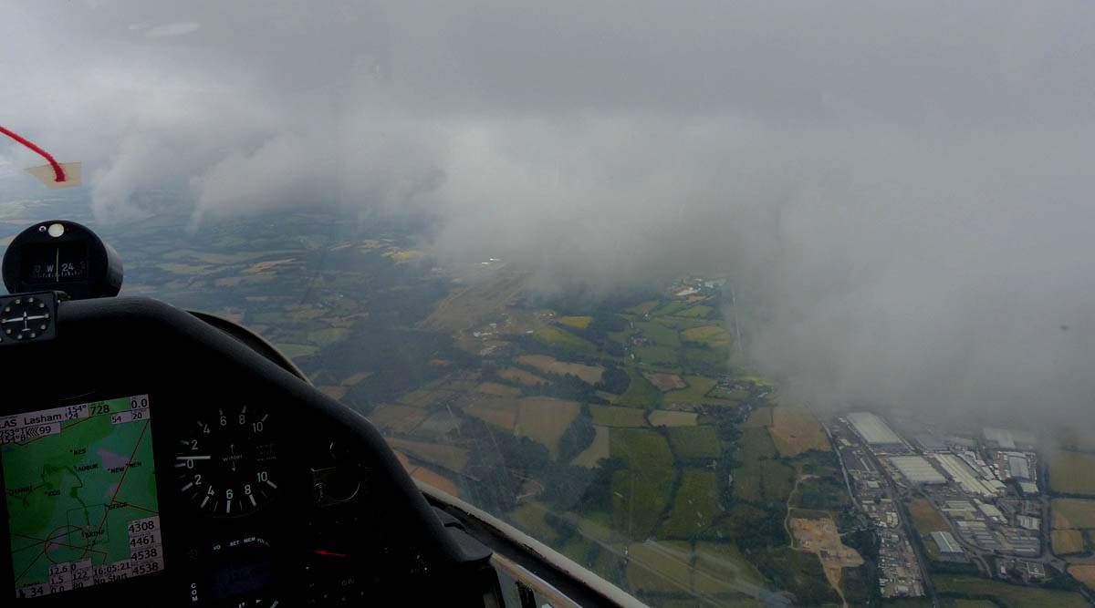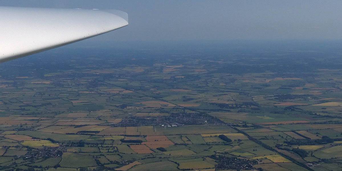One last view near cloudbase as I head back to Lasham. | Slowly blueing out on final glide back to Lasham (passing Aldermaston to the left of me). There are still plenty of good thermals about though. |