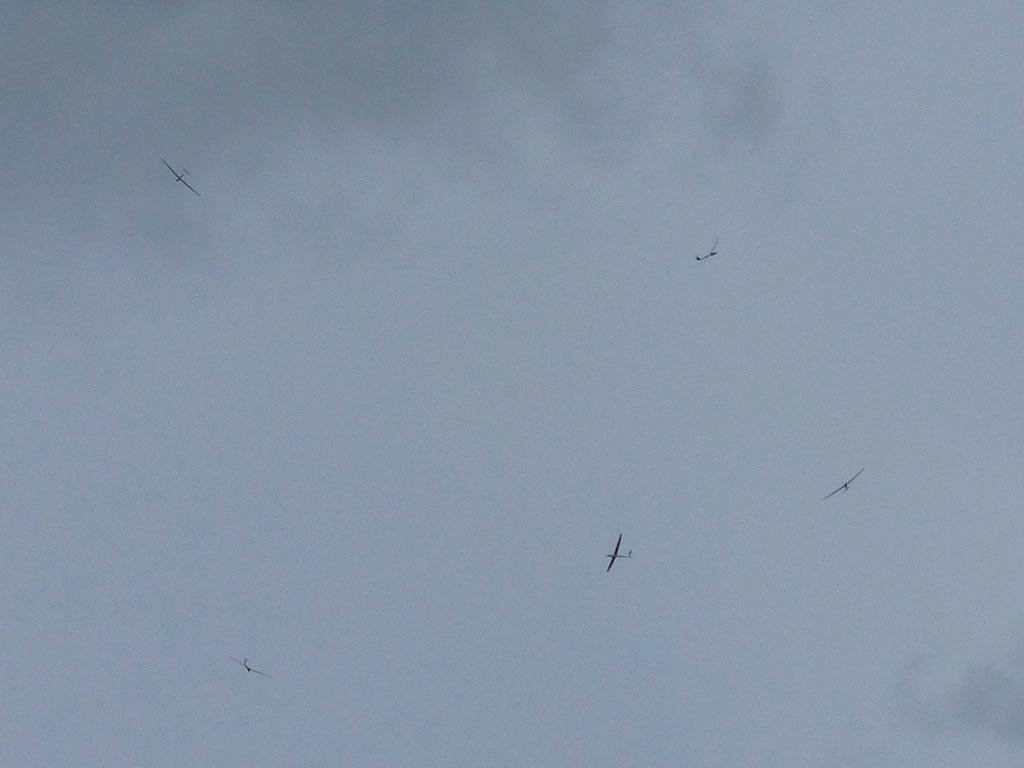 Gliders at the launch point. | Soaring above. | Glider FBV ridge soaring above Pascombe Pit. | Looking South along the downs from above Pascombe Pit. | Glider FBV beating up the ridge some more. | Glider FBV back on the ground. |