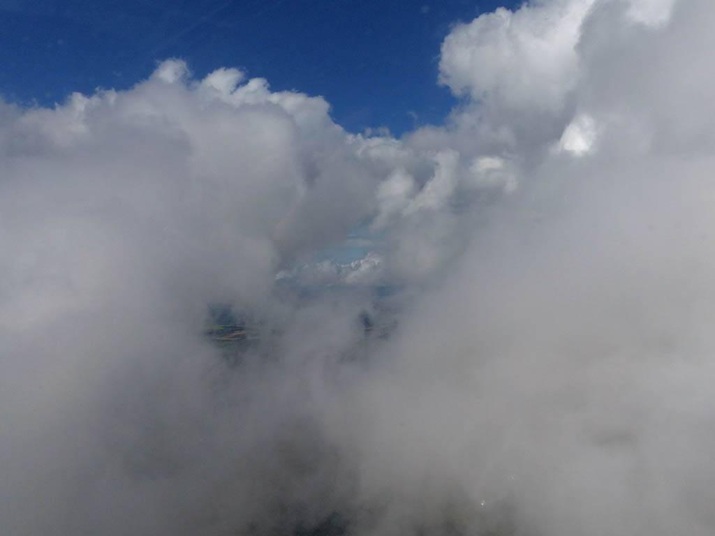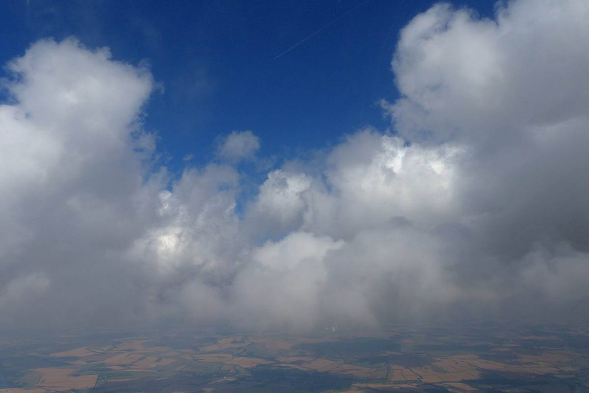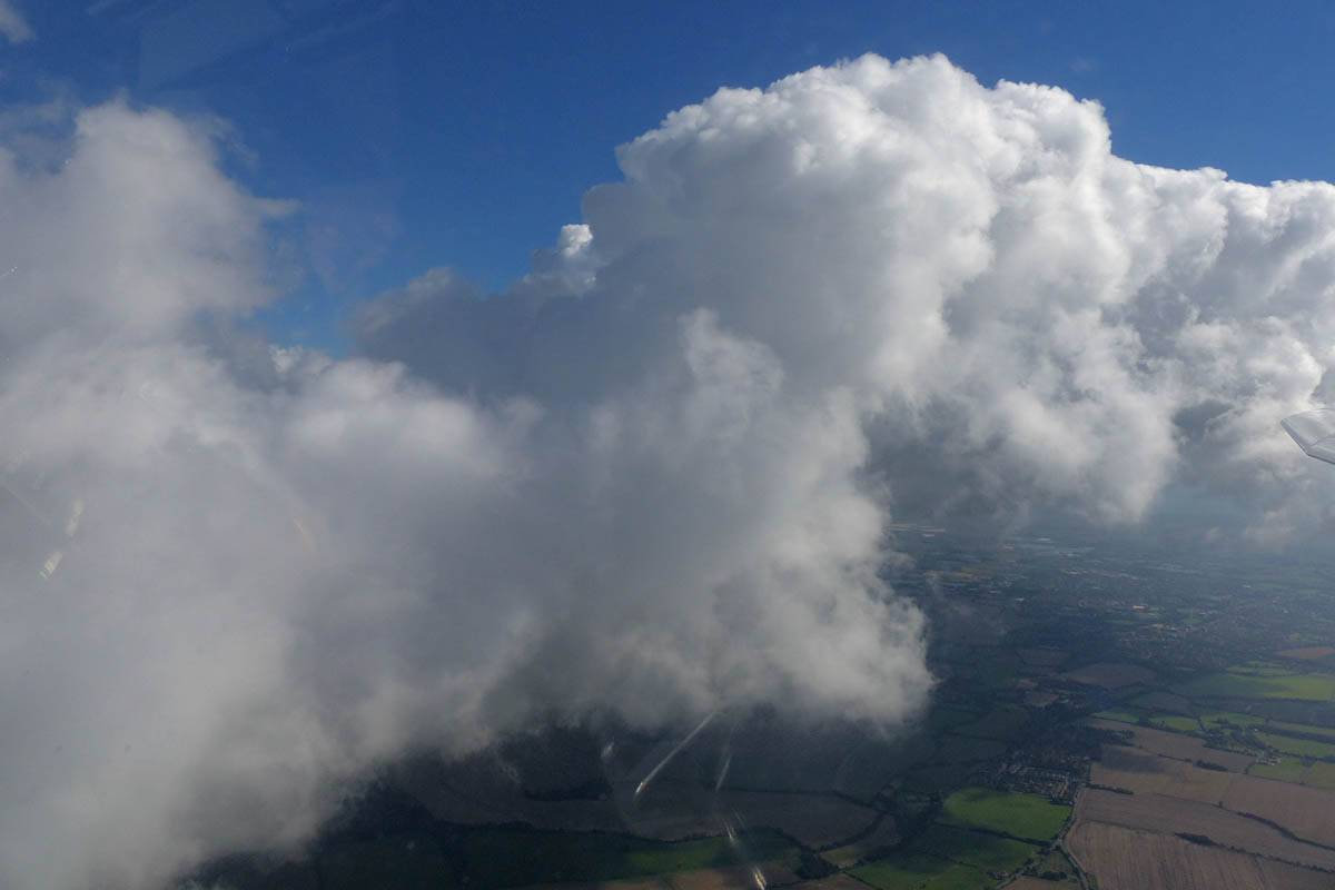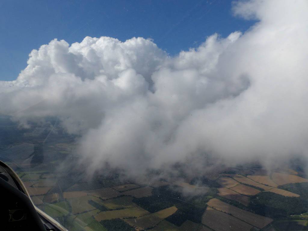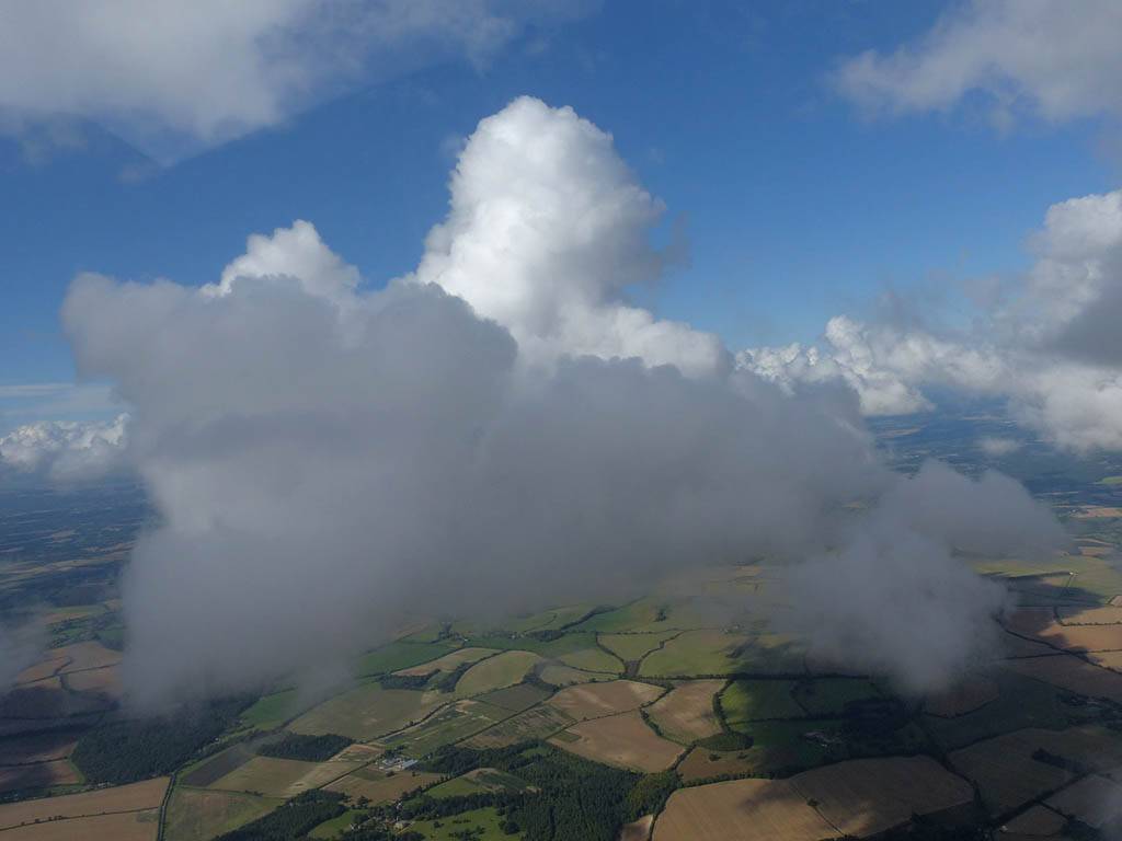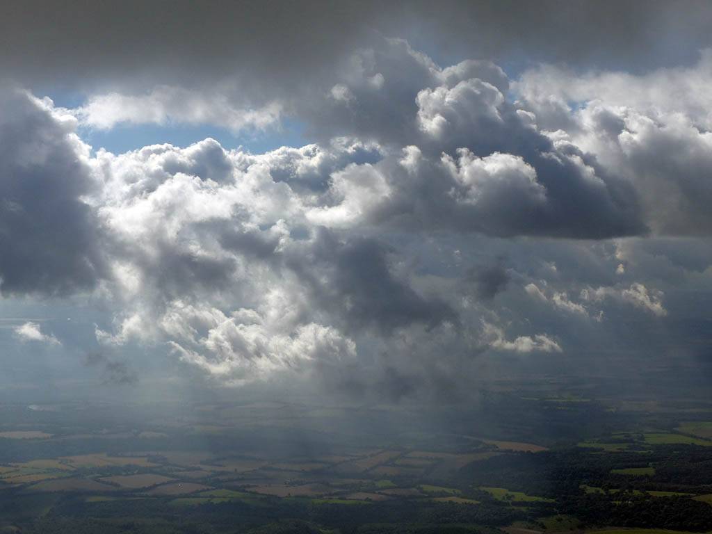 A cloud jelly bear waving at me. | Another view as I descend past the cloud tops. | Clouds growing over Lasham airfield. | Upwind showers are building, providing more heavenly views. Photoshop Elements' highlights and shadows tweaking tool rescued these from very high contrast to bring them in line with what my own eyes saw. |