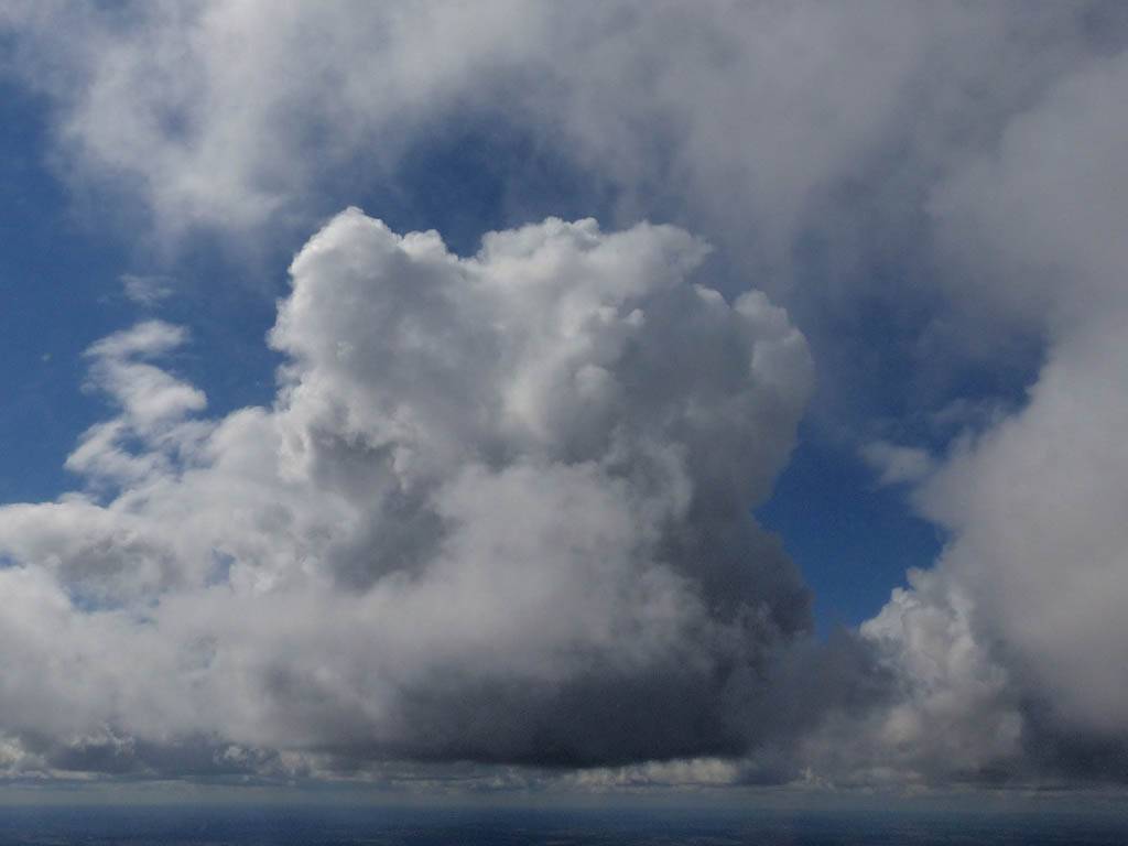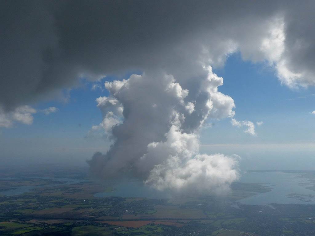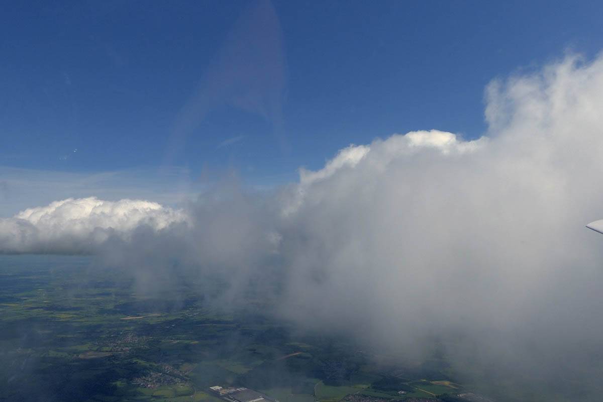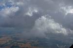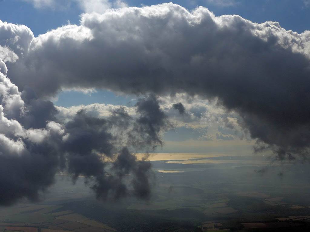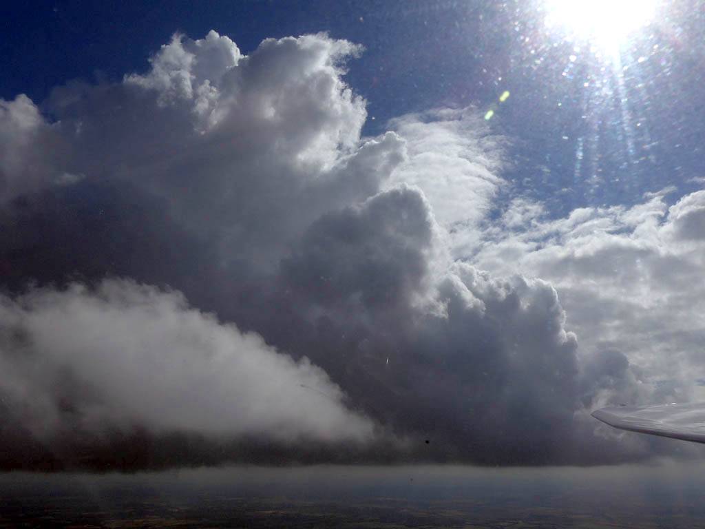 A cloud jelly bear waving at me. | Another view as I descend past the cloud tops. | Clouds growing over Lasham airfield. | Upwind showers are building, providing more heavenly views. Photoshop Elements' highlights and shadows tweaking tool rescued these from very high contrast to bring them in line with what my own eyes saw. |