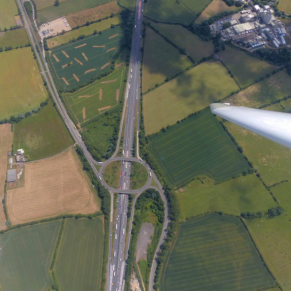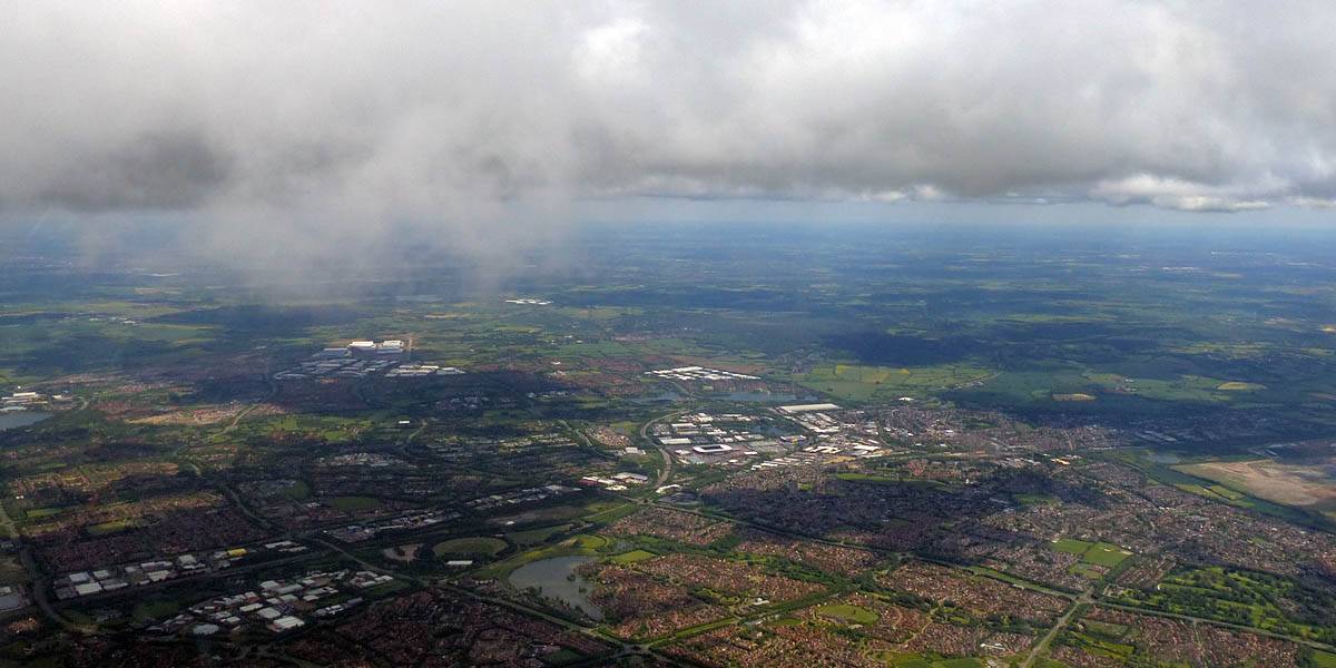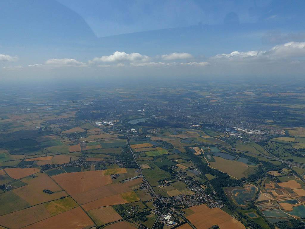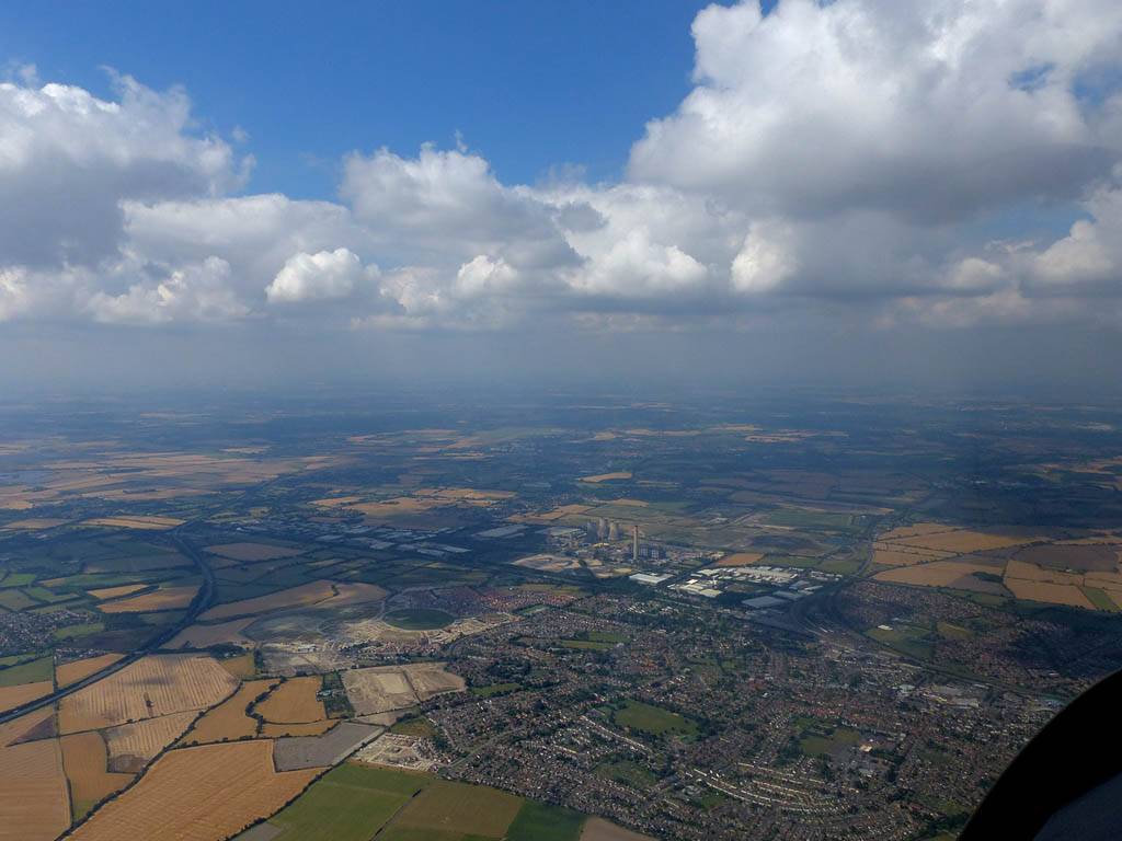 Views of Didcot and Milton Park from the West as I fly Northeast past the Wantage area. | Getting above cloudbase near Oxford. | Bicester from the South as I cross the M40. | Approaching Milton Keynes from the Southwest. Newport Pagnall in sight on the far side. |