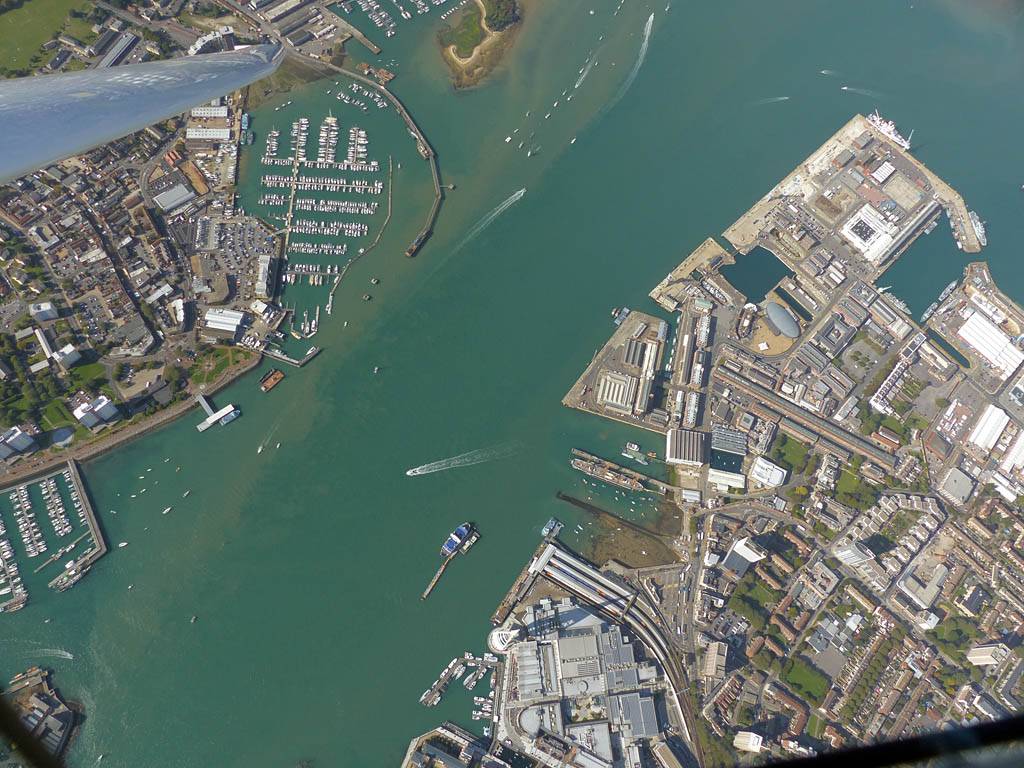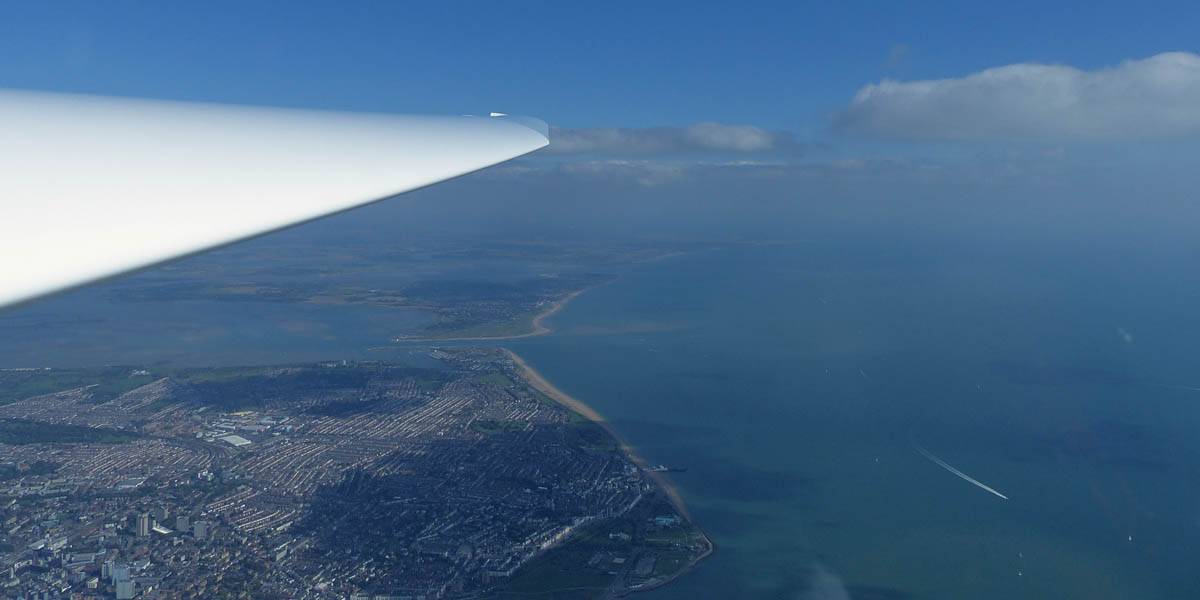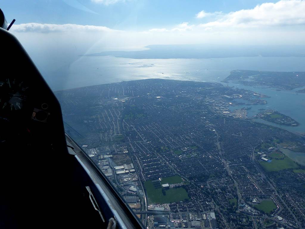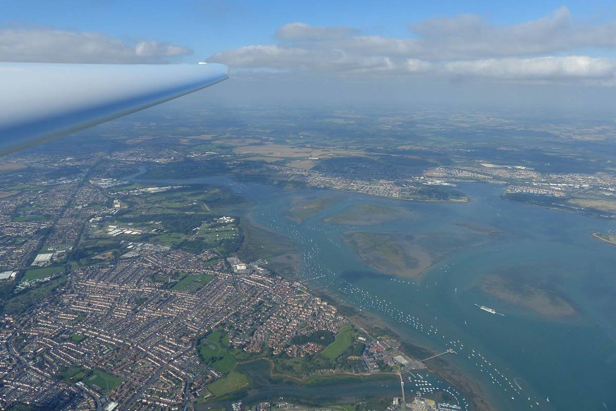 Closeups of glider JTU as we soar together over Portsmouth Harbour. | Looking Eastwards from Gosport across Portsmouth and Hayling Island. | To the West the Solent heads into Southampton airspace. | The Spinnaker Tower, which is also the PTR turnpoint. | A wider view of Portsmouth, from the West over Eastern Gosport. |
