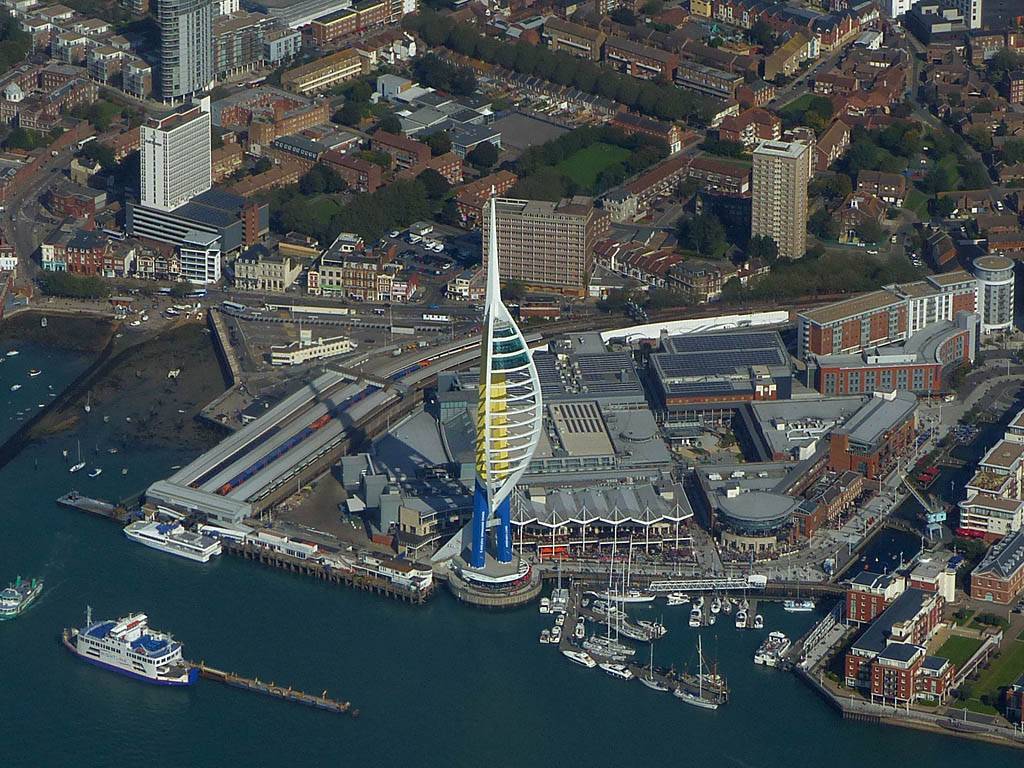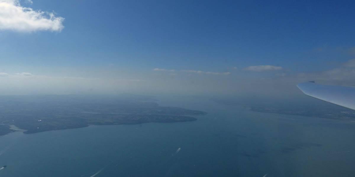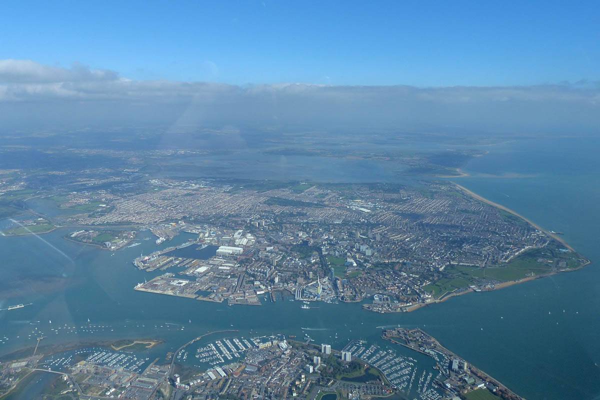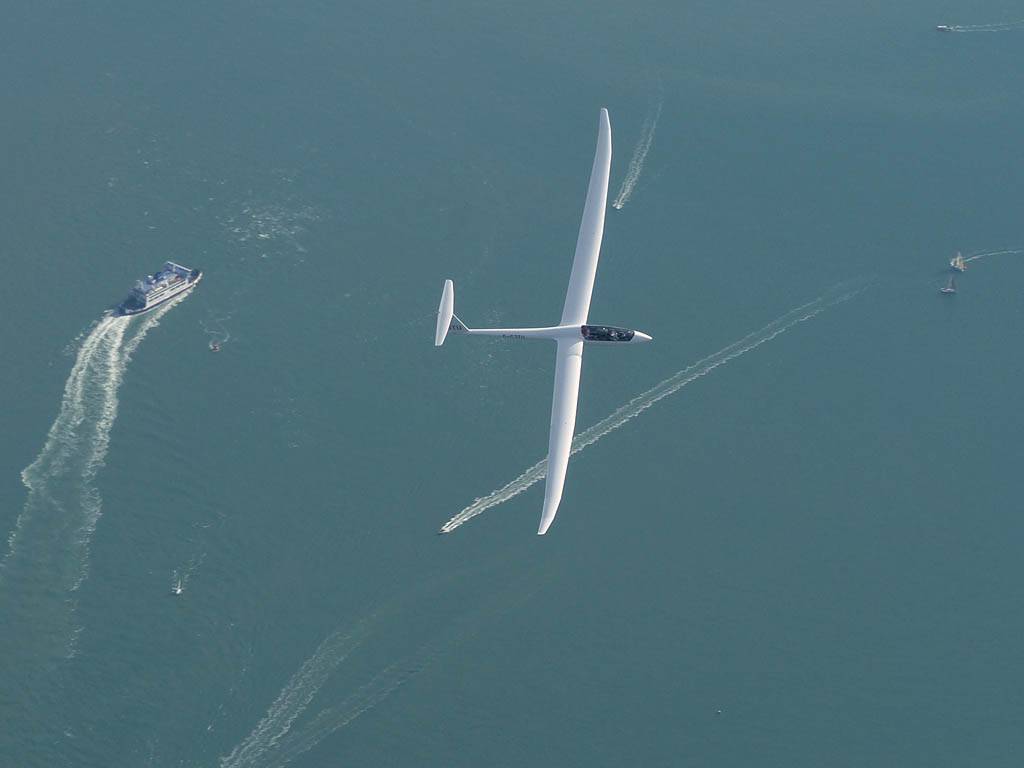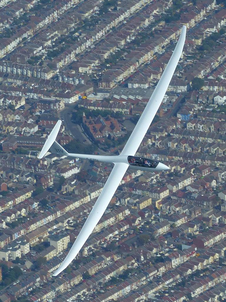 Closeups of glider JTU as we soar together over Portsmouth Harbour. | Looking Eastwards from Gosport across Portsmouth and Hayling Island. | To the West the Solent heads into Southampton airspace. | The Spinnaker Tower, which is also the PTR turnpoint. | A wider view of Portsmouth, from the West over Eastern Gosport. |