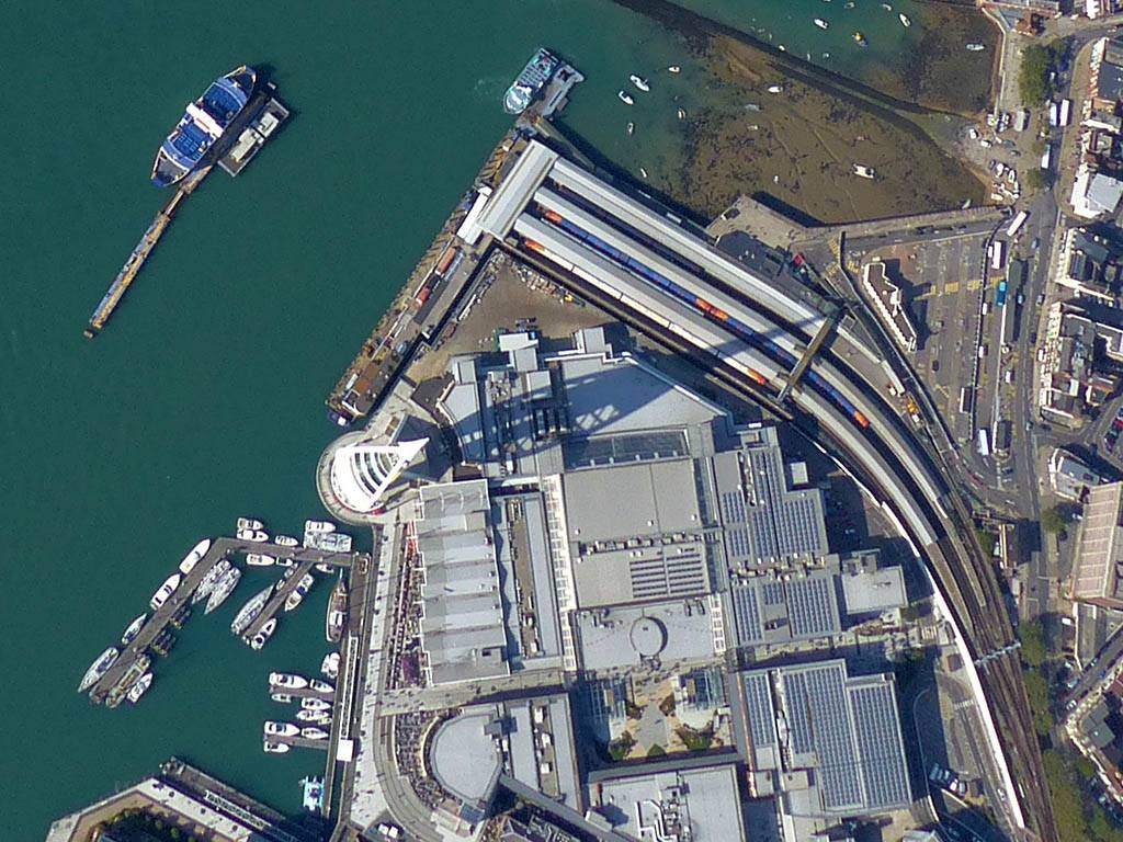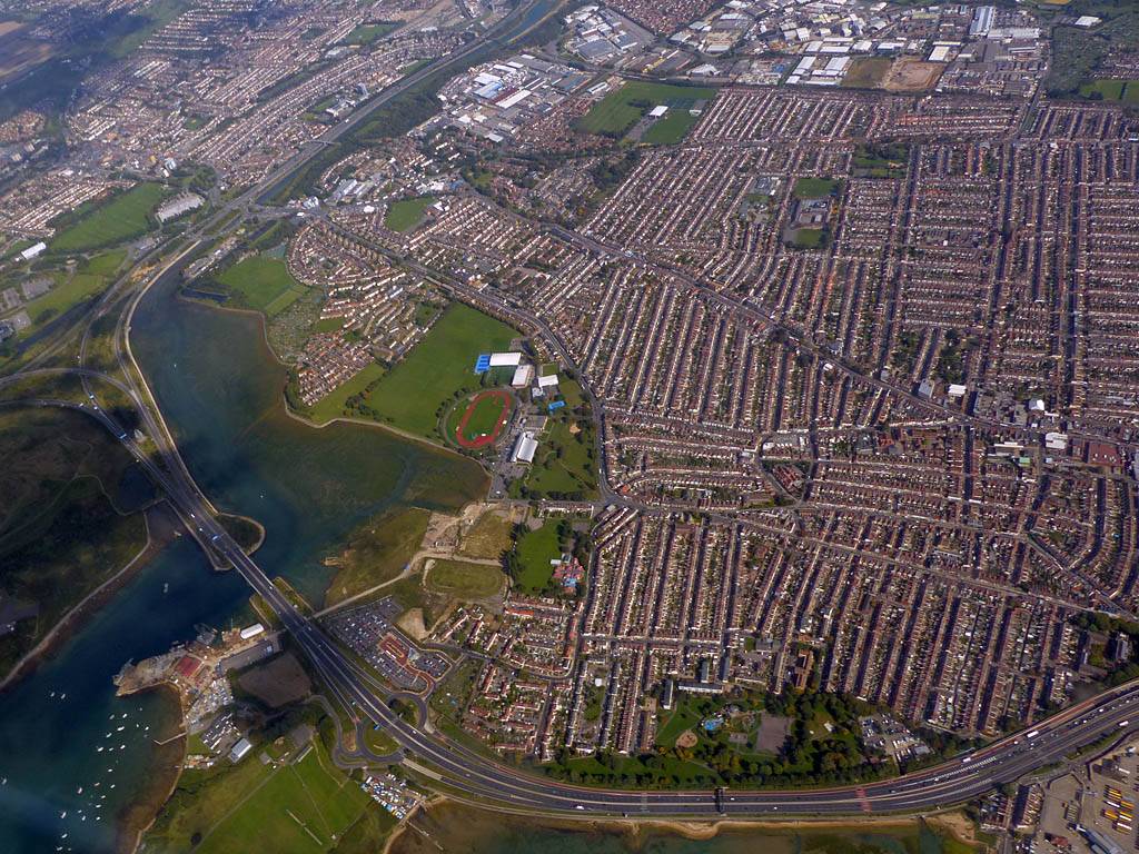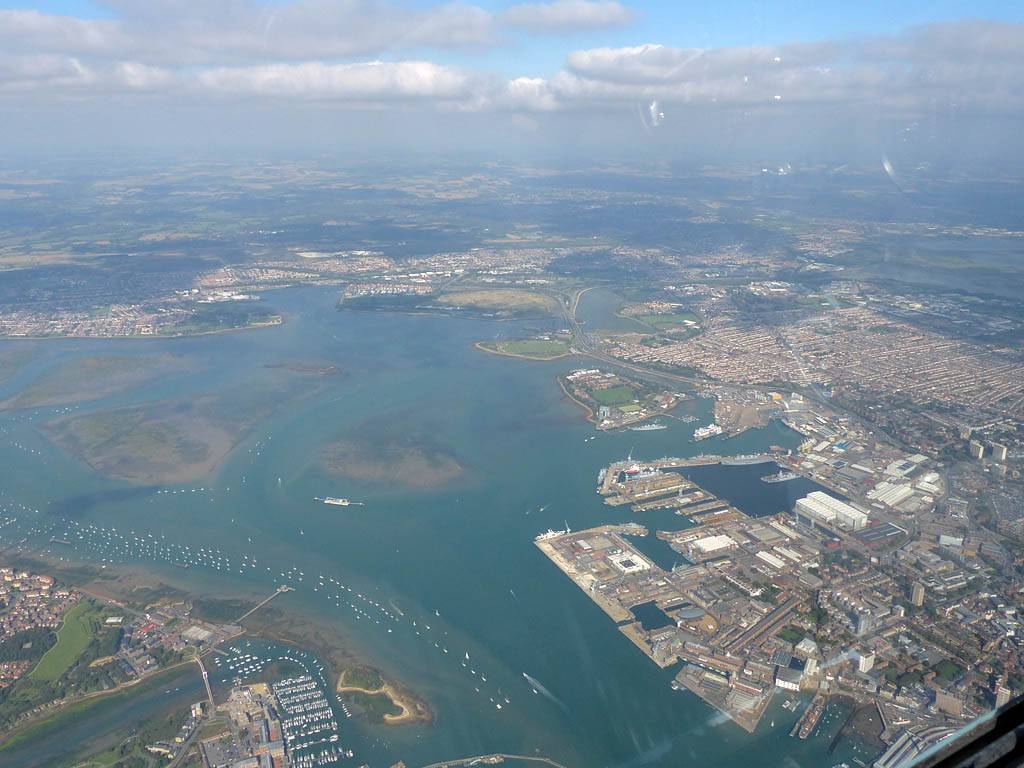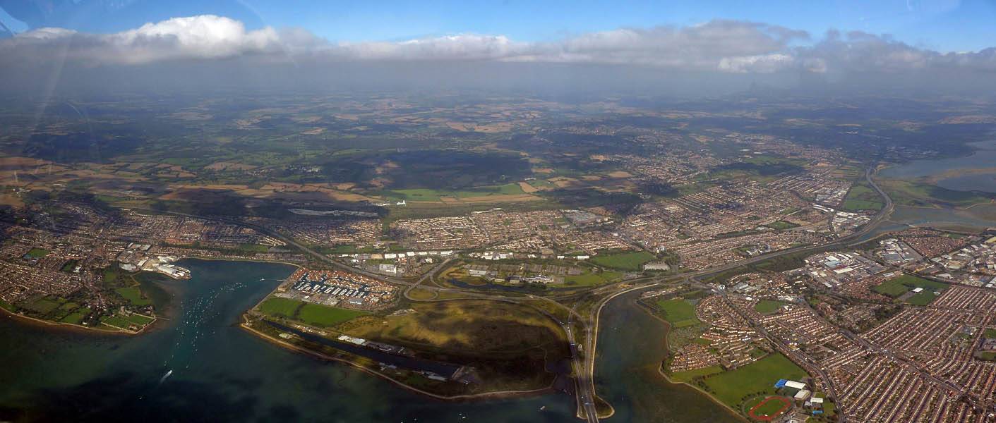 Looking down at Portsmouth Naval Base and the main ferry port. | One more panorama from over Portsmouth Harbour as I retreat inland. | Andover Southeast (ANE) from the Northeast (A303/A3093 junction). | Andover from the East as I follow a street to the AND turnpoint on the far side before returning to Lasham. |