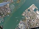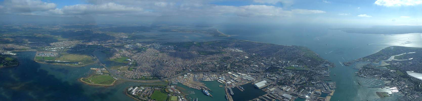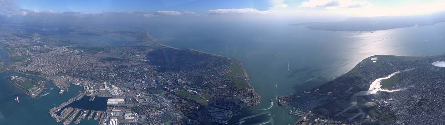 Panorama of Butser Hill nd the A3 South of Petersfield as I fly Southwards after launch. | Panoramas of Hayling Island, Portsmouth, Gosport and the Isle of Wight beyond as I approach the A27. | Flying over to Portsmouth. | Looking down Eastwards at Portsmouth and the M275 motorway from over Portsmouth Harbour. |