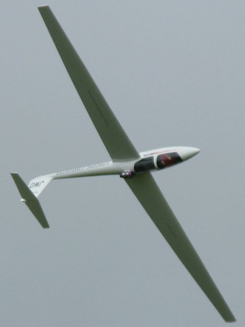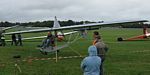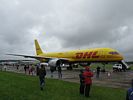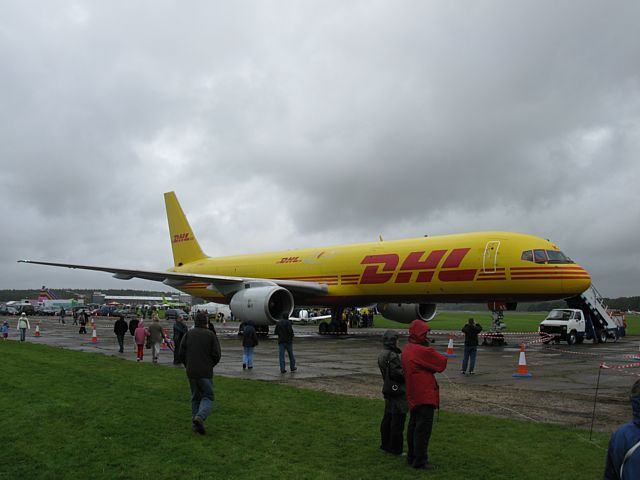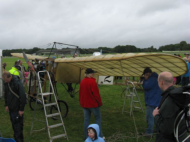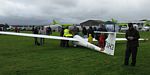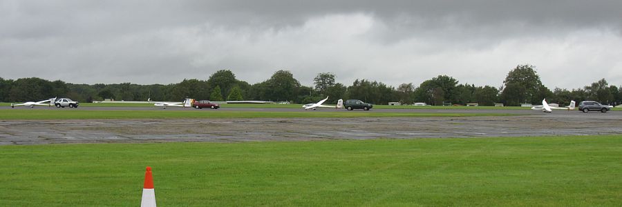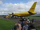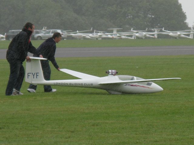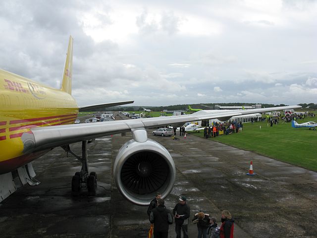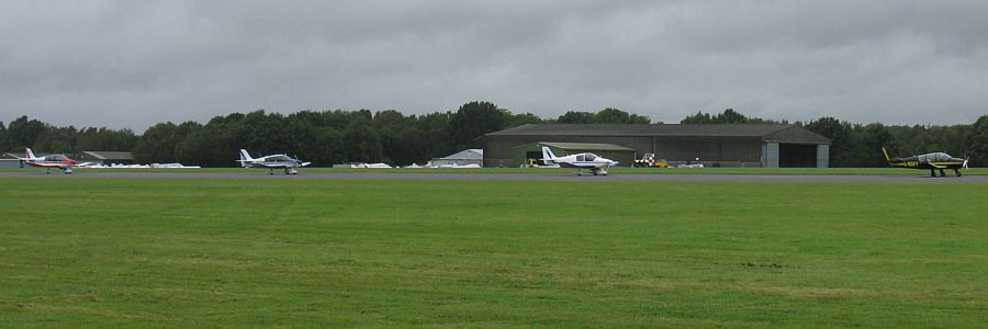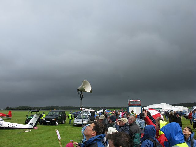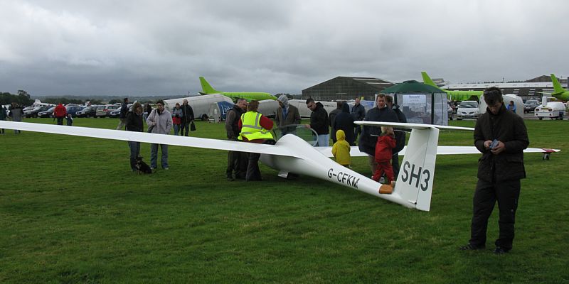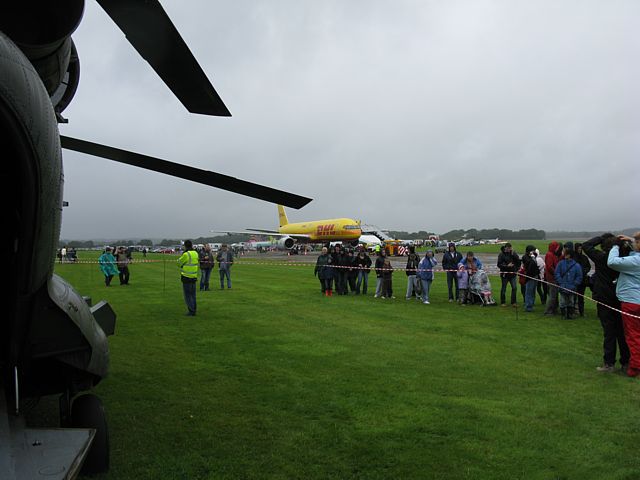 P51 Mustang parked up. | Looking across the centre triangle as people arrived. | Bleriot Xi replica. | Lots of people showing an interest in SH3, one of the club Discus's. | The DHL 757 freighter arriving. | The Chinook arriving in heavy rain. |