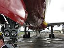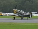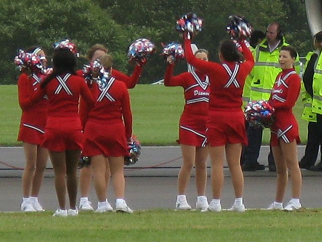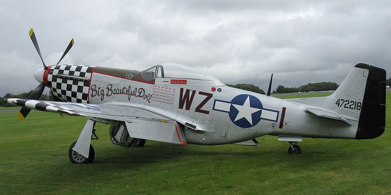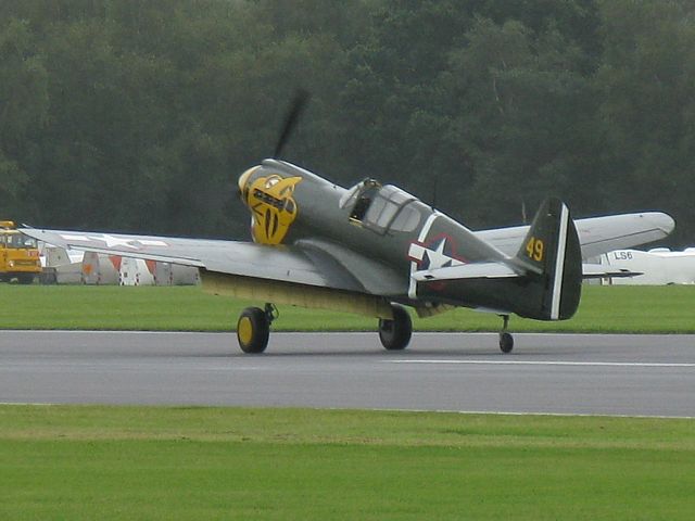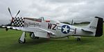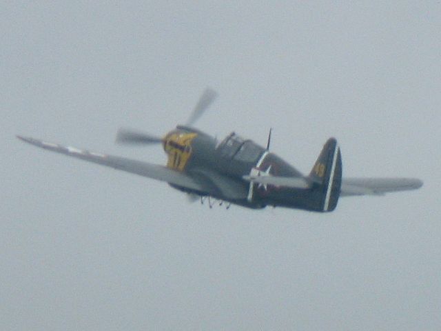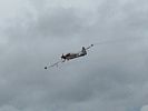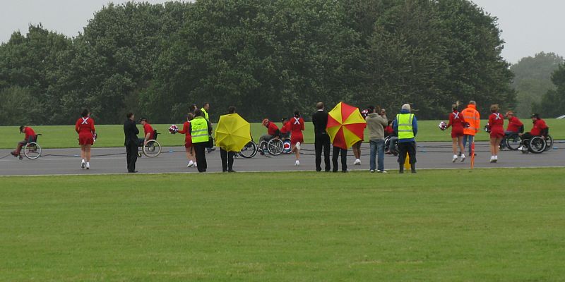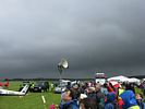 Dark clouds and rain were never far away. | The 757 has to be pulled 100 meters from the cone to the far right to the cone to the far left. | The wheelchair pullers and cheerleaders in action. | The P51 Mustang displaying during a welcome break in the weather. |