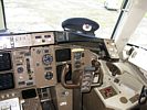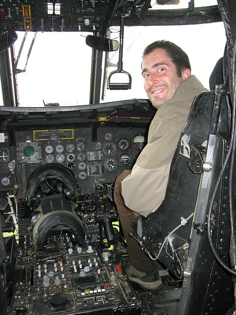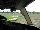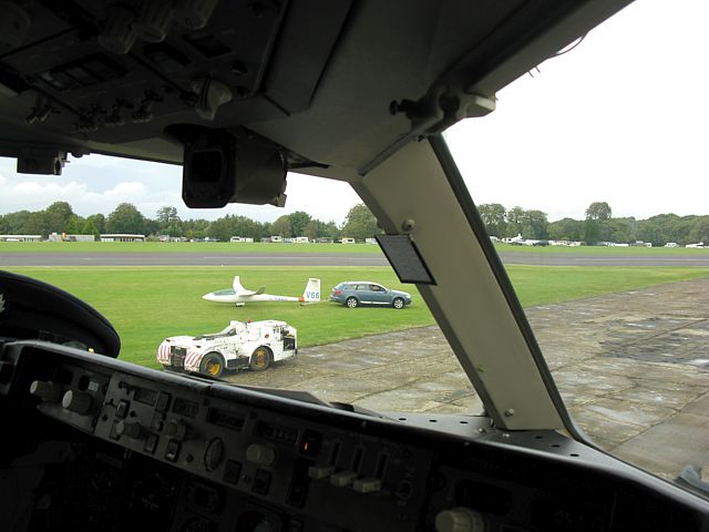 An unusual view of Lasham from the 757 cockpit. Clubhouse far left in the background. | Looking inside the 757 cockpit and sitting in the co-pilot's seat. | The chinook departing. |