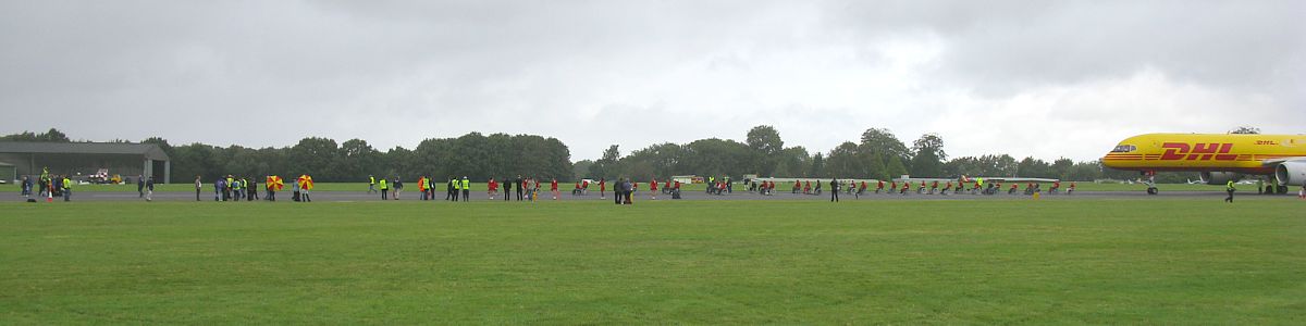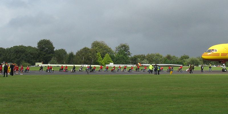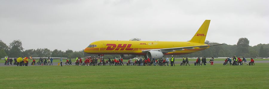 Primary on display and being 'flown'. | Two 1/3 scale models of London GC K21's with jet engines fitted! | The cheerleaders who will cheer the wheelchair pullers along. | Preparing to pull the 757. |