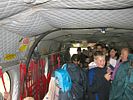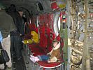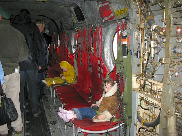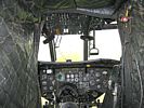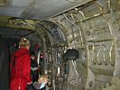 Looking inside the main cabin of the Chinook. | Views of a P40 Kittyhawk from inside a Chinook window. | Chinook cockpit. |