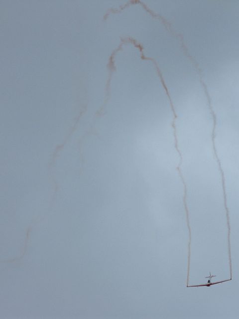 Aerobatic display by an RF4 plane with smoke guns on its wingtips. | CAP 232 with a smoke gun taking off. | Looking at the crowdline from the steps into the 757 cabin. | CAP 232 with a smoke gun performing. | Looking at the crowdline from the steps into the 757 cabin. |