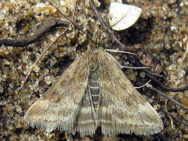 Bordered White moth (3-4cm wingspan) resting wings closed on a Hazel tree. There are pine trees nearby, which could be its food plant. |