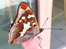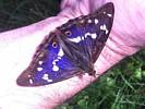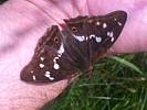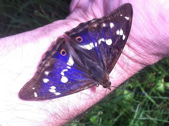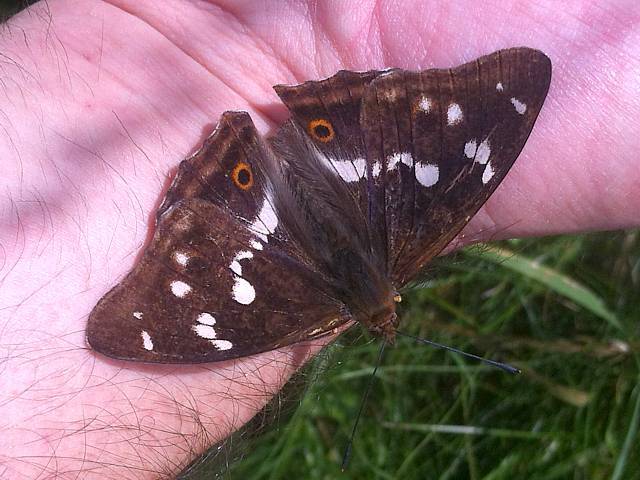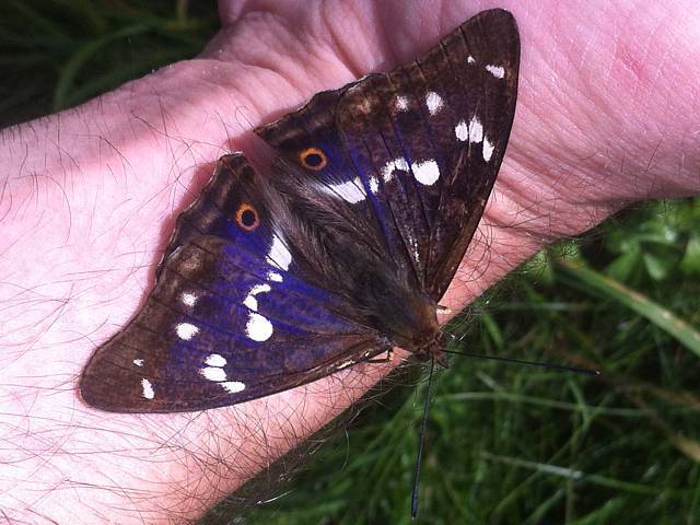 Male Chalkhill Blue. Slightly overexposed but not a bad closeup for an iPhone camera. | Male Purple Emperor sat on my finger. | Male Purple Emperor basking on my arm. Adjusting its angle to the sun reveals the amazing irridescence in its wings. |