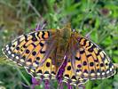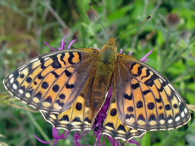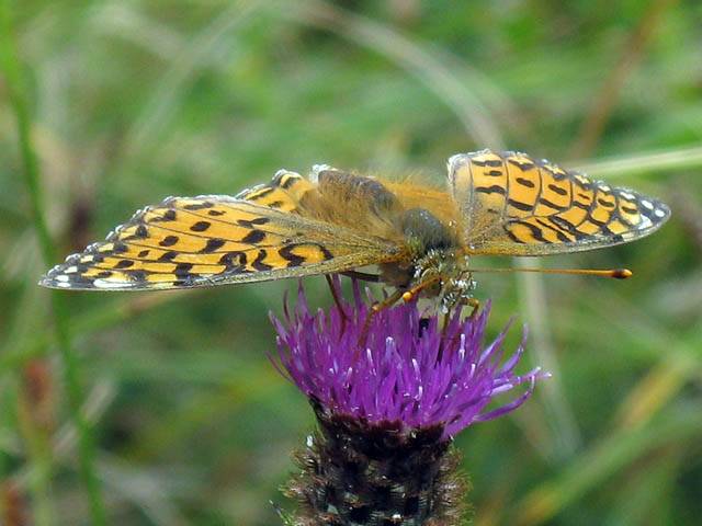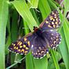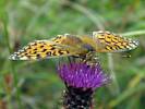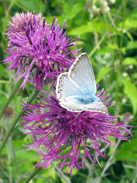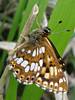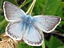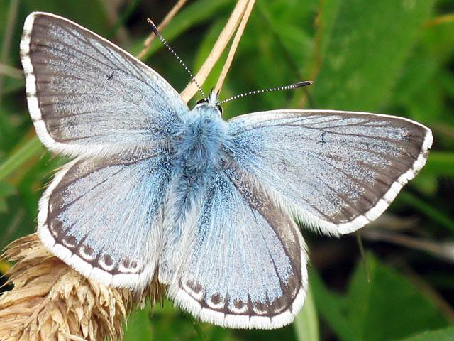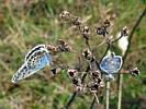 Two slightly tatty Dark Green Fritillaries. | Two fresh Chalkhill Blues. |