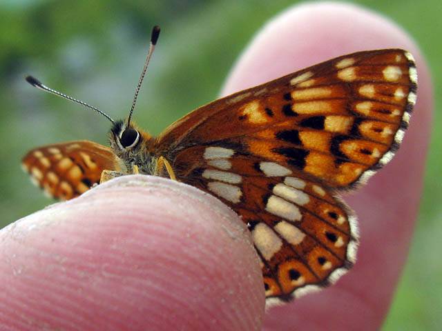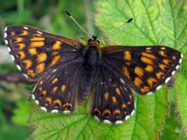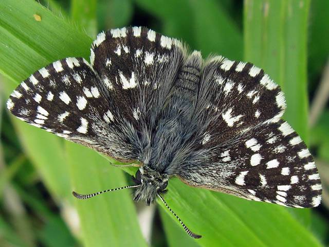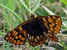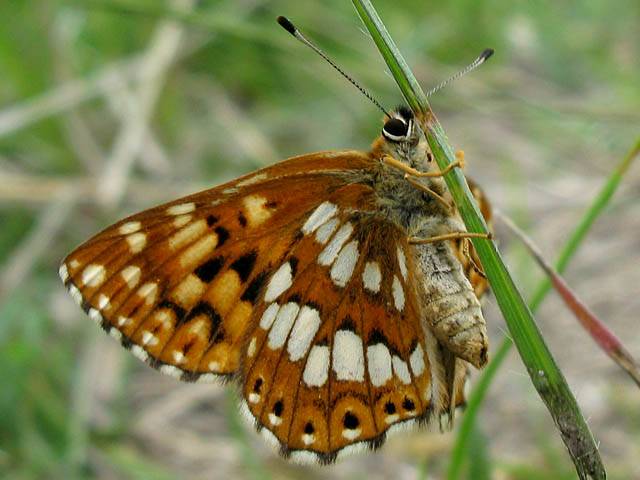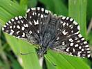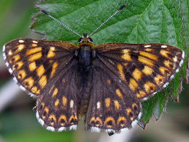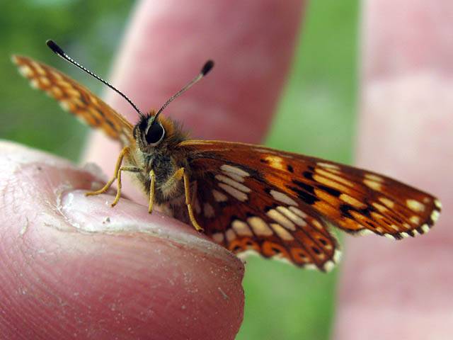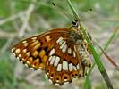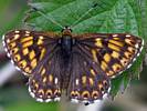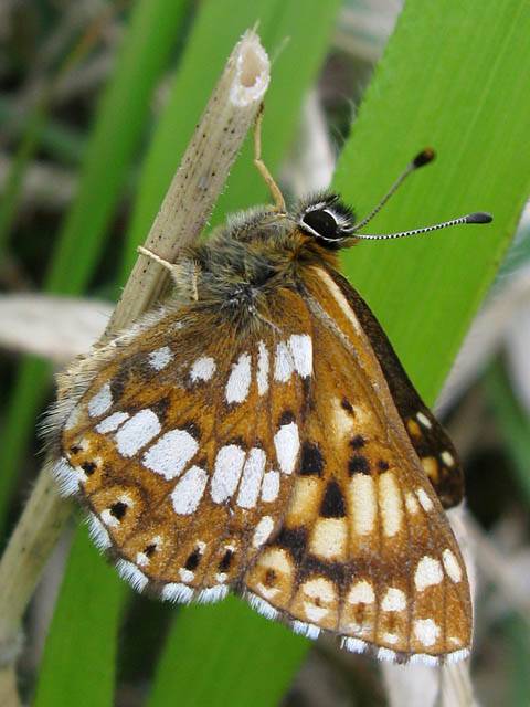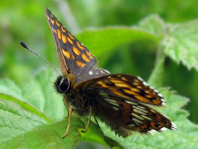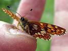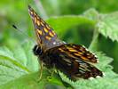 4 shots of a Female Duke of Burgndy. See how much brighter her hind wings are, as well a 6 legs compared to the male's 4. | Grizzled Skipper. |