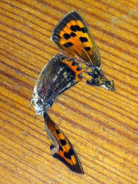 I haven't seen a live Small Copper all year. But they've definitely been around. During a clean of the motorbike I found these remains stuck under the fairing. I guess from late summer time. Poor thing...