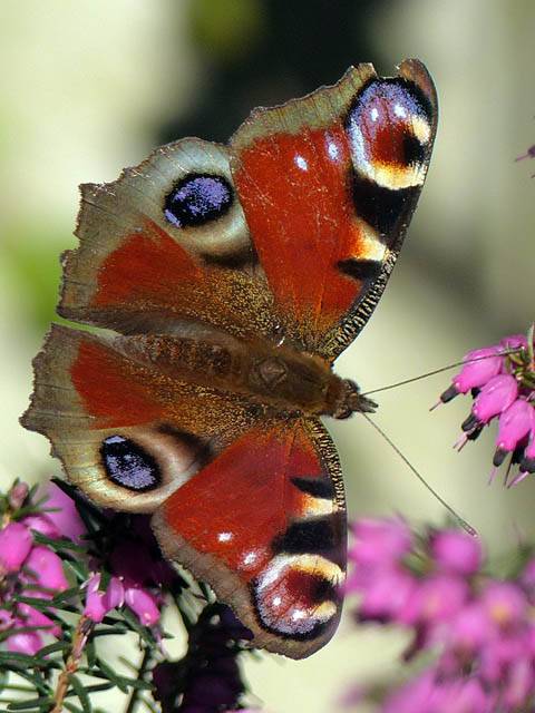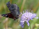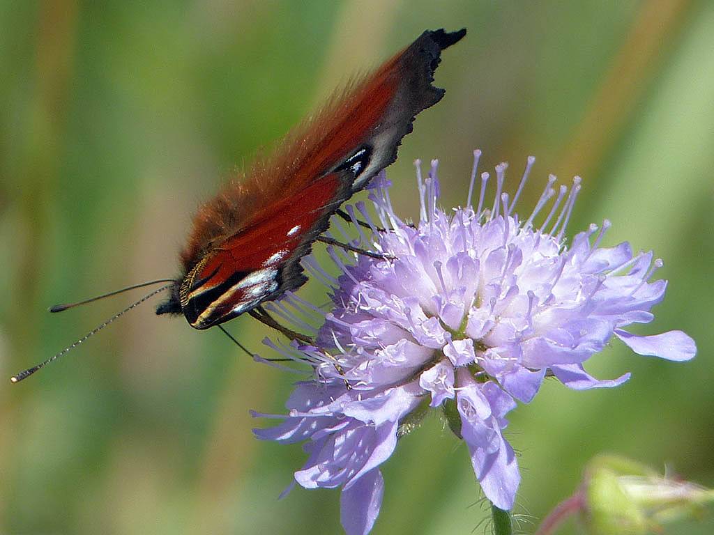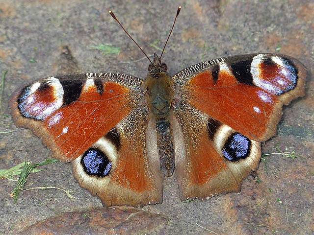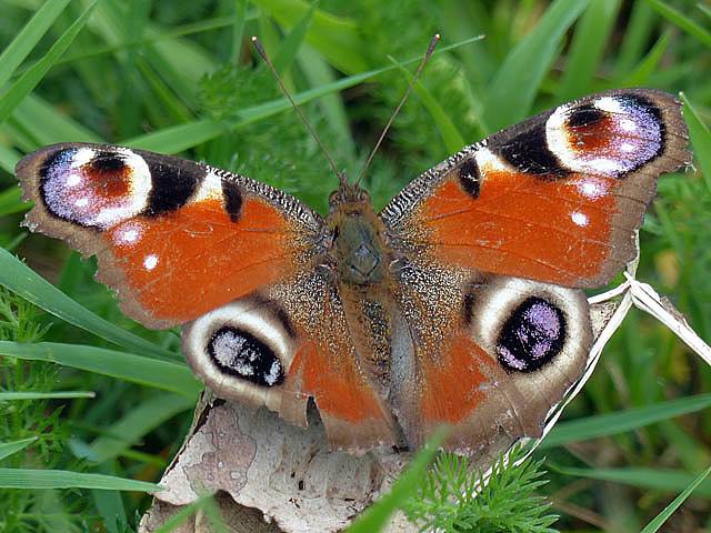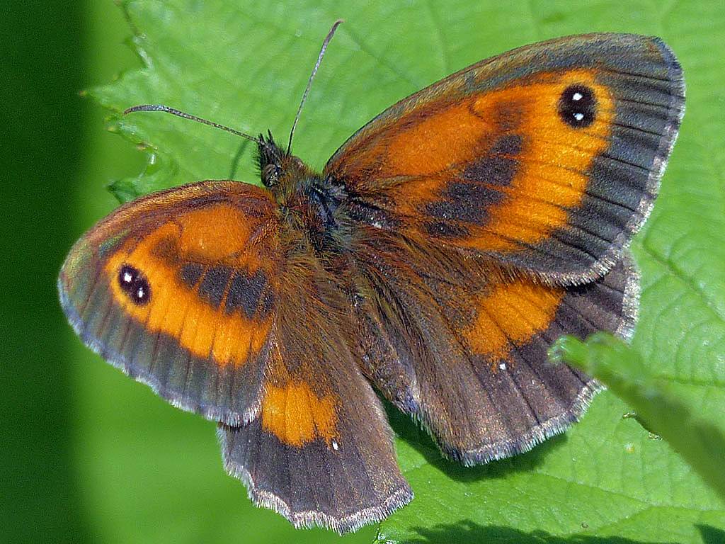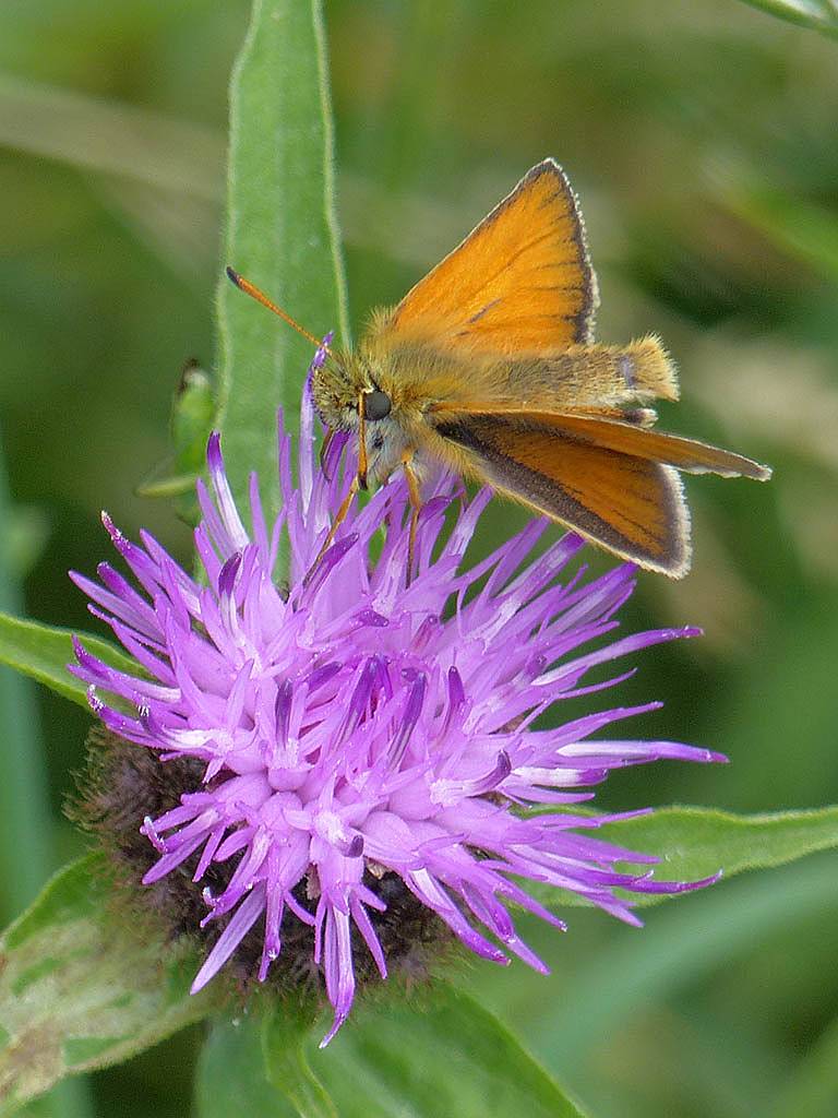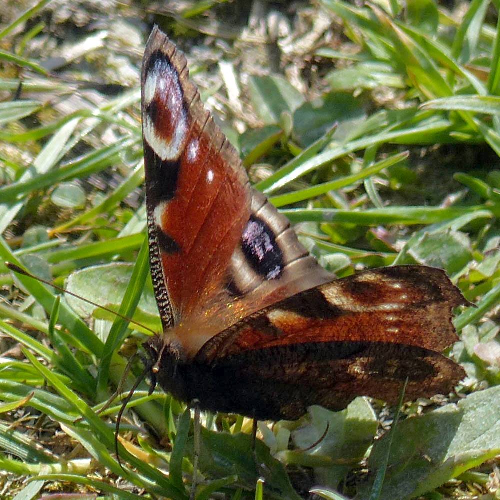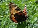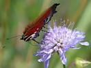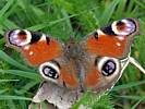 Peacock. | Small Tortoiseshell. | Male Meadow Brown. | Male Small Skipper. |