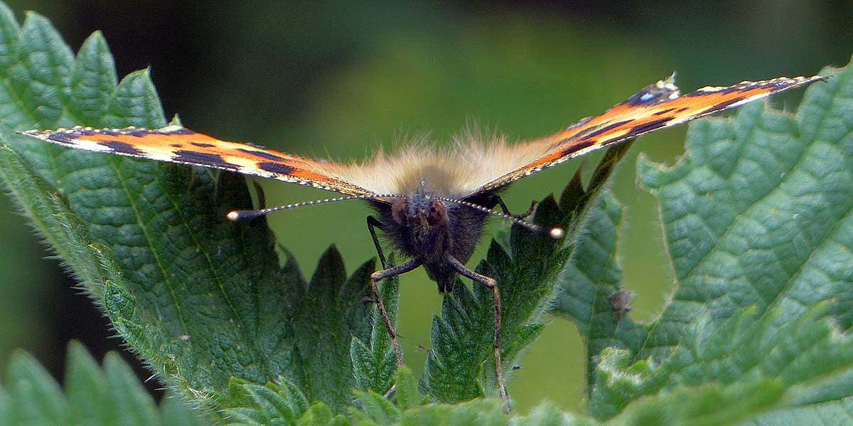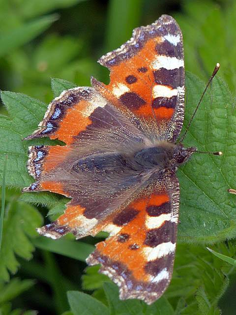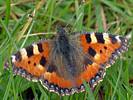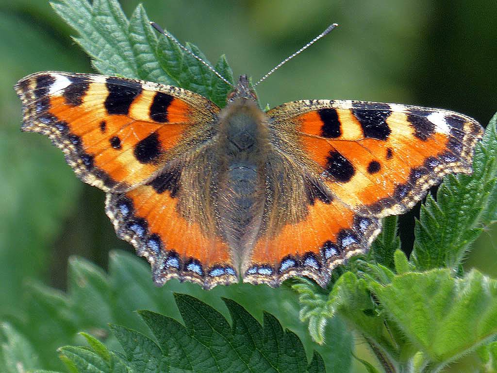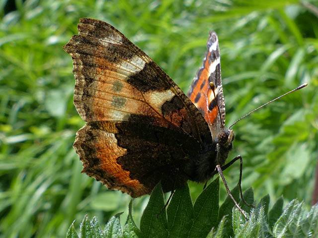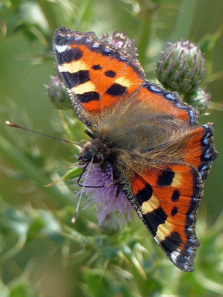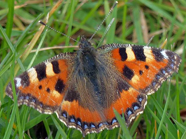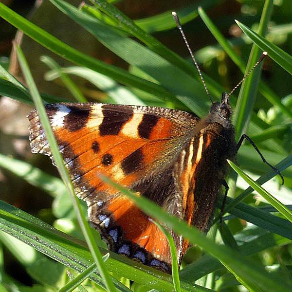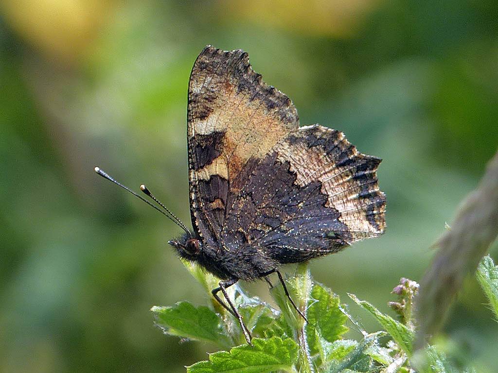 Female Small Tortoiseshell oviposting. | Elderly Male Common Blue. | Male Meadow Brown. | Red Admiral. | Essex Skipper. |