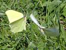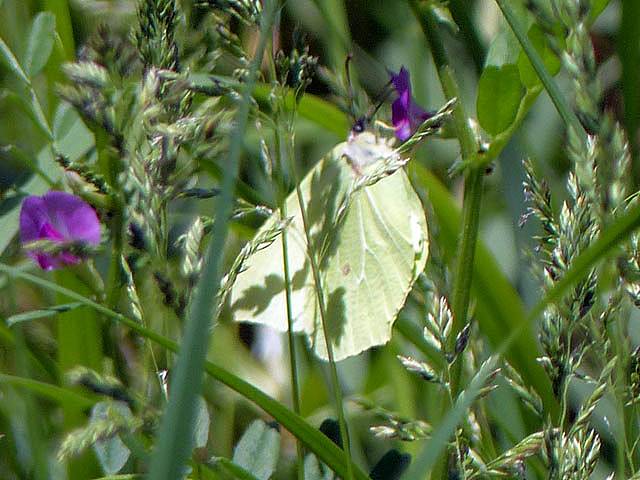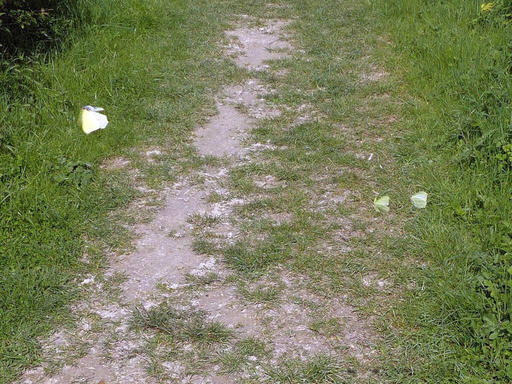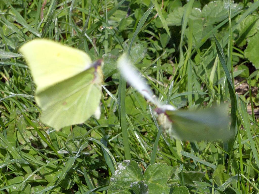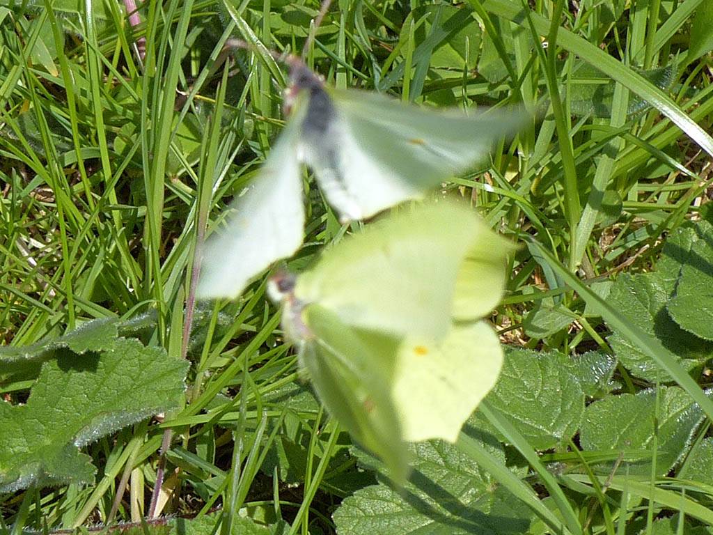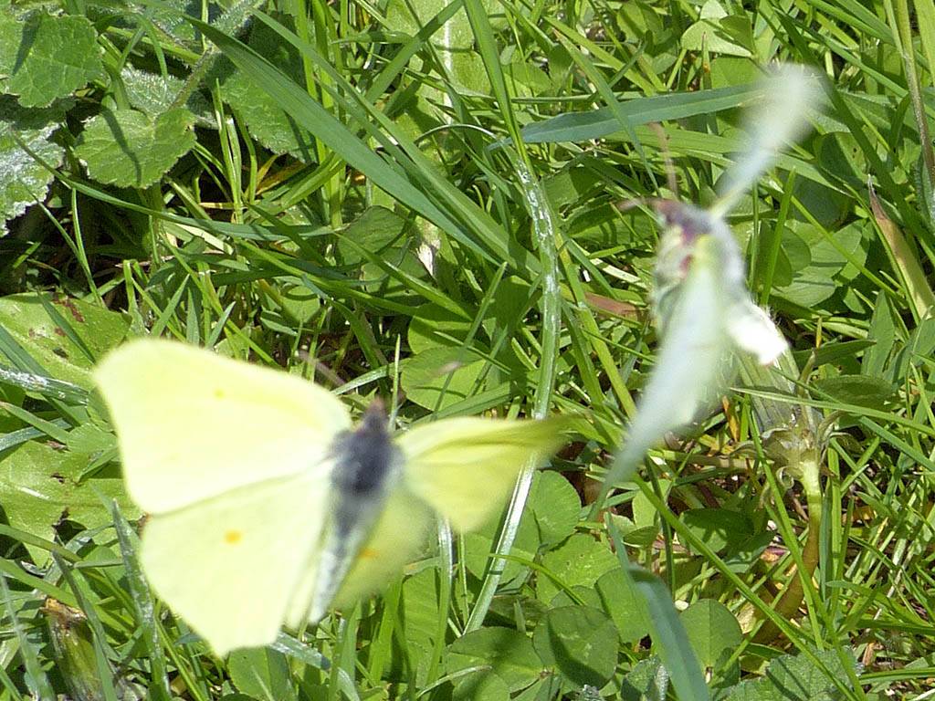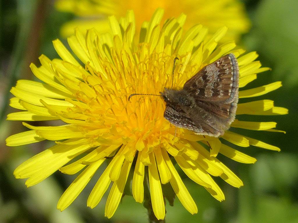 Brimstones courting across the path at Bison Hill. | The Drinker moth caterpillar. | Dingy Skipper nectaring on a dandelion. |