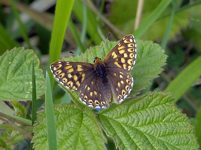 Male Duke of Burgundy. | Three shots of Grizzled Skippers. | Green Hairstreak. | Peacock. |