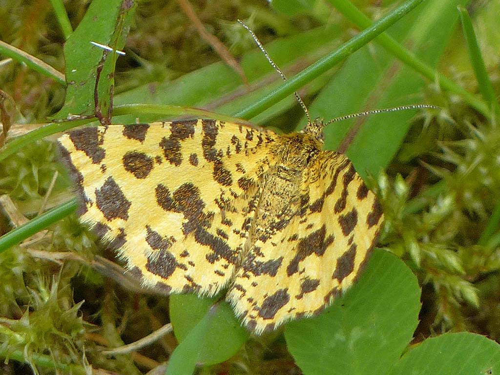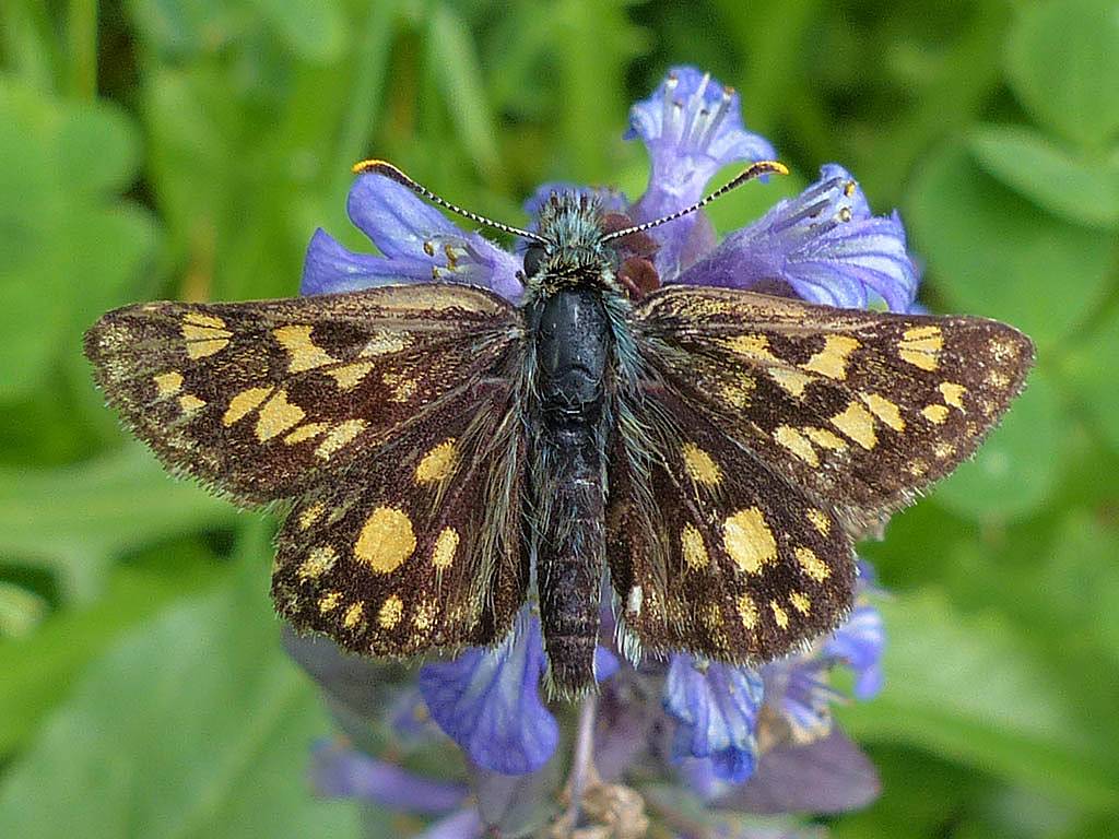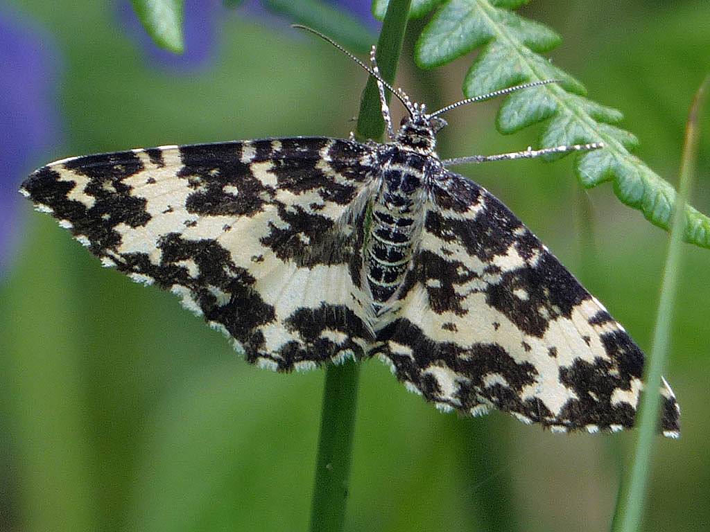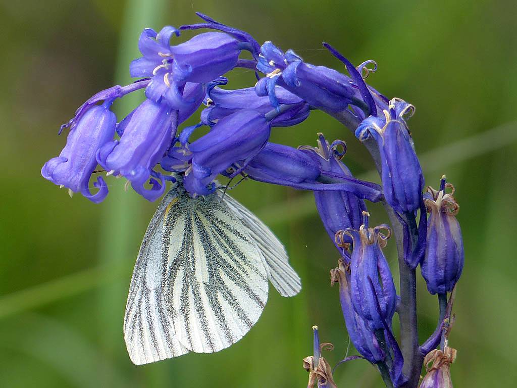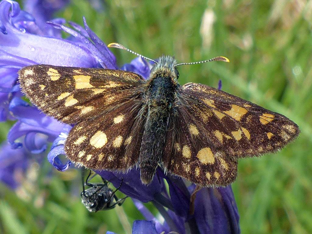 Green Veined White nectaring on Bluebells. | Common Carpet Moth. | Male Chequered Skipper on Bugle back at Ardery. | Speckled Yellow moth. | Male Chequered Skipper. |