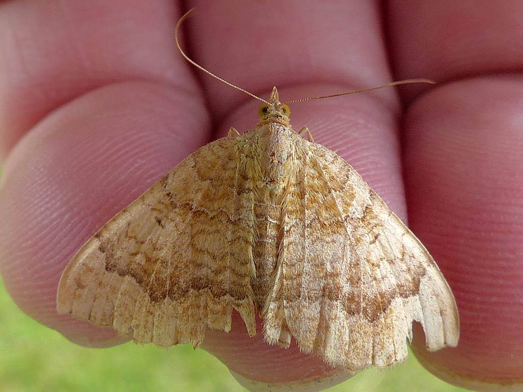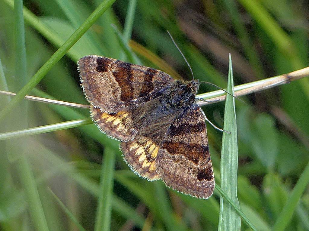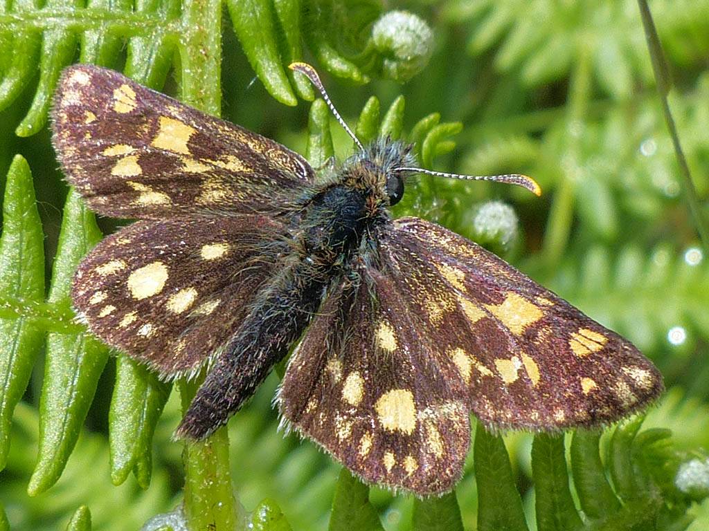 Green Hairstreak at Ariundle, Ardnamurchan. | Green Veined White on my thumb. Note how much more pronounced their veins are compared to those down South. | Another Brown Silver-line moth.. | Clouded Border moth. | Two shots of my first ever Chequered Skipper. This is a Male. |
