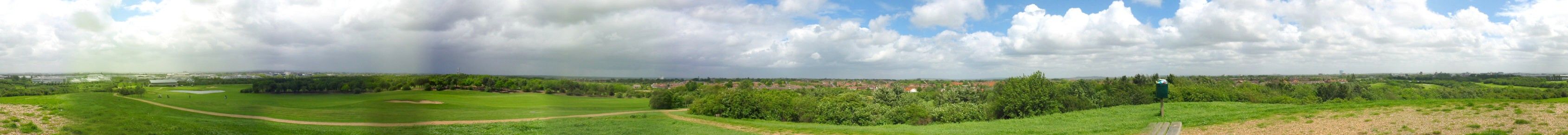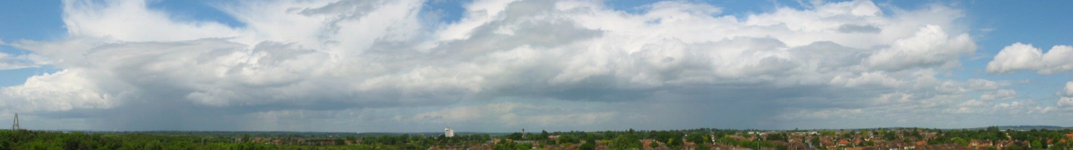 12:30pm: Clockwise 360 panarama from top of Stockley Golf Course (few miles North of Heathrow Airport) starting from South. Huge shower to West. Light levels changed rapidly (hence banding). Very windy! | Lunchtime shower cloud | 7:30pm: Rainbow |