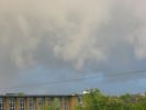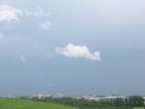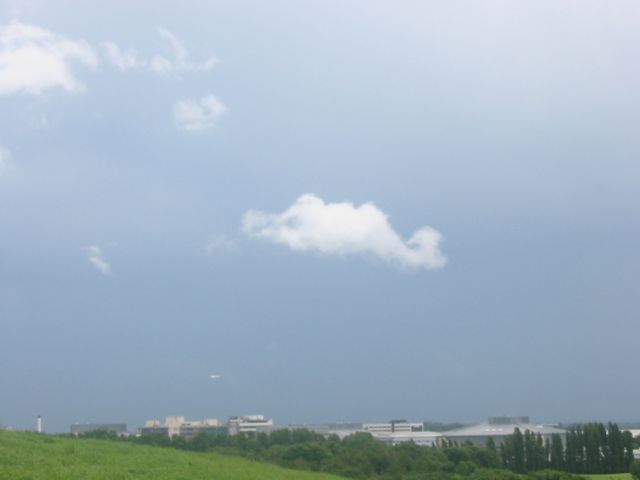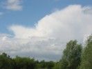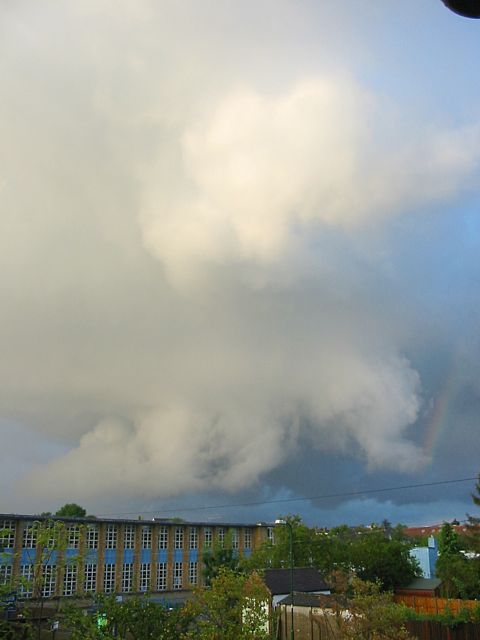 5:25pm: Huge Cumulonimbus cloud with a tower rising out the top. It got very dull and wet a short while later, with a rumble of thunder. | Strong sun shining through a very heavy shower. | And the corresponding rainbow. |