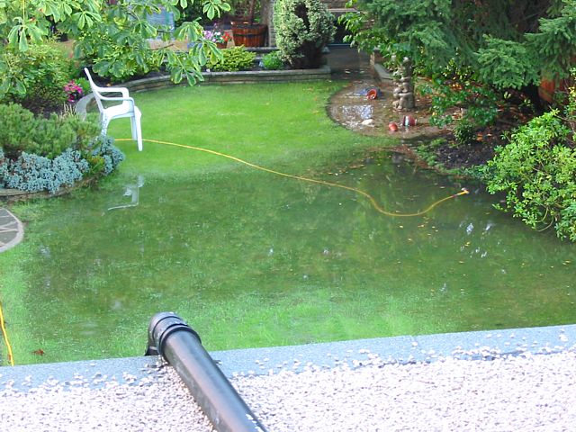Night shot of cirrus (lit up by London streetlights) behind a tree. | Flooded garden after half an hour of torrential thunderstorm. "OK who left the hosepipe on?" | Scraggy and very low cloud on the back of the storm. |