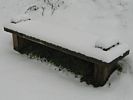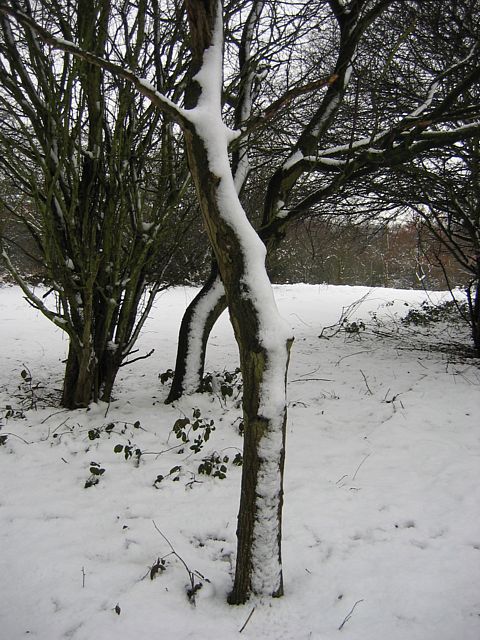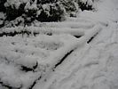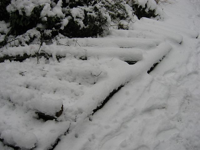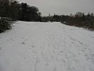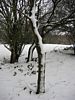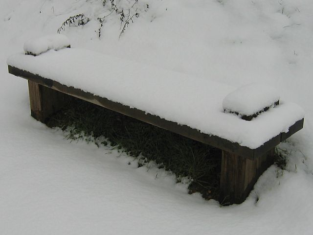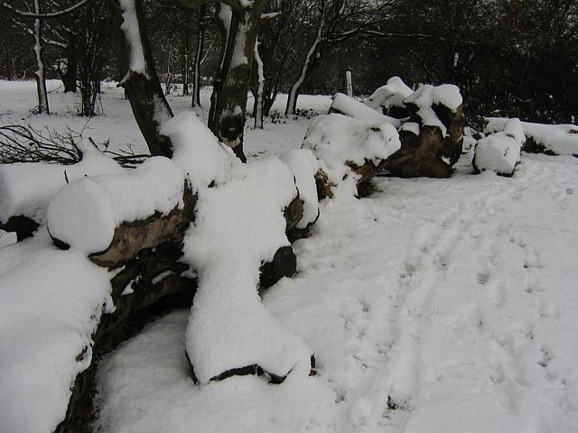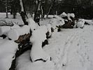 Snow plastering the trunks of trees. | The same path as on 24th January. | Snow covered bench. | More snow covered logs. | Huge snowman spotted in the garden of a nearby nursery. |