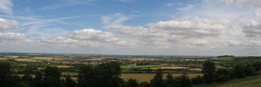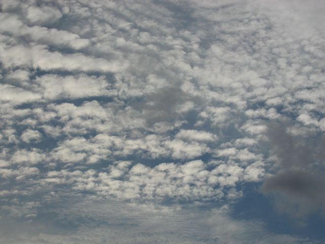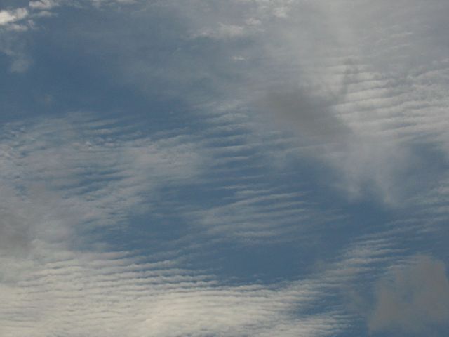 2 shot panorama from Sharpenhoe Clappers looking roughly East. | Huge cloud street with minor spreadout. | Ripples in a disintegrating altostratus layer. | Other parts of the layer form a mackerel sky. | More wavey effects in the cloud layer to the far north. |