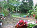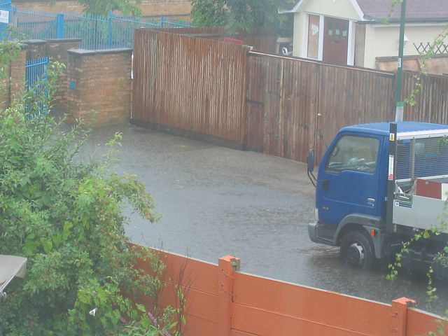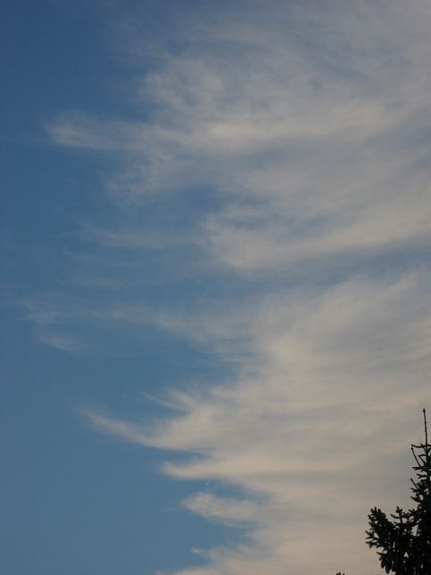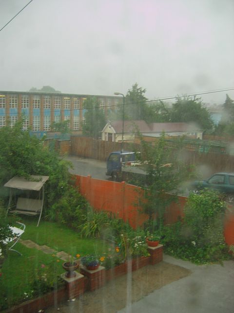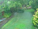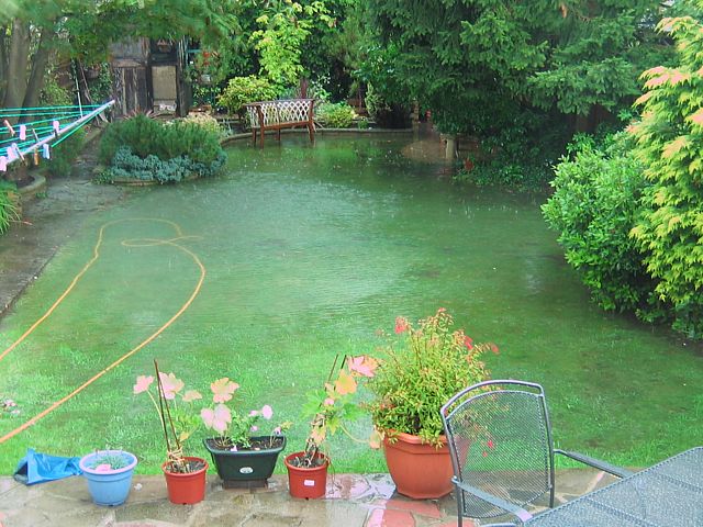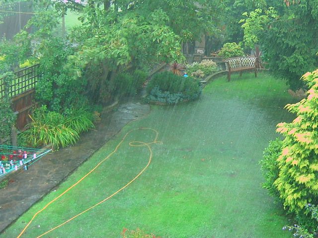 Half an hour of very heavy rain brought flash flooding to the area. | The aftermath. Almost the entire lawn submerged. Quite deep towards the pine tree. | A big X formed by two cirrus contrails at sunset. |
