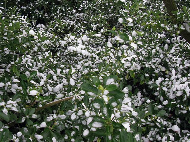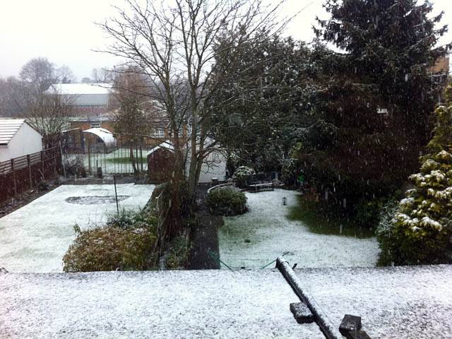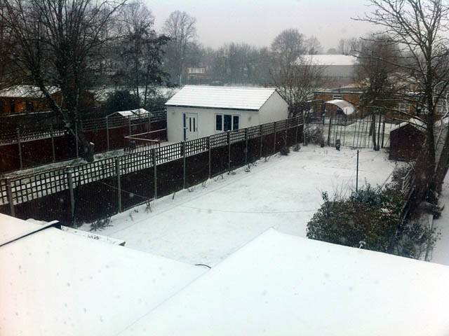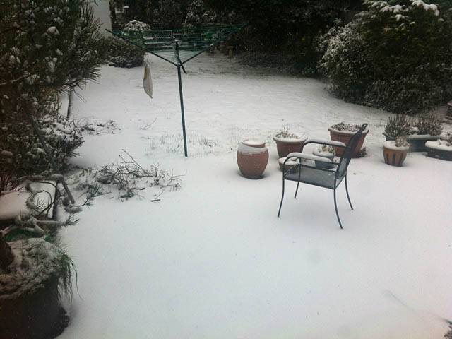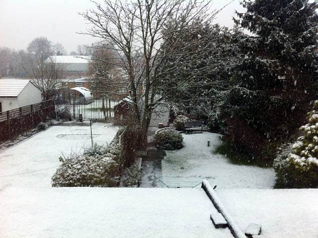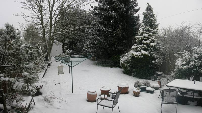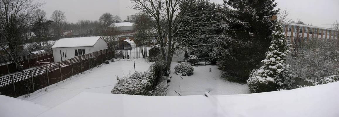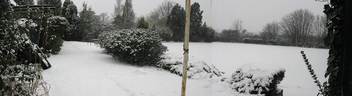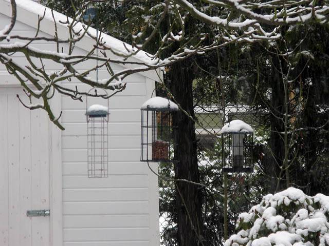 Snow covered foliage. | Kenton bowling green looking decidedly ungreen. | Snow covered garden Kenton. | Snow capped bird feeders. | Panoramic snowy view from my bedroom window. |