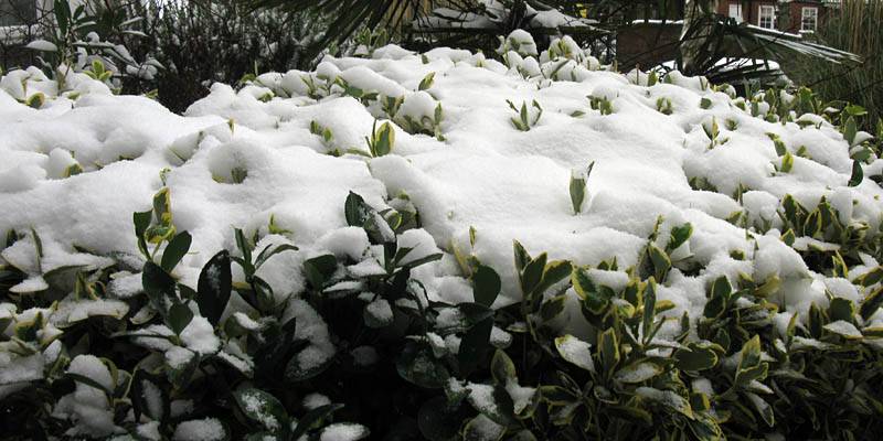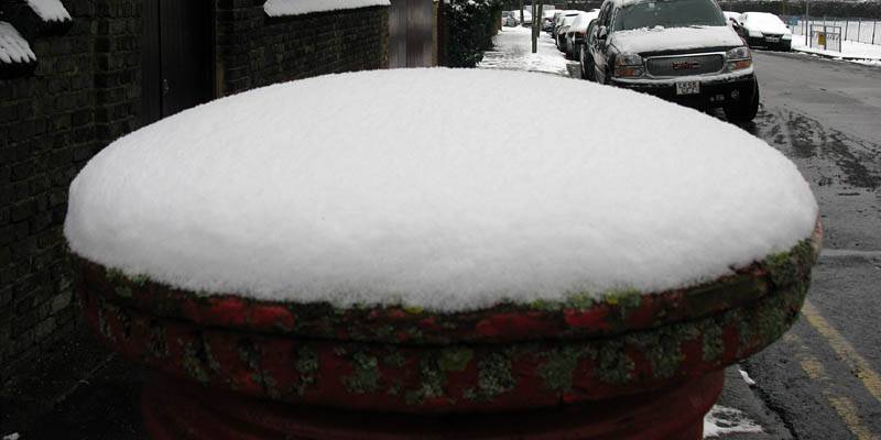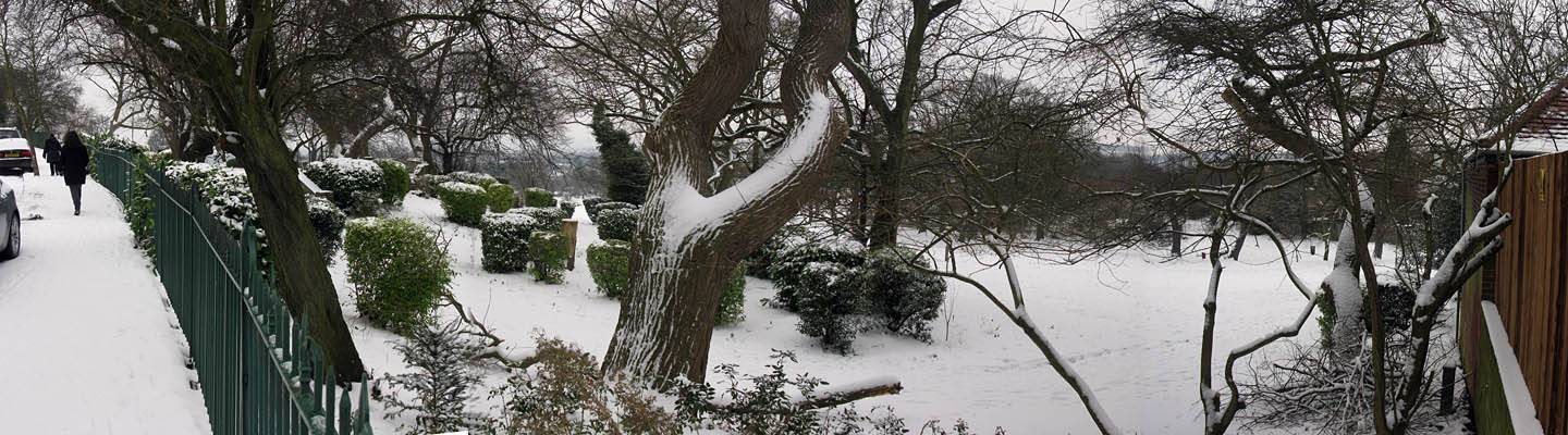 Looks like a teaspoon of sugar. | Snow covered foliage. | Snow covered post box. | Panorama of Sunny Hill Park, Hendon from Sunningfields Crescent. |